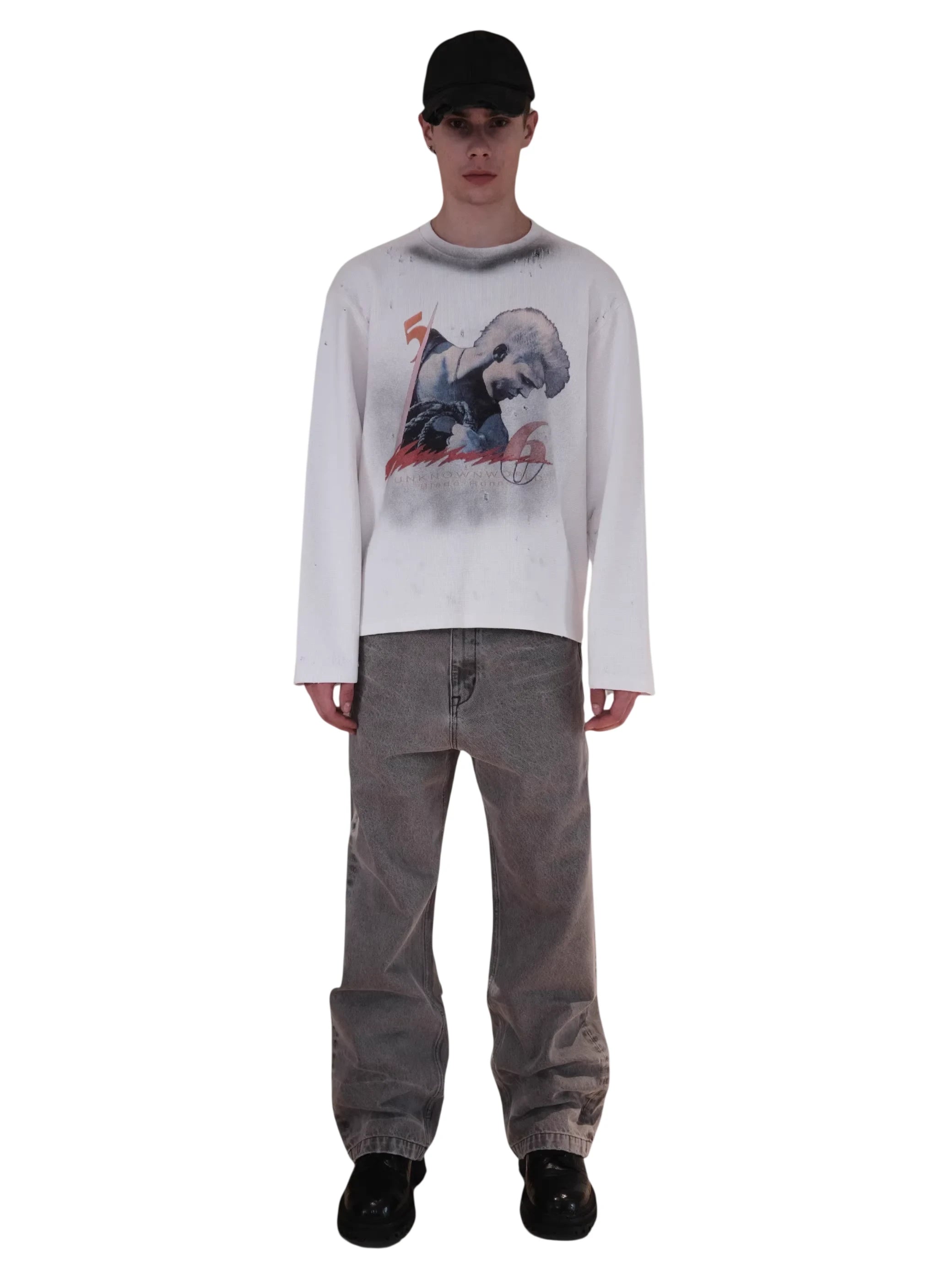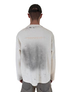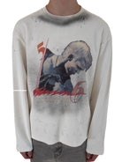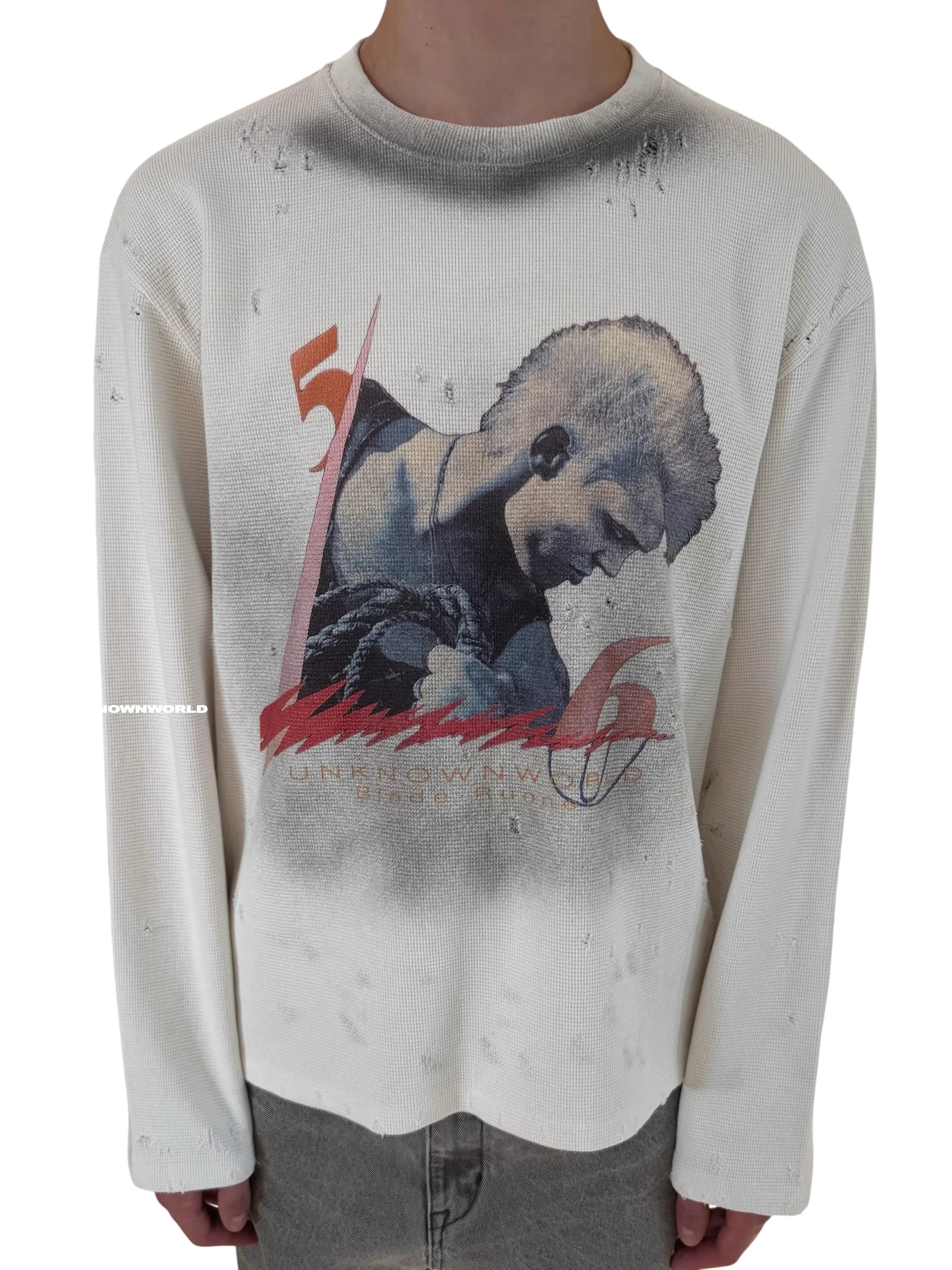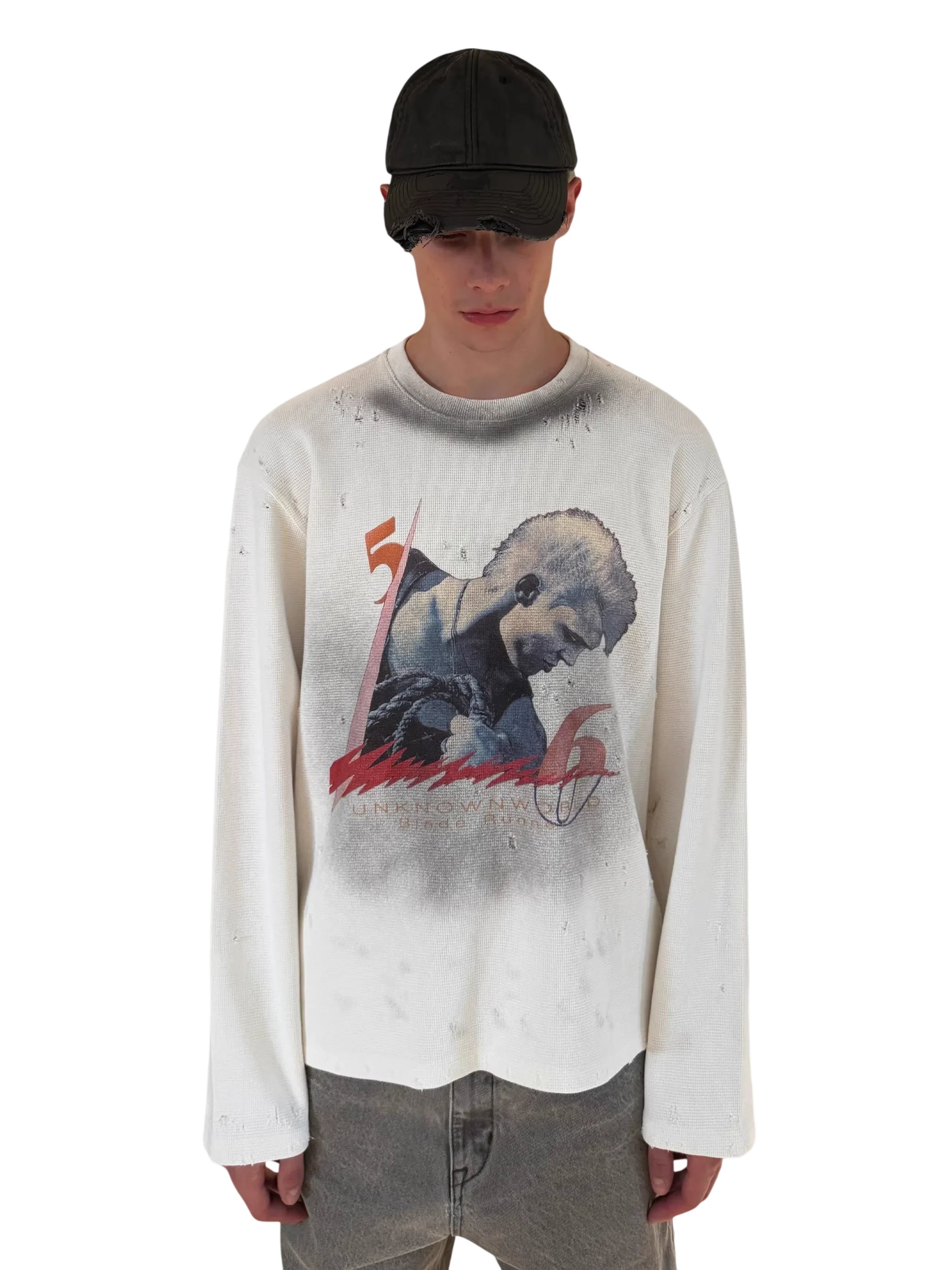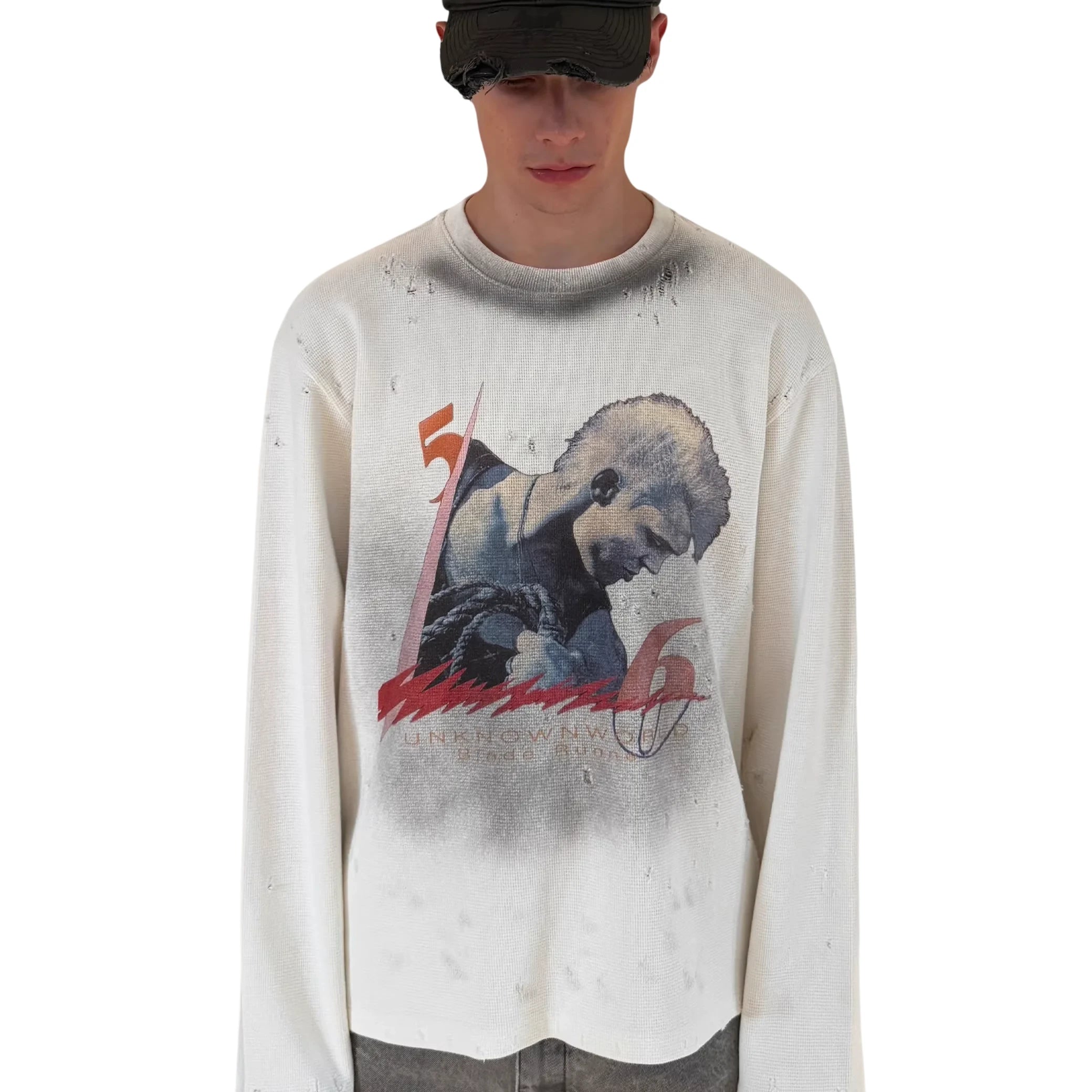 This men's lightweight pullover sweatshirt features a vintage-inspired design with an oversized fit and a waffle-textured fabric. The off-white or light gray color is complemented by intentional distressing, including small holes and frayed edges, for a worn-in look. A bold graphic print on the front showcases a stylized male figure with a mohawk and boxing gloves, alongside graffiti-like strokes and the text “UNKNOWNWORLD.” Perfect for casual streetwear styling.