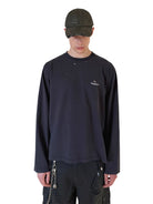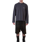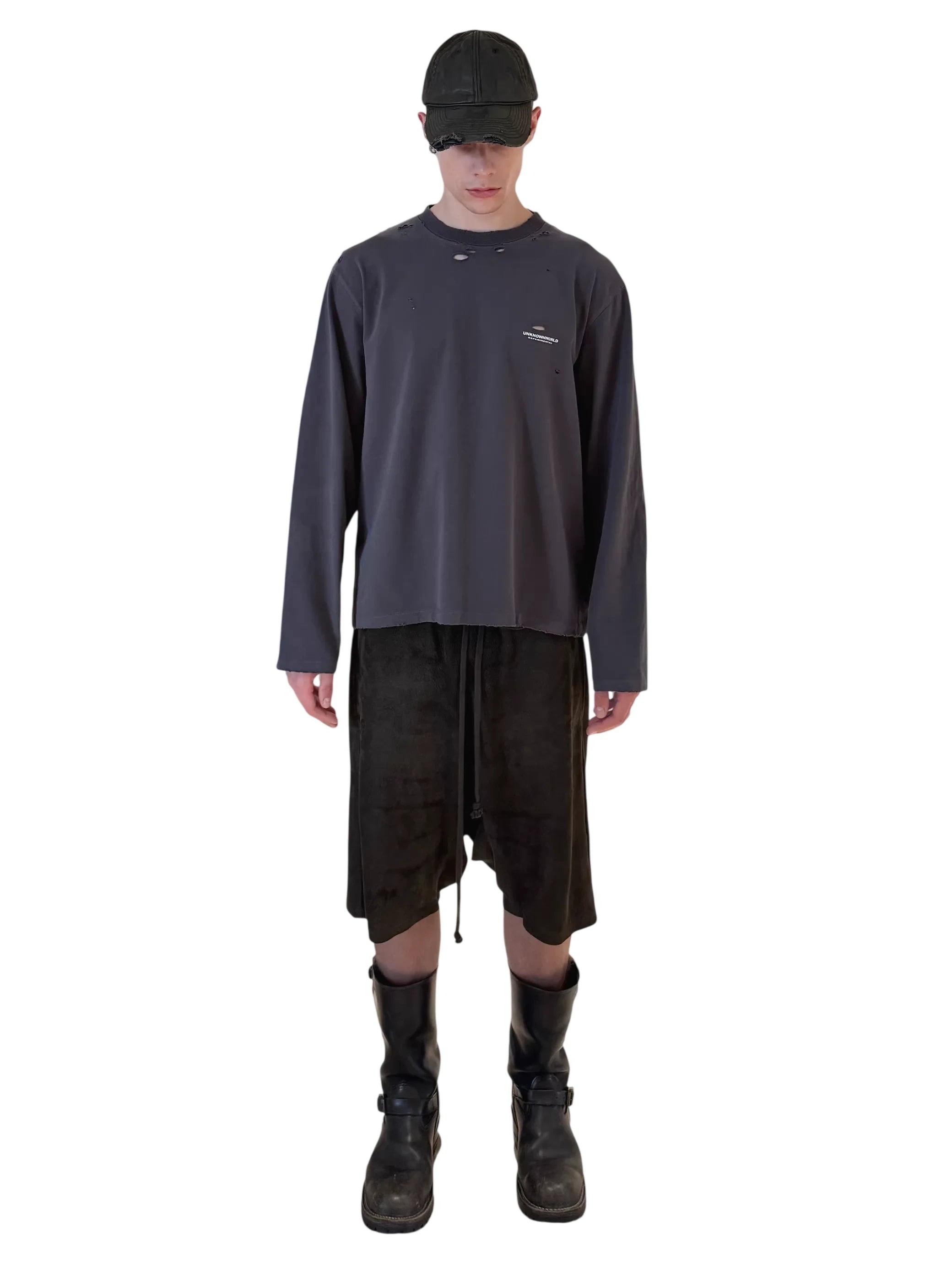 This men's long sleeve t-shirt features a washed and brushed fabric for a soft touch and lived-in feel. Designed with intentional distressing around the collar and chest area, the shirt embraces a grunge-inspired aesthetic. A small printed logo on the left chest adds a subtle streetwear element. The oversized fit offers a relaxed silhouette, ideal for layered styling or standalone wear.