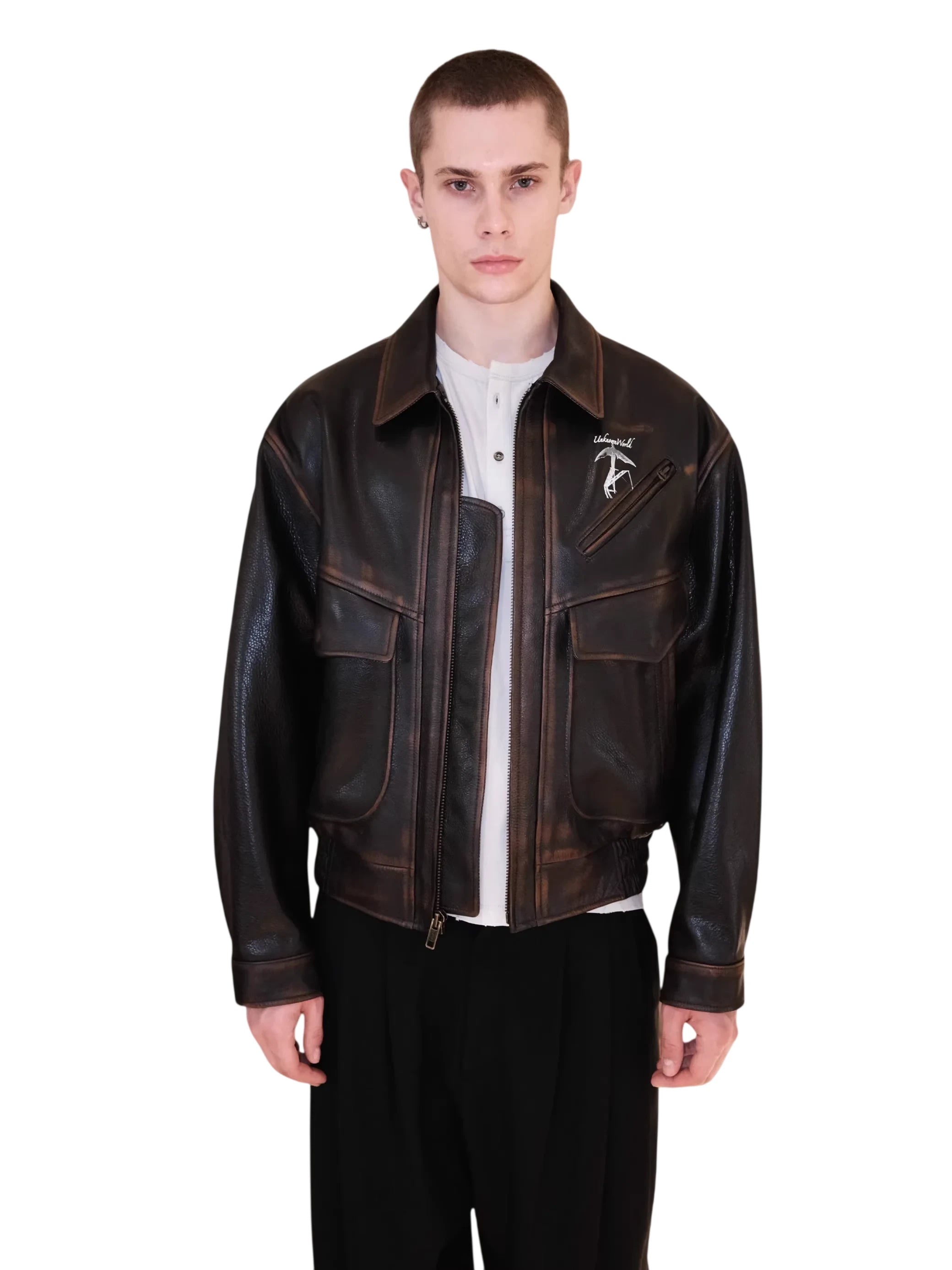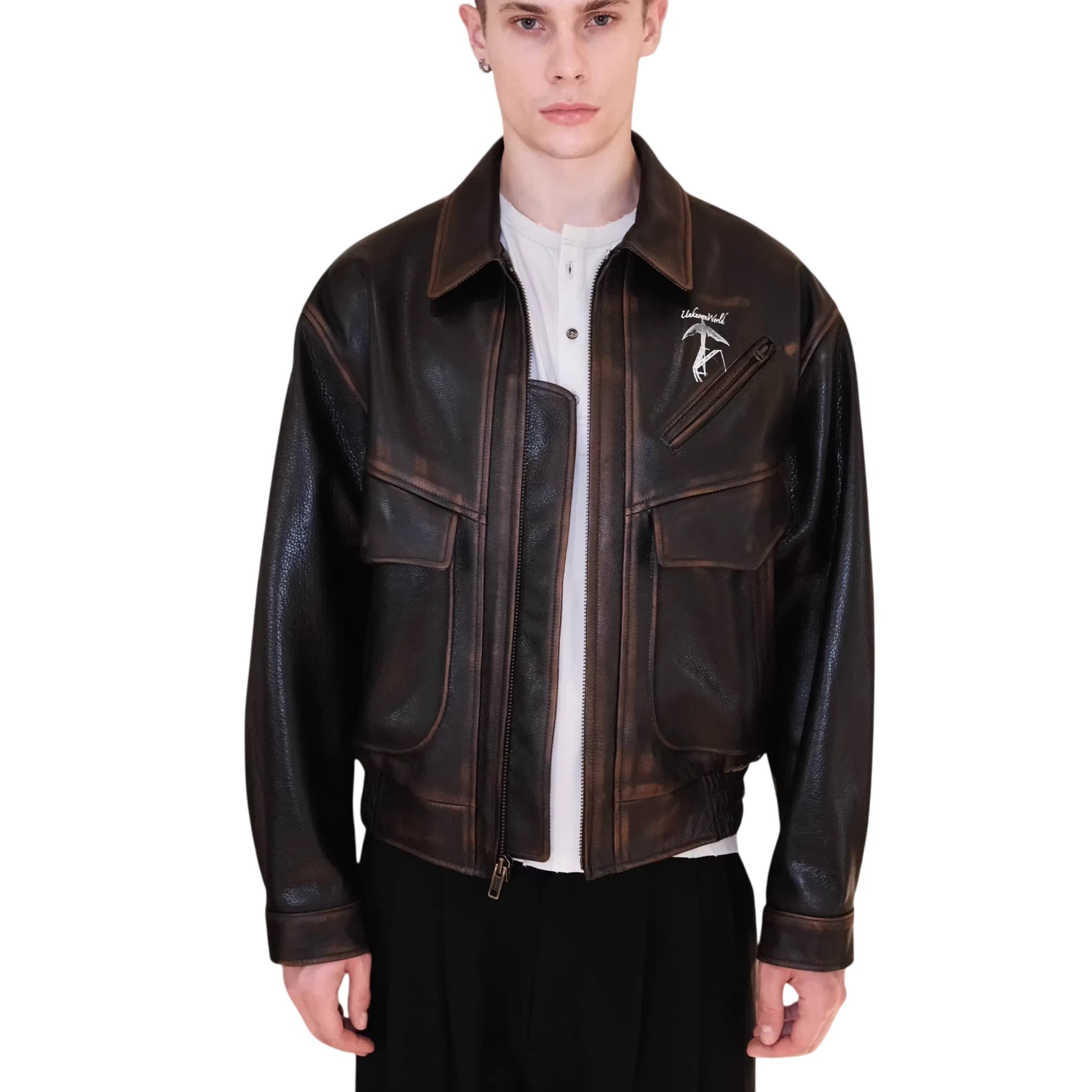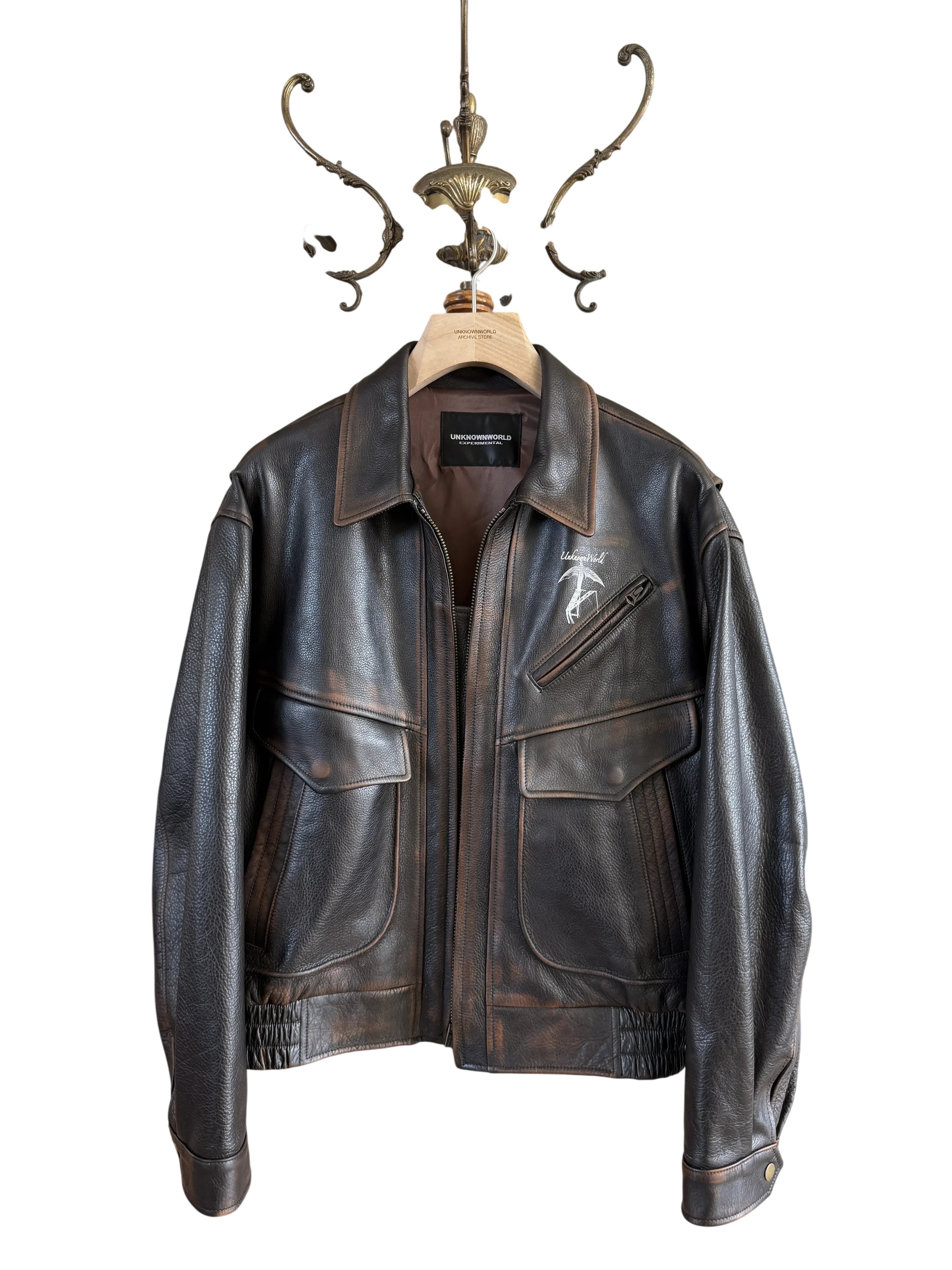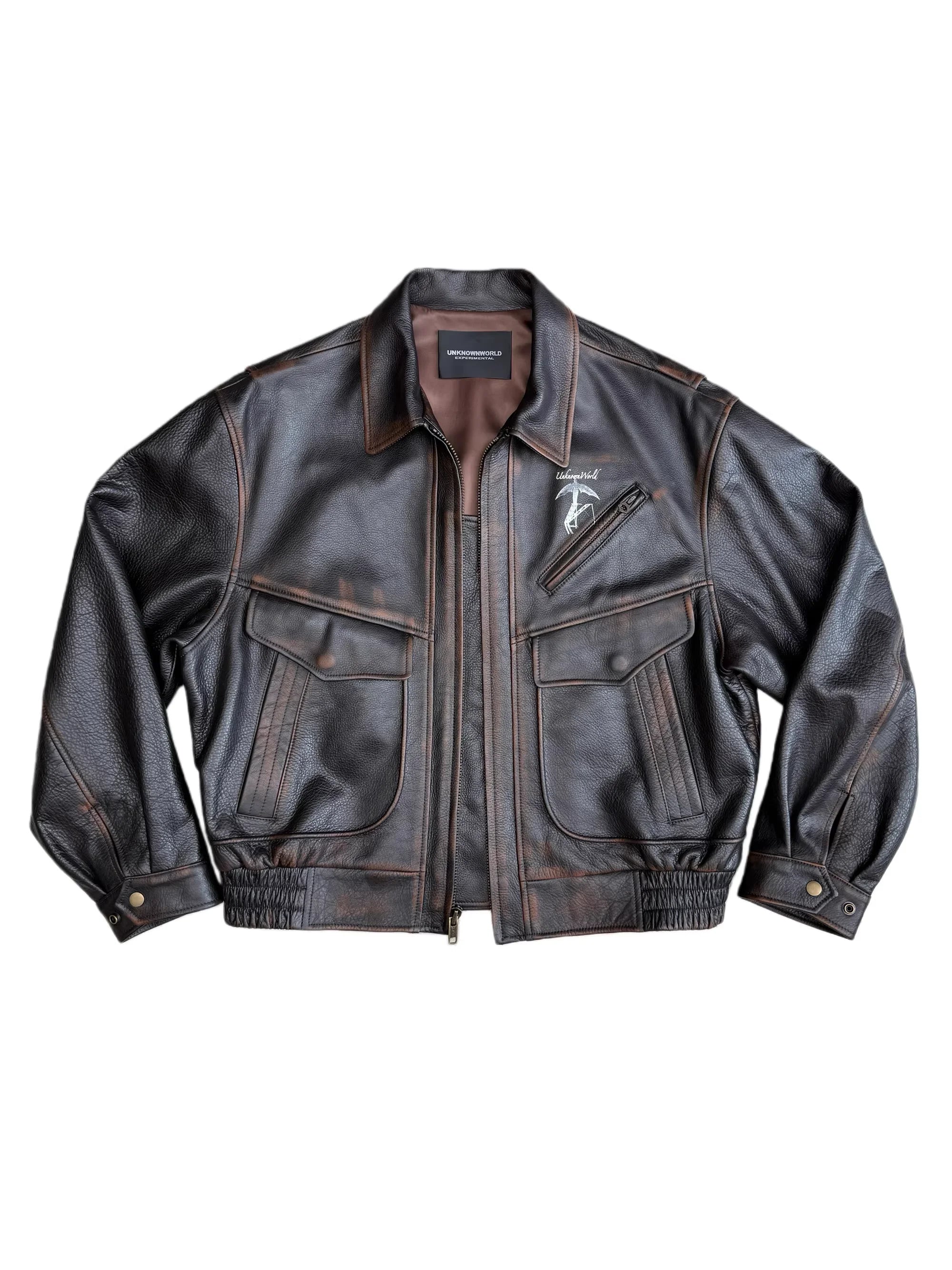 Elevate your outerwear style with this hand-rubbed distressed leather flight jacket designed for men. Crafted from top-grain leather, the jacket features a rugged, vintage-inspired finish that exudes character. It includes a front zipper closure, two spacious flap chest pockets, and an additional zippered chest pocket with a printed graphic that reads 'Unknownworld' alongside an abstract motif. The structured silhouette is complemented by a wide collar, while the interior is comfortably lined, making it ideal for cool-weather layering.