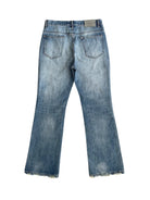 The medium wash features subtle fading on the thighs and knees for a vintage-inspired look, while the frayed hems add a relaxed, casual edge. Complete with a five-pocket layout, front zipper and button closure, belt loops, and visible seam stitching for added structure, these jeans are a versatile addition to any wardrobe.