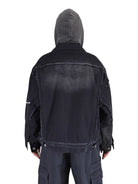 This men's oversized denim jacket features a deconstructed design with raw edge seams and prominent frayed stitching. The patchwork construction and washed finish create a rugged, streetwear-inspired aesthetic. Silver exposed buttons and layered fabric details give it a bold, urban appeal, ideal for contemporary casual styling.