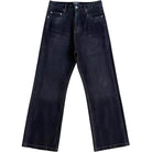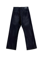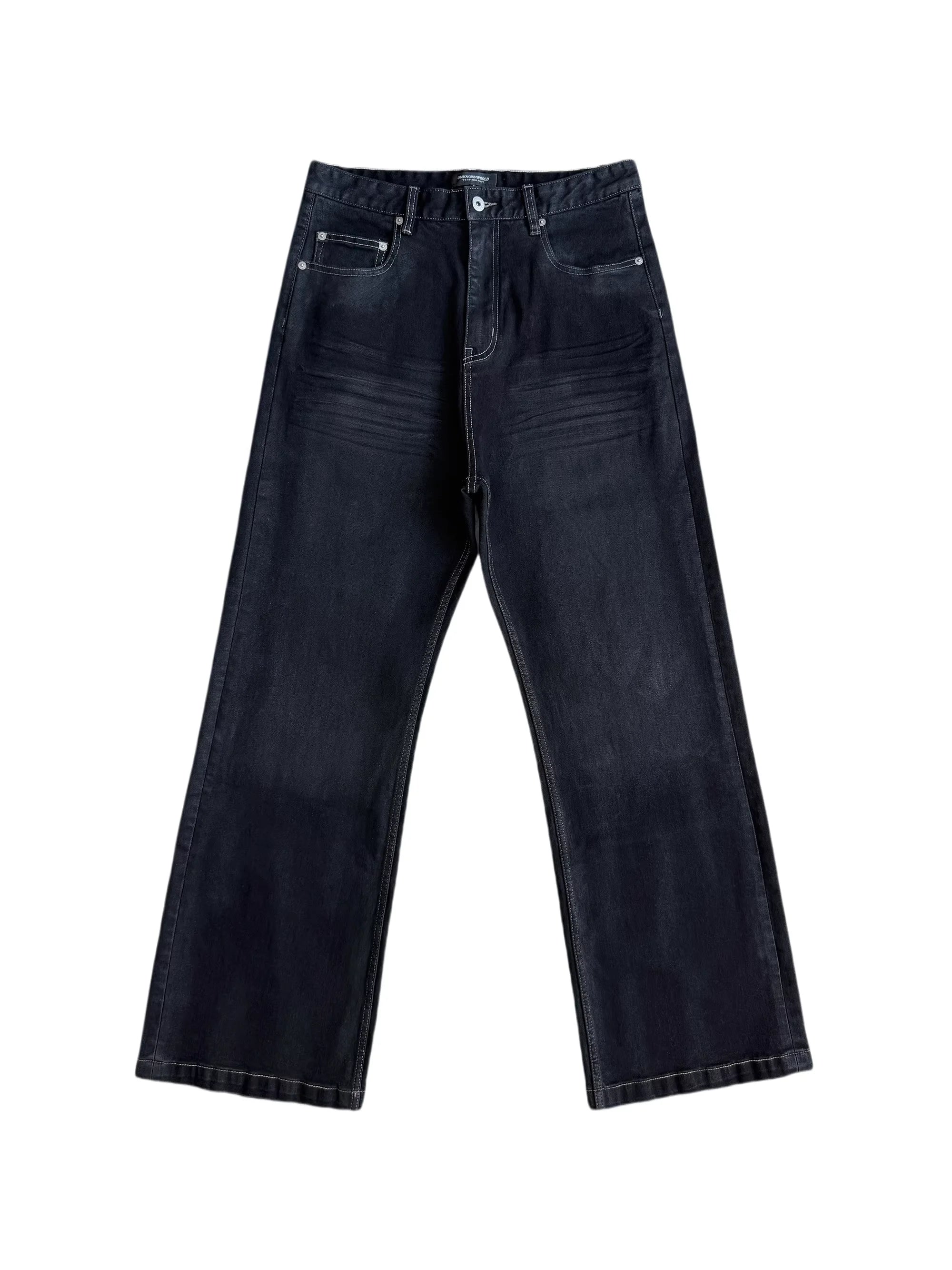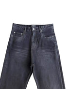 These men's jeans feature a stylish dark washed black finish with a high-rise waist and wide-leg silhouette for a relaxed, contemporary fit. Designed with classic five-pocket styling, they include two front pockets, two back pockets, and a small coin pocket. Subtle fading and whiskering add refined texture, while silver-toned rivets and a button-zip closure complete the timeless look. Double-stitched seams offer enhanced durability.