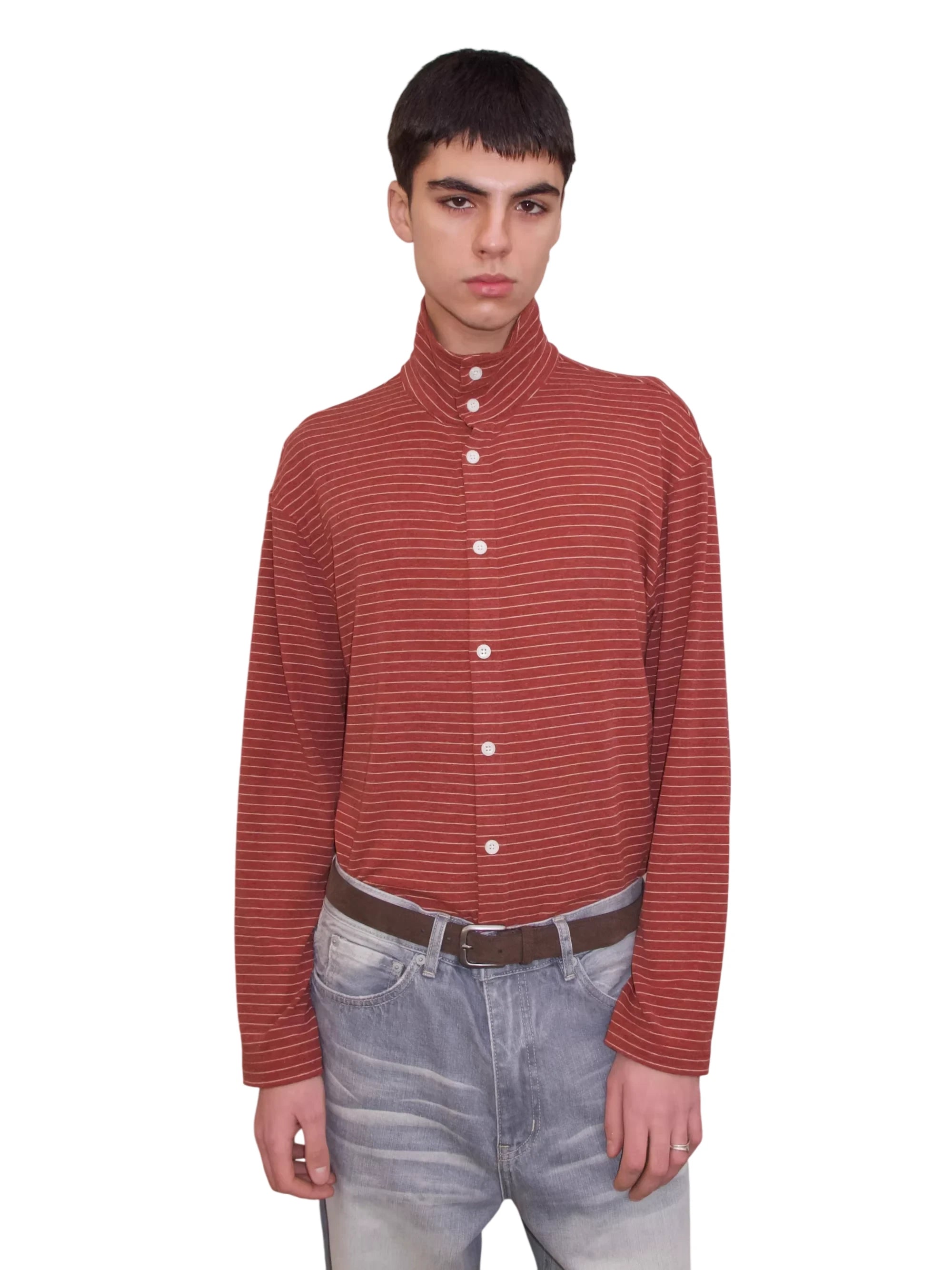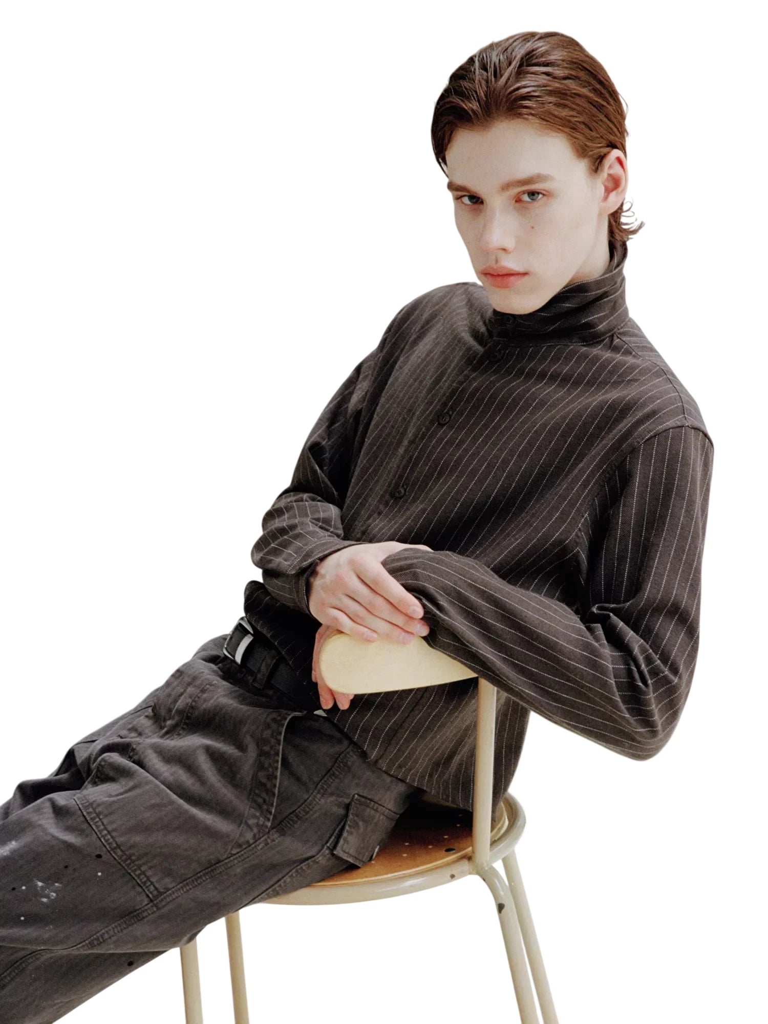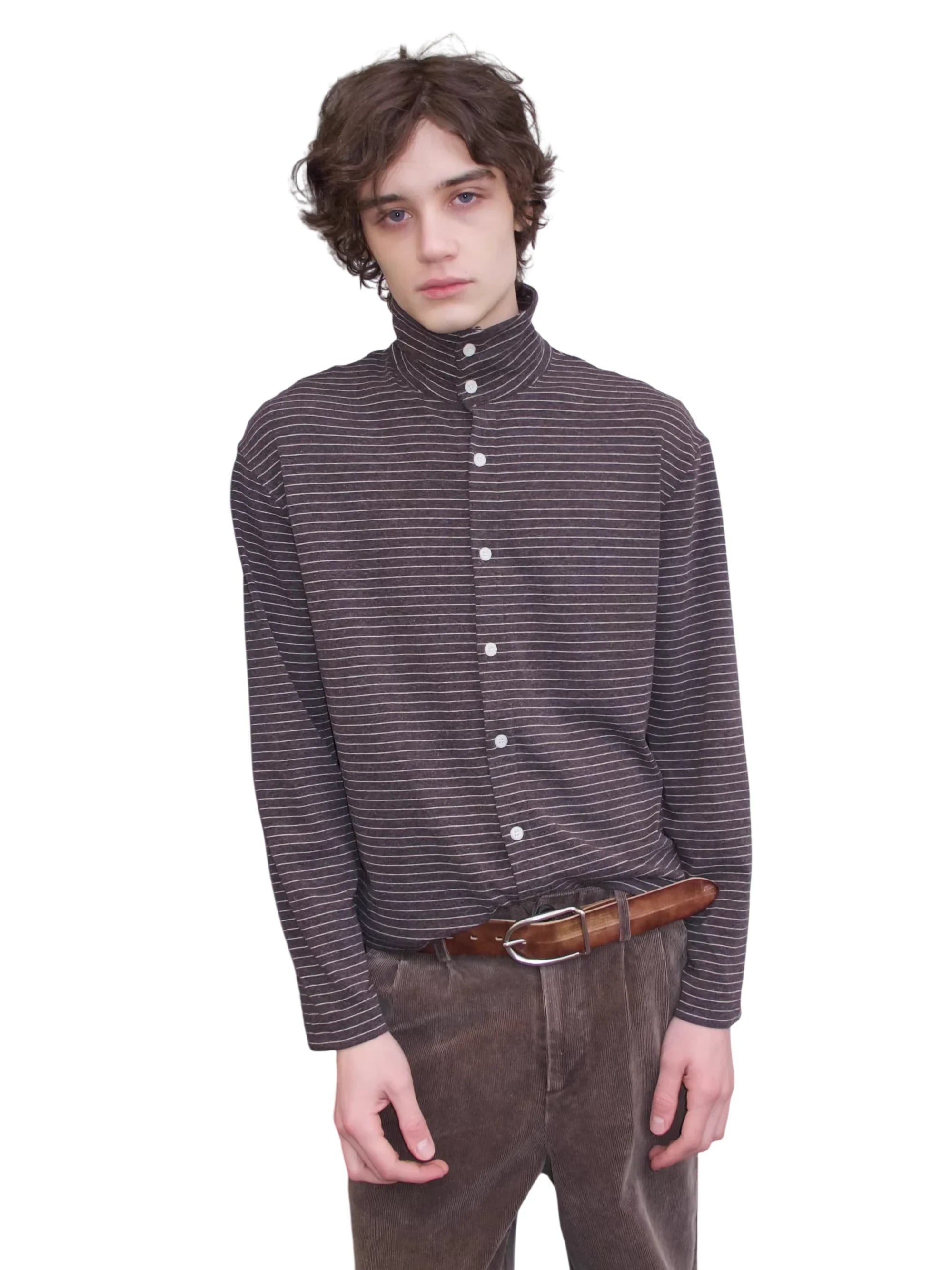 VLABMADE Men's Striped Wool Tencel Button-Up Turtleneck Cardigan