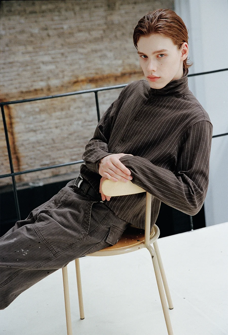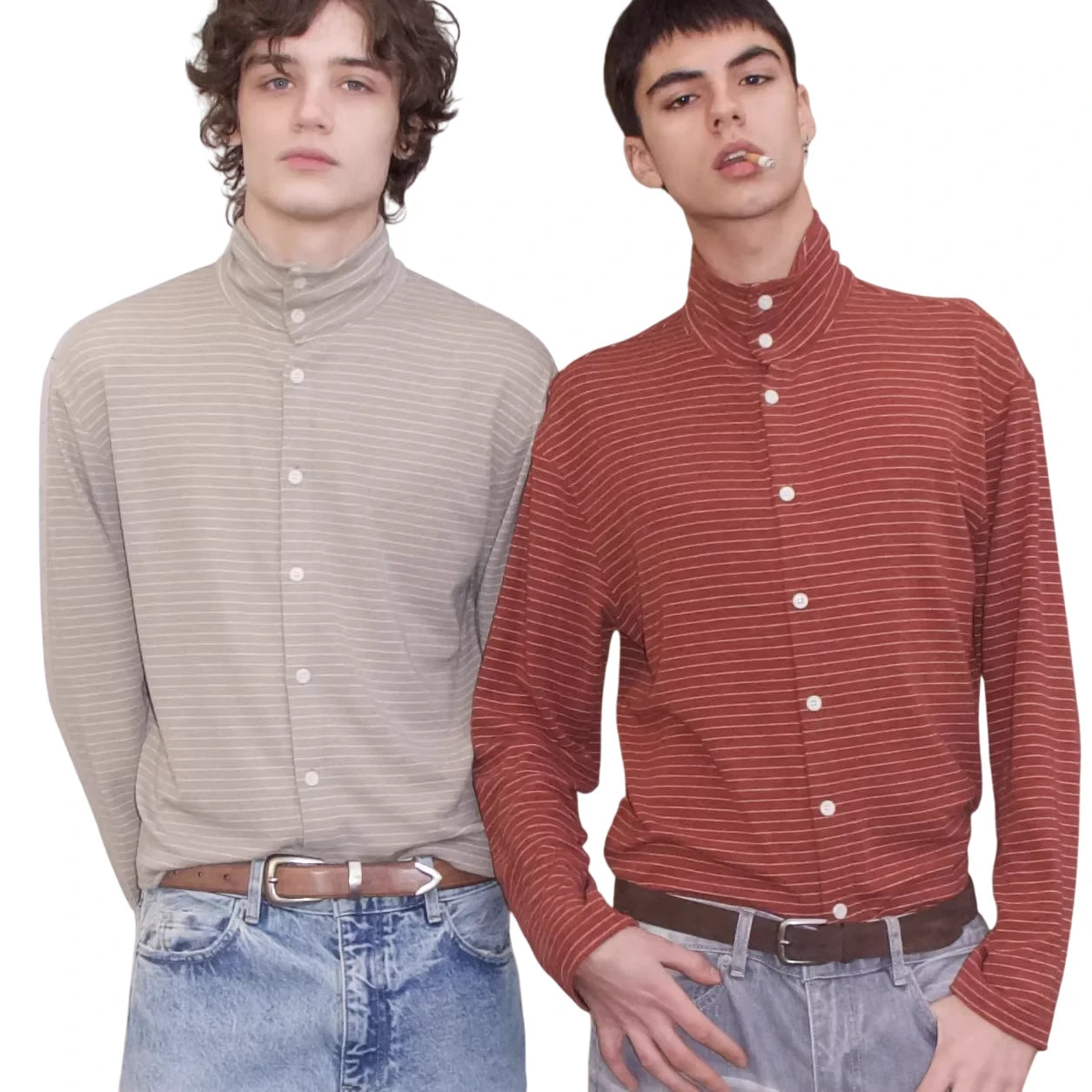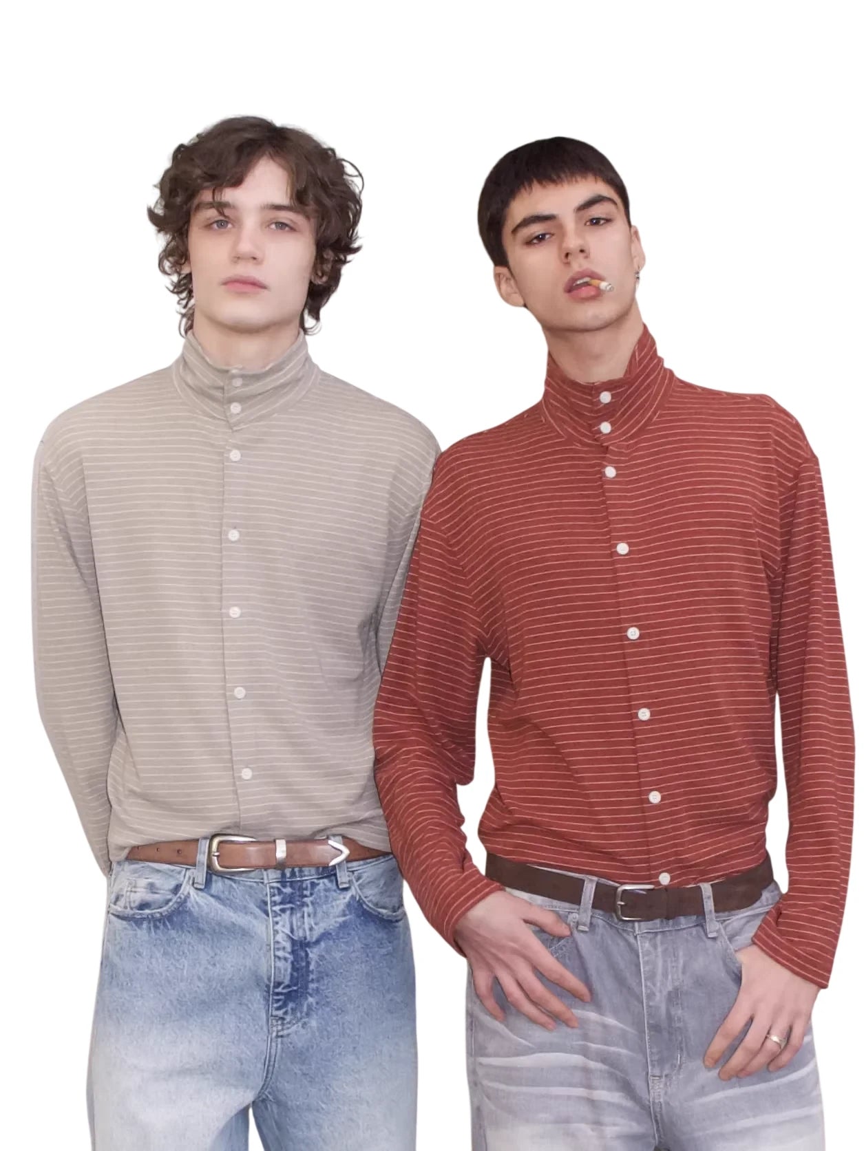 VLABMADE Men's Striped Wool Tencel Button-Up Turtleneck Cardigan