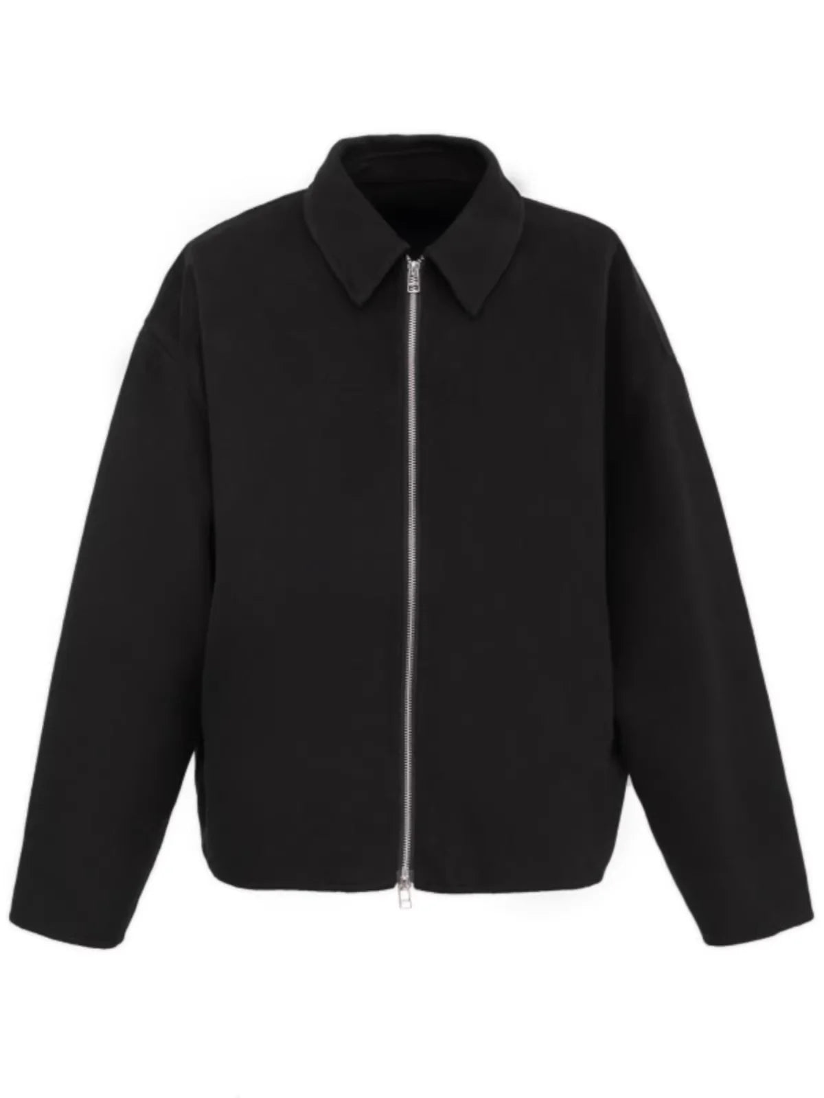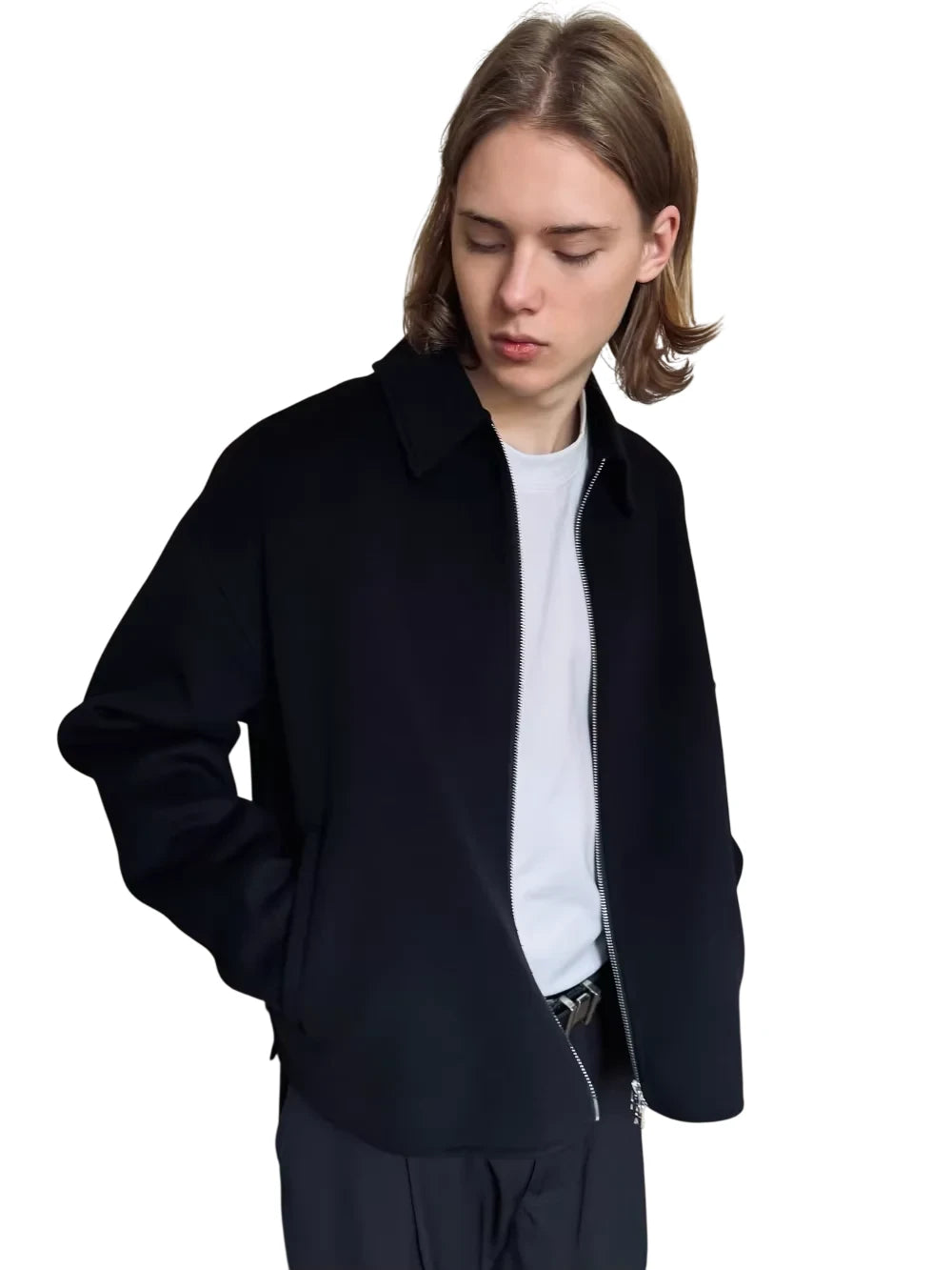 This minimalist black jacket for men is crafted from 100% wool, offering a structured yet relaxed fit with a short, boxy silhouette. It features a classic shirt collar, a clean zip-up front, and subtle side pockets, making it a timeless addition to any wardrobe. Perfect for layering over casual or smart-casual outfits.