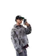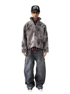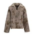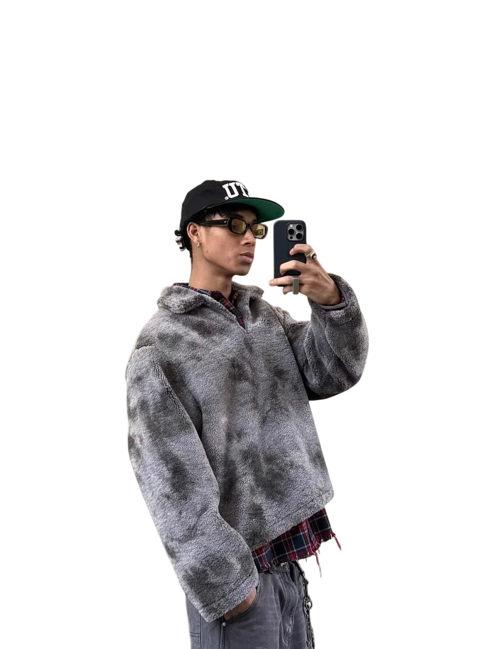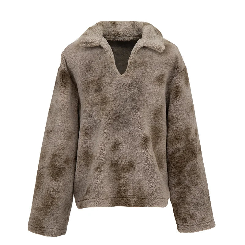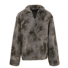 This vintage-inspired fleece pullover features a soft, tie-dye pattern in muted moss tones and a relaxed, loose fit. Designed with a cozy v-neck and fuzzy texture, it's perfect for layering over casual shirts like plaid or flannel.