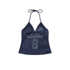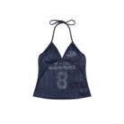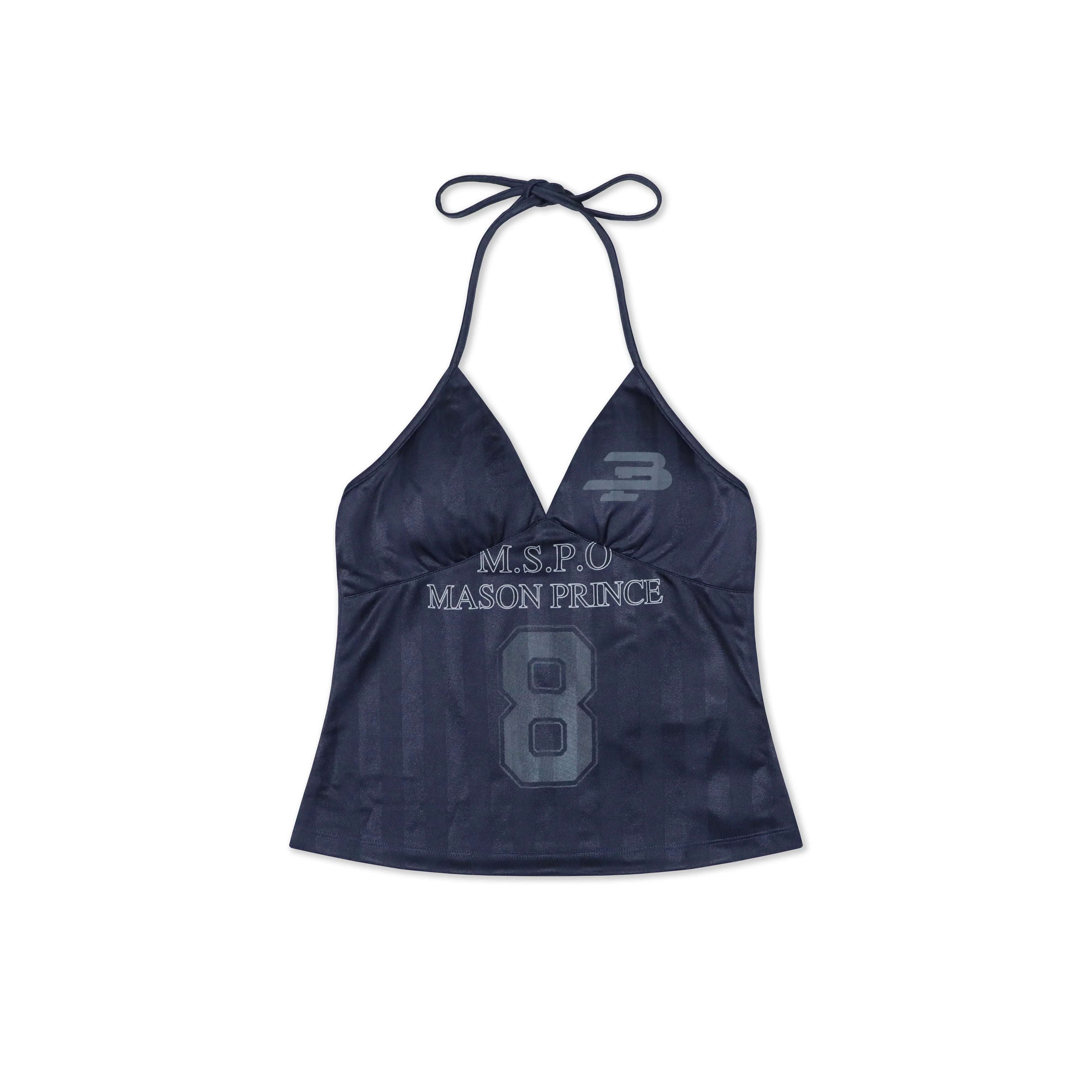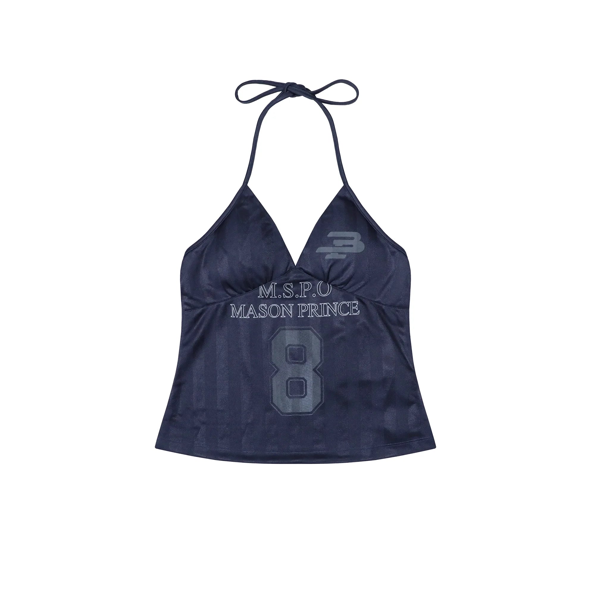 The bold varsity-style print on the front includes the text "M.S.P.O MASON PRINCE," along with prominent numbers "8" and "3", bringing a unique, football jersey-inspired flair. Crafted from a lightweight, slightly glossy synthetic blend, this halter top combines comfort with seasonal trend appeal.