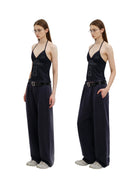 This stylish women's halter top is a versatile piece perfect for layering during the autumn and winter seasons. Designed in a deep navy blue with subtle vertical stripes, it features a plunging neckline and a tie-back neck closure for a flattering, sporty silhouette.