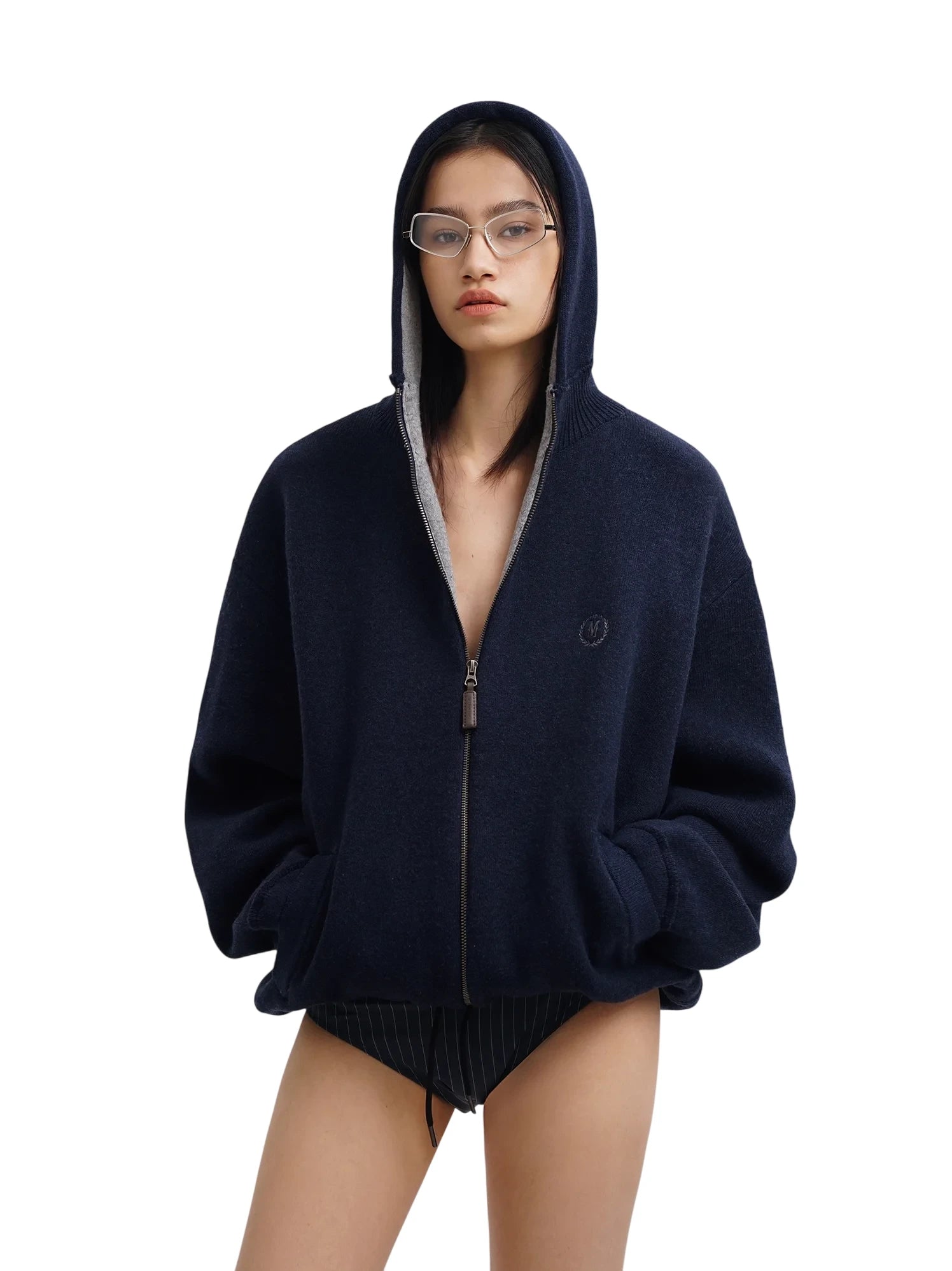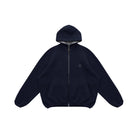This women's zip-up hoodie is crafted from a structured double-sided cashmere fabric, offering both warmth and comfort. It features a ribbed stand collar and a soft contrast inner hood lining for added style and functionality. The oversized fit and drawstring hem provide a relaxed silhouette, while side pockets add practicality. Finished with a subtle embroidered logo on the chest, this hoodie is perfect for layering in cooler weather.