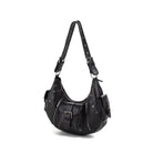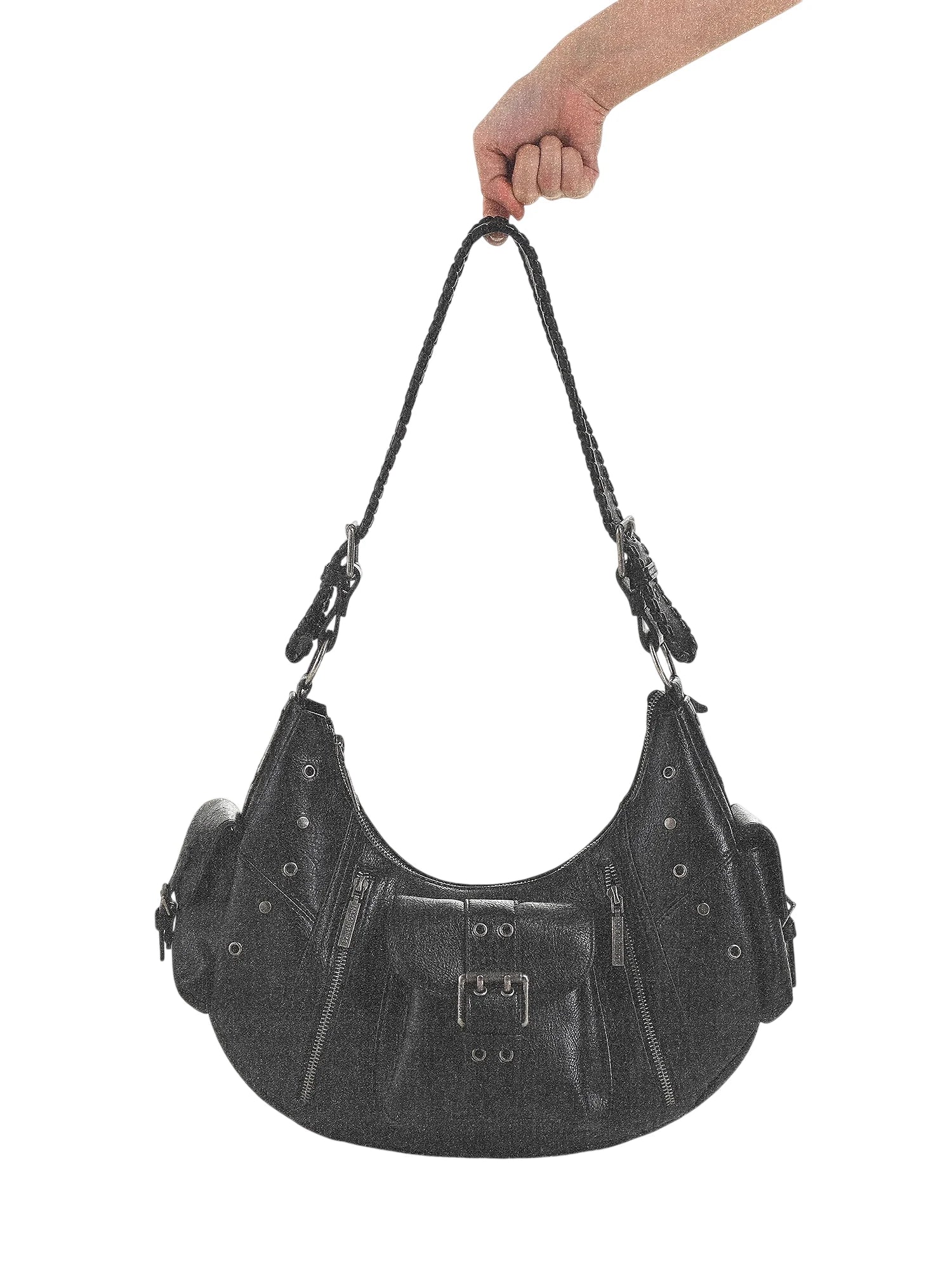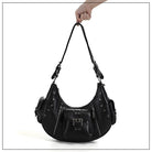 This women's crossbody motorcycle bag features a sleek crescent-shaped silhouette crafted from high-quality glossy faux leather. Designed for both style and function, it showcases multiple metallic zippered compartments, a central flap pocket with a decorative buckle, and studded detailing for an edgy urban look. The braided shoulder strap adds a unique touch, while side pockets enhance practicality. Perfect for casual or streetwear outfits, this fashion-forward bag combines utility with contemporary appeal.