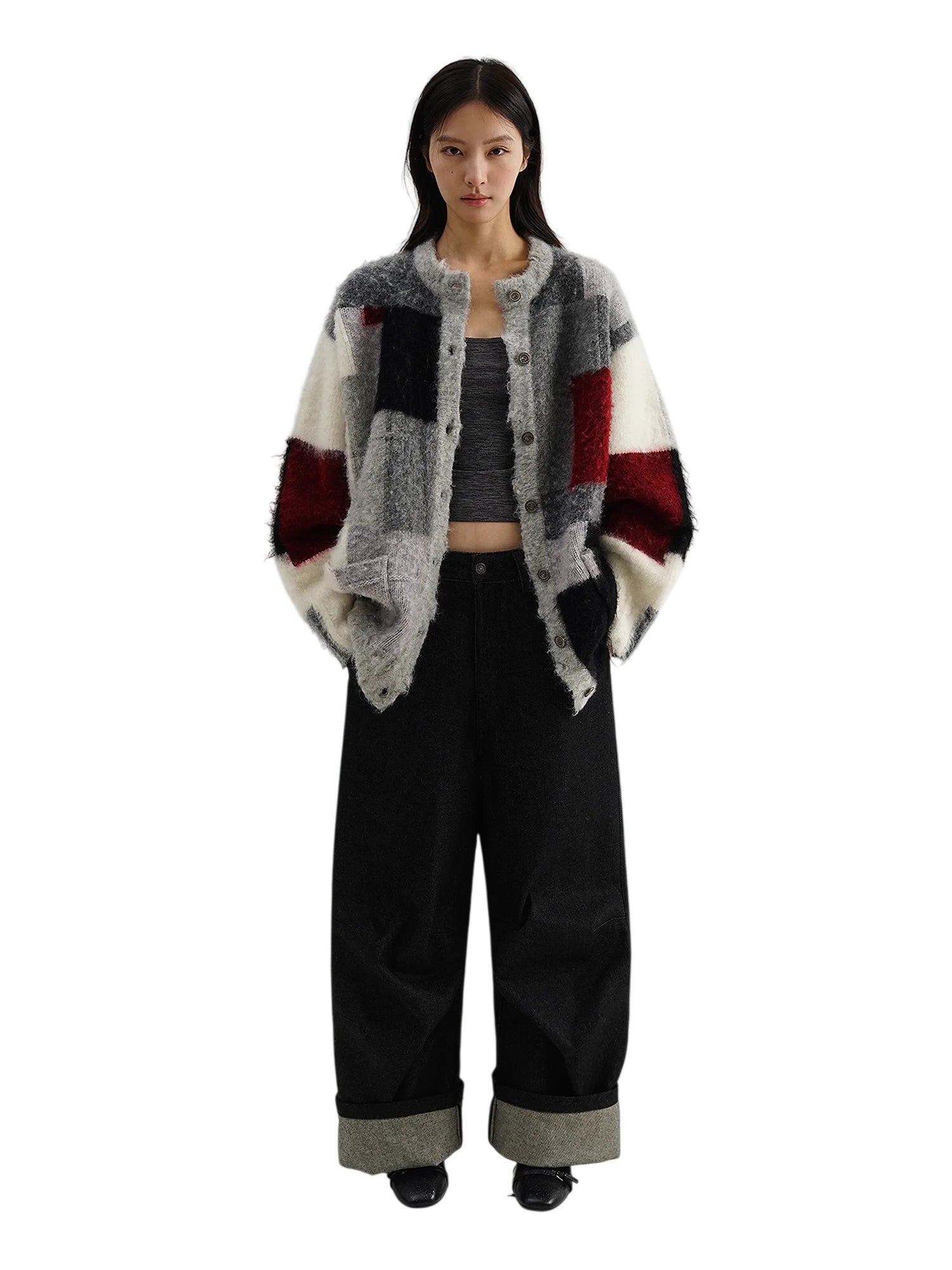 Stay cozy in style with this limited edition women's cardigan, featuring a soft brushed wool blend for ultimate warmth and comfort. The oversized fit showcases an eye-catching checkered patchwork design in bold hues of grey, black, red, and white. Complete with a full button-down front and practical front pockets, this artistic knit pairs effortlessly with casual or layered looks for the colder season.