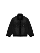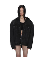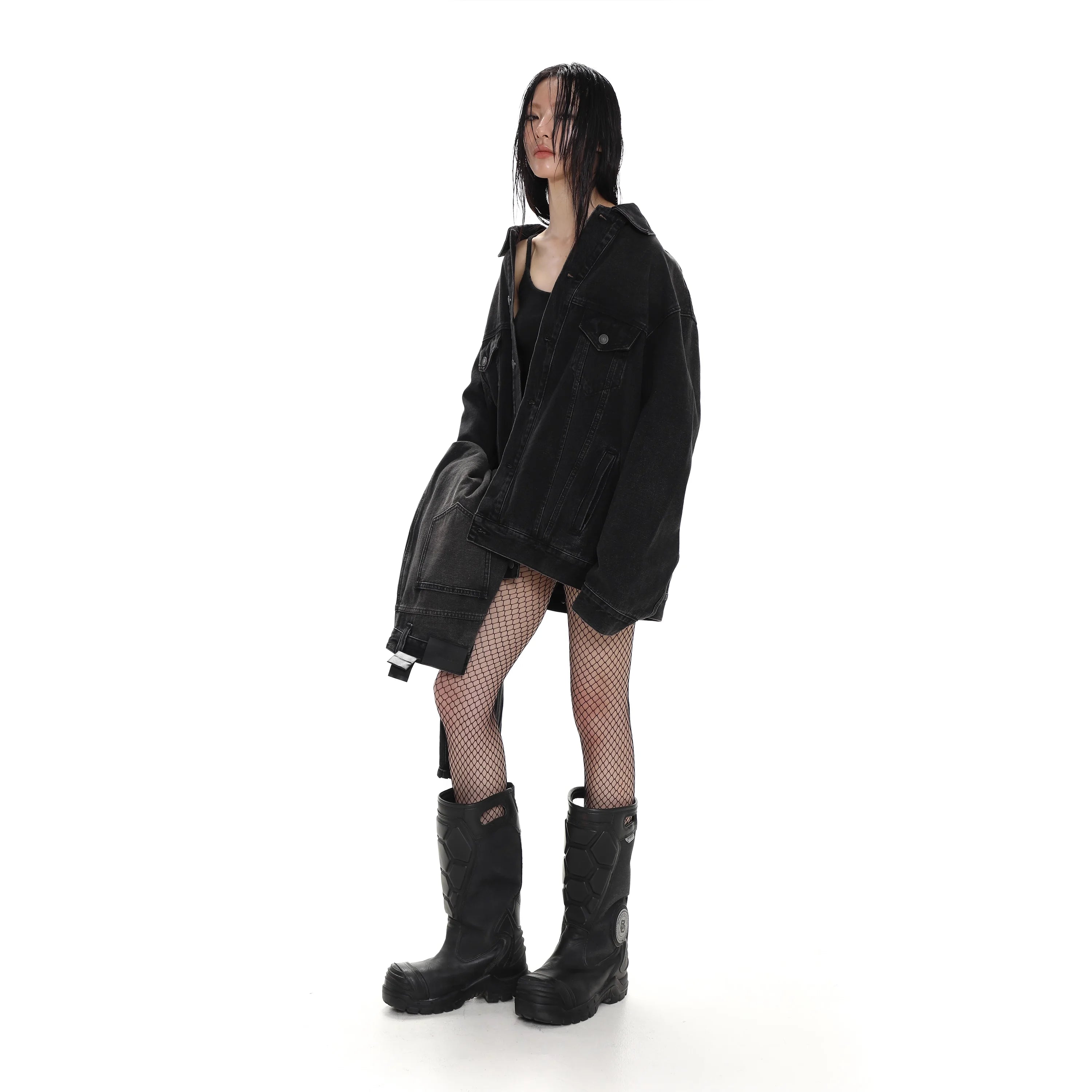 This women's oversized black denim jacket features a softened washed finish and bold reverse hem detailing for a modern edge. Designed with classic flap chest pockets and pronounced stitching, this jacket blends streetwear with an alternative fashion aesthetic. Its structured lapel and roomy silhouette make it a stylish layering piece for cooler seasons.