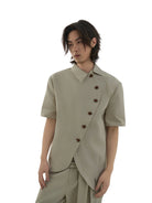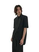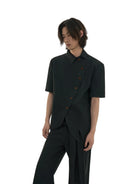 This men's short-sleeve shirt features a striking asymmetrical design with a diagonal front overlap for a modern, deconstructed look. Crafted from textured black fabric, it offers a refined structure suitable for both casual and semi-formal occasions.