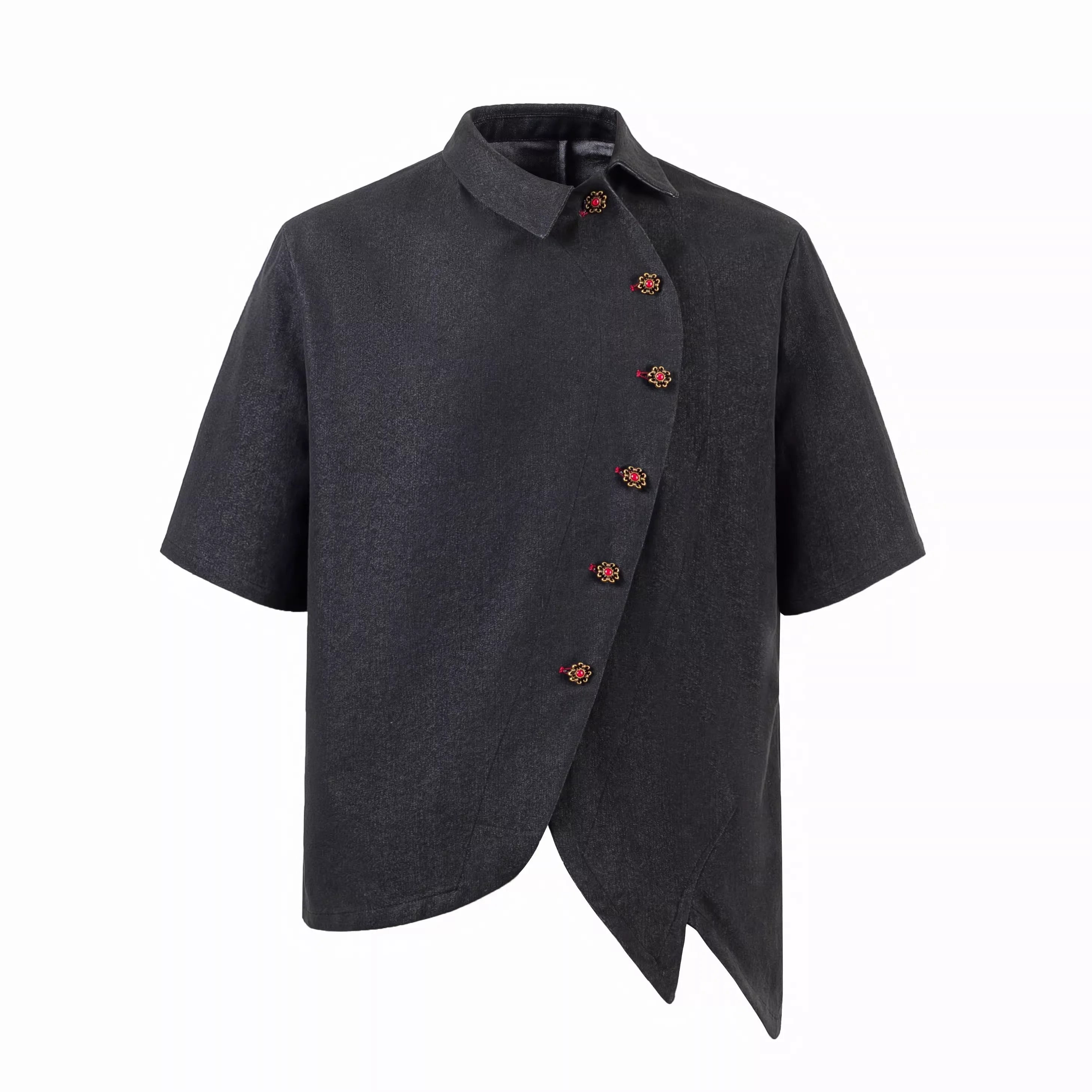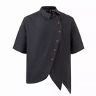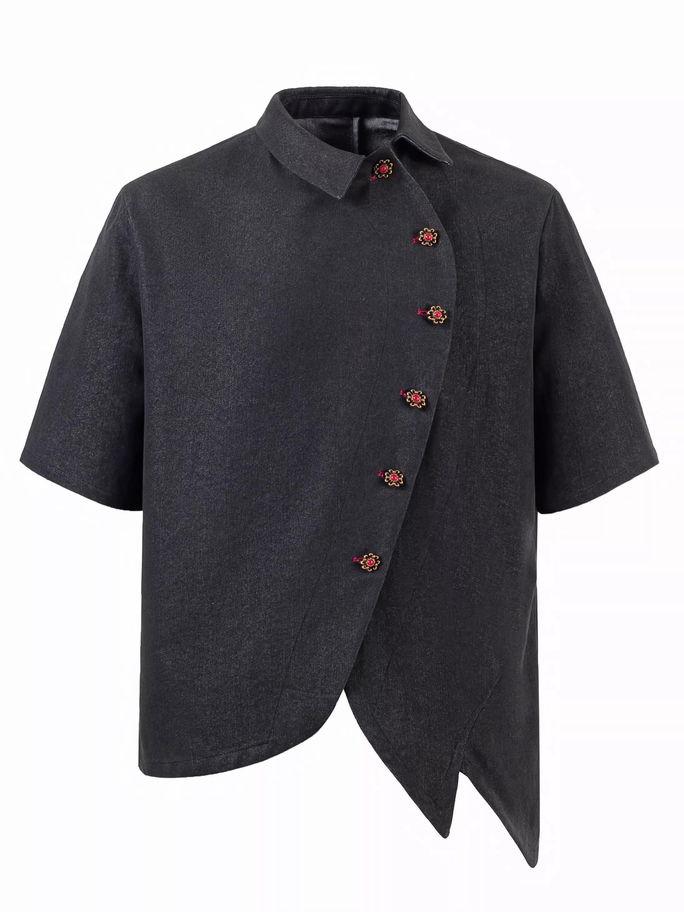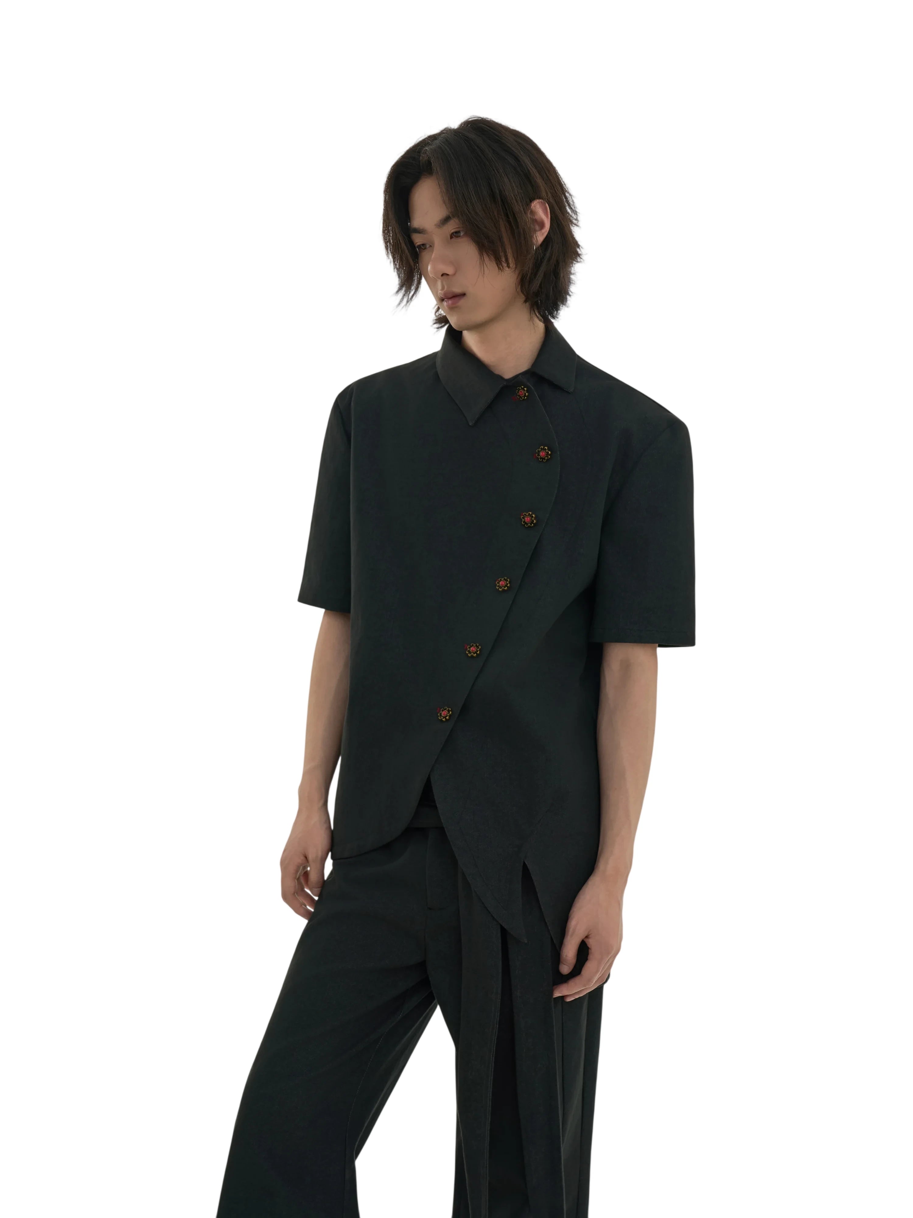 Y OFFICIAL Asymmetrical Black Short-Sleeve Shirt with Floral Buttons
