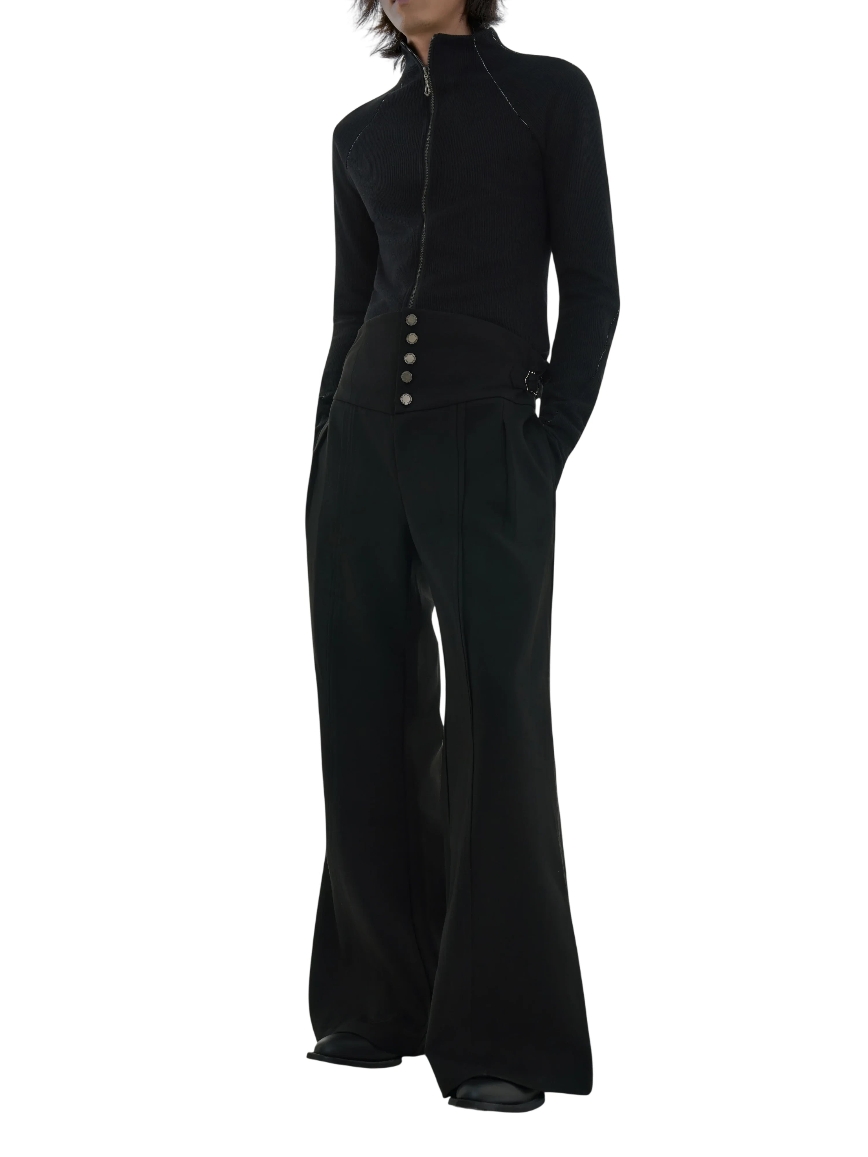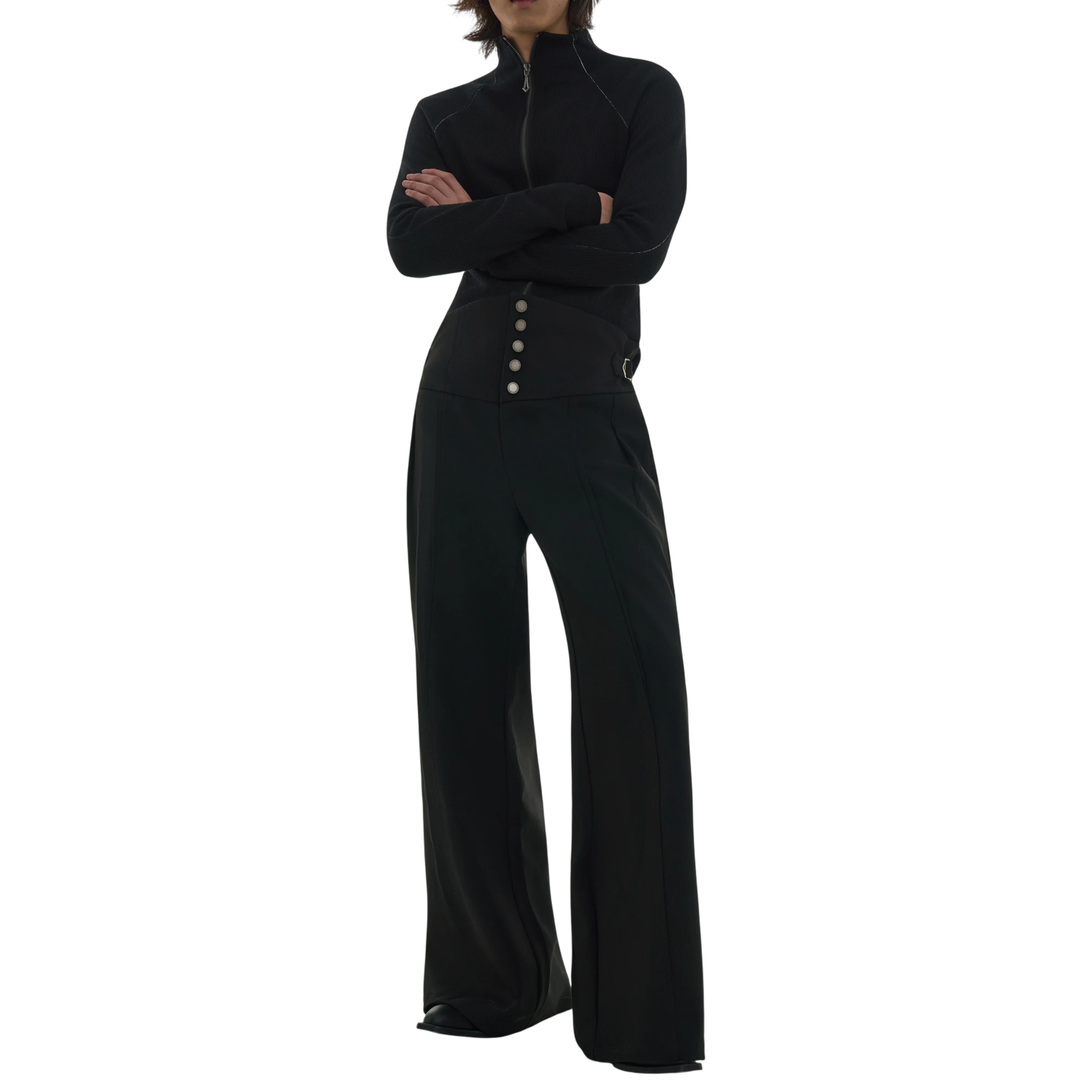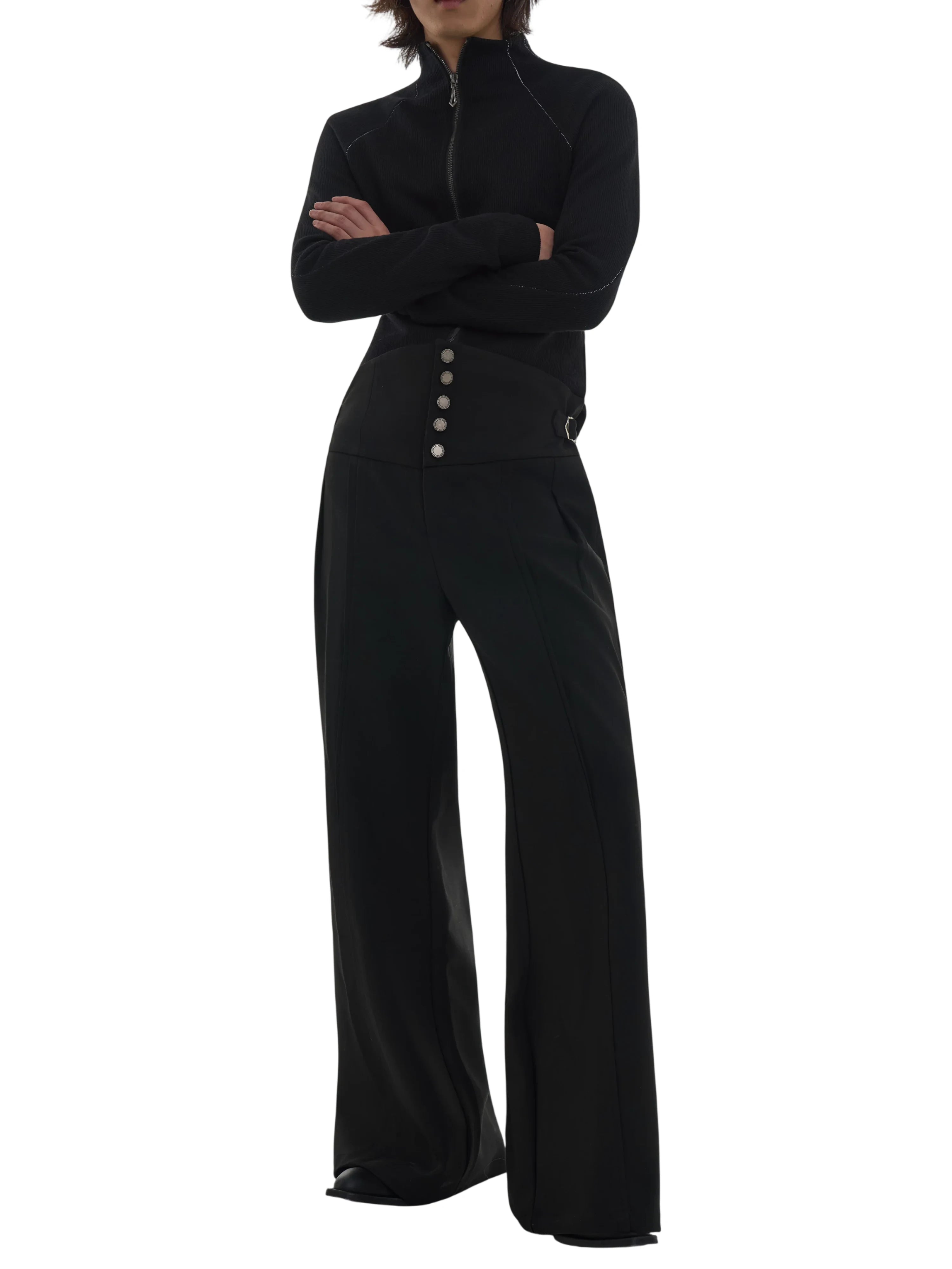 Elevate your wardrobe with these high-waisted wool blend trousers, designed in a flattering A-line silhouette with a slight flare. Featuring pleated detailing and a structured inverted triangle waistband, these wide-leg trousers offer a refined, modern edge. A row of six metallic buttons creates a striking vertical accent, while the subtle O-ring and concealed front stitching add contemporary flair. Perfect for sophisticated, fashion-forward styling.