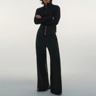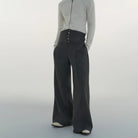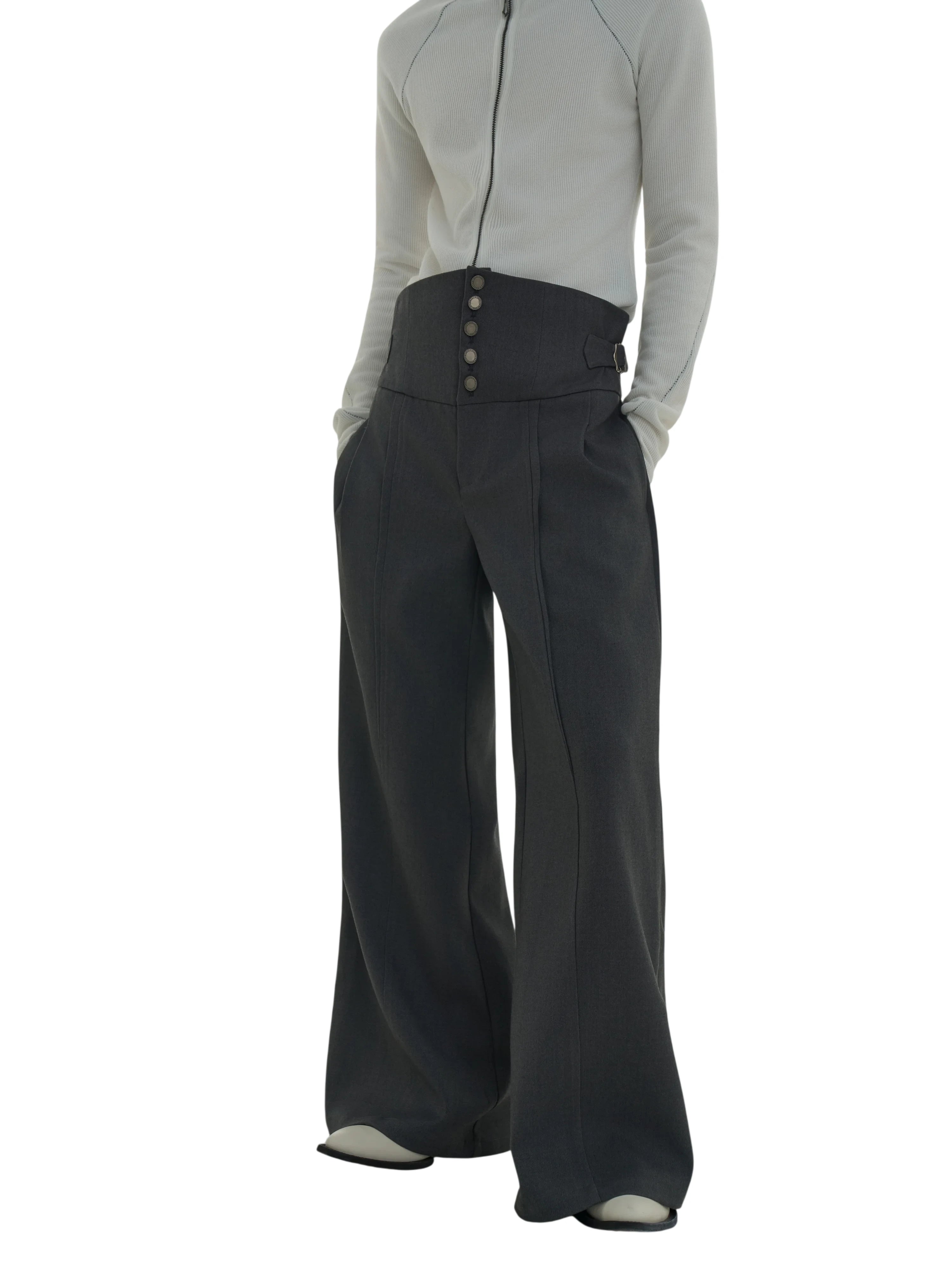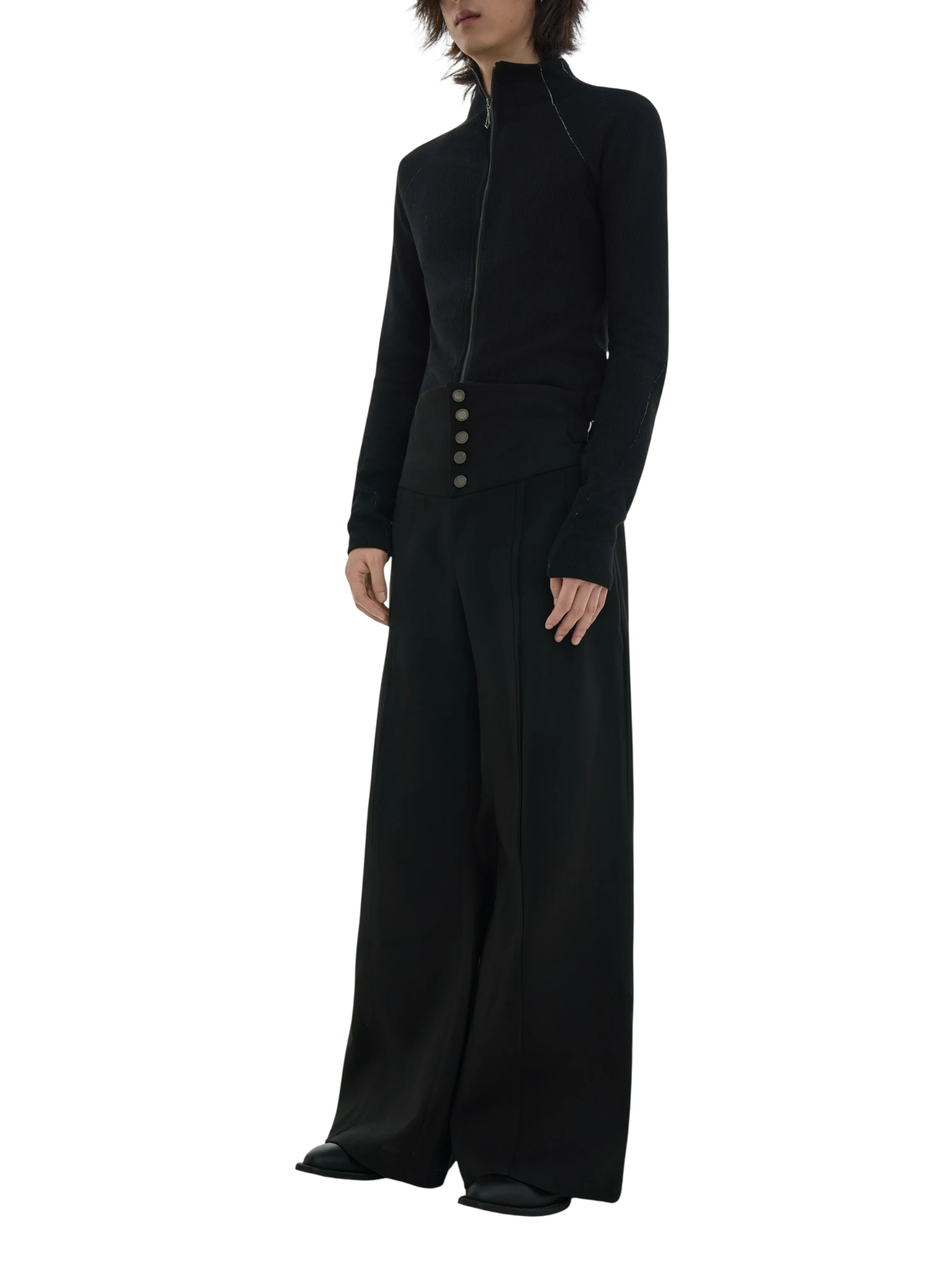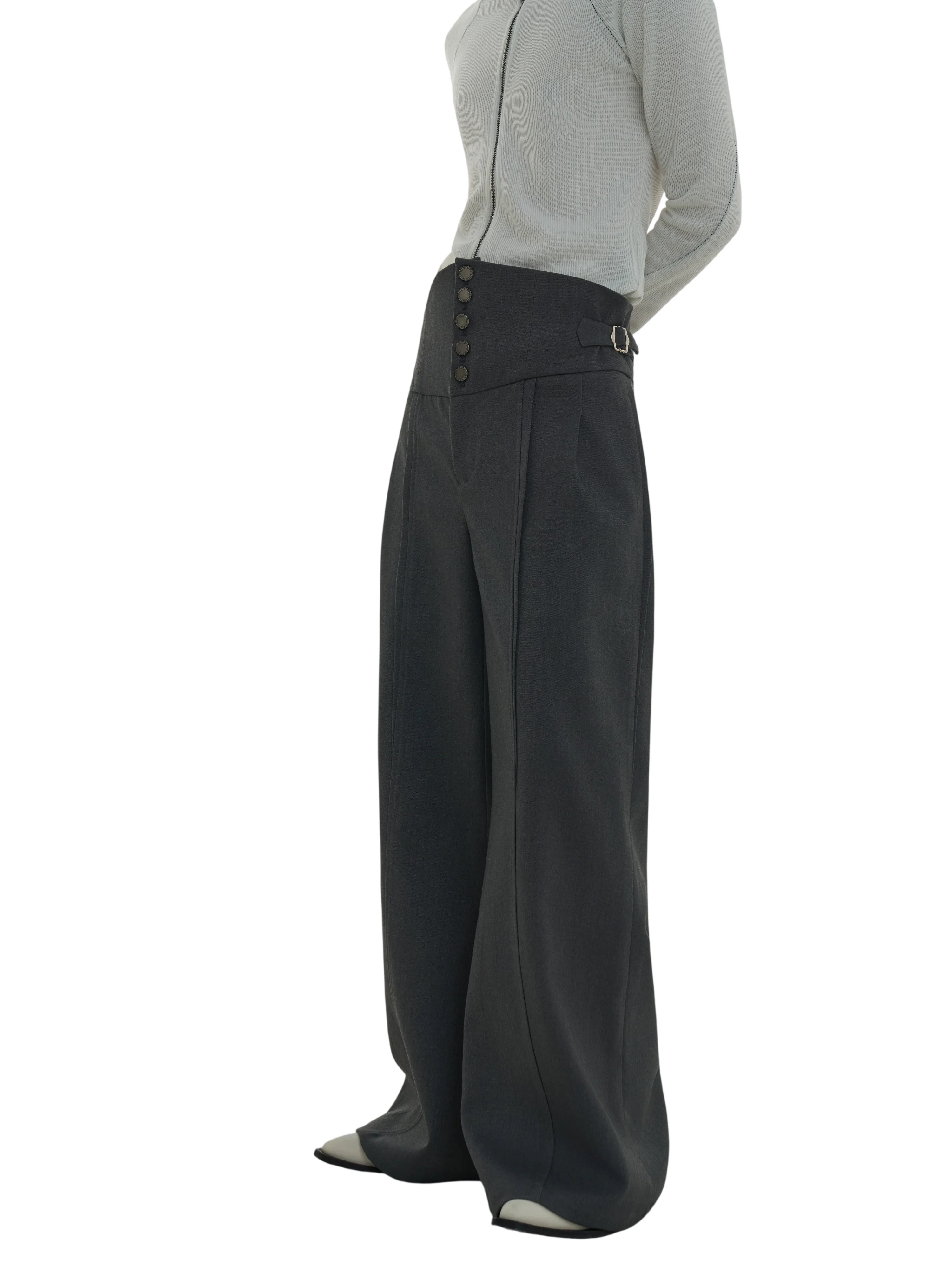Elevate your wardrobe with these high-waisted wool blend trousers, designed in a flattering A-line silhouette with a slight flare. Featuring pleated detailing and a structured inverted triangle waistband, these wide-leg trousers offer a refined, modern edge. A row of six metallic buttons creates a striking vertical accent, while the subtle O-ring and concealed front stitching add contemporary flair. Perfect for sophisticated, fashion-forward styling.