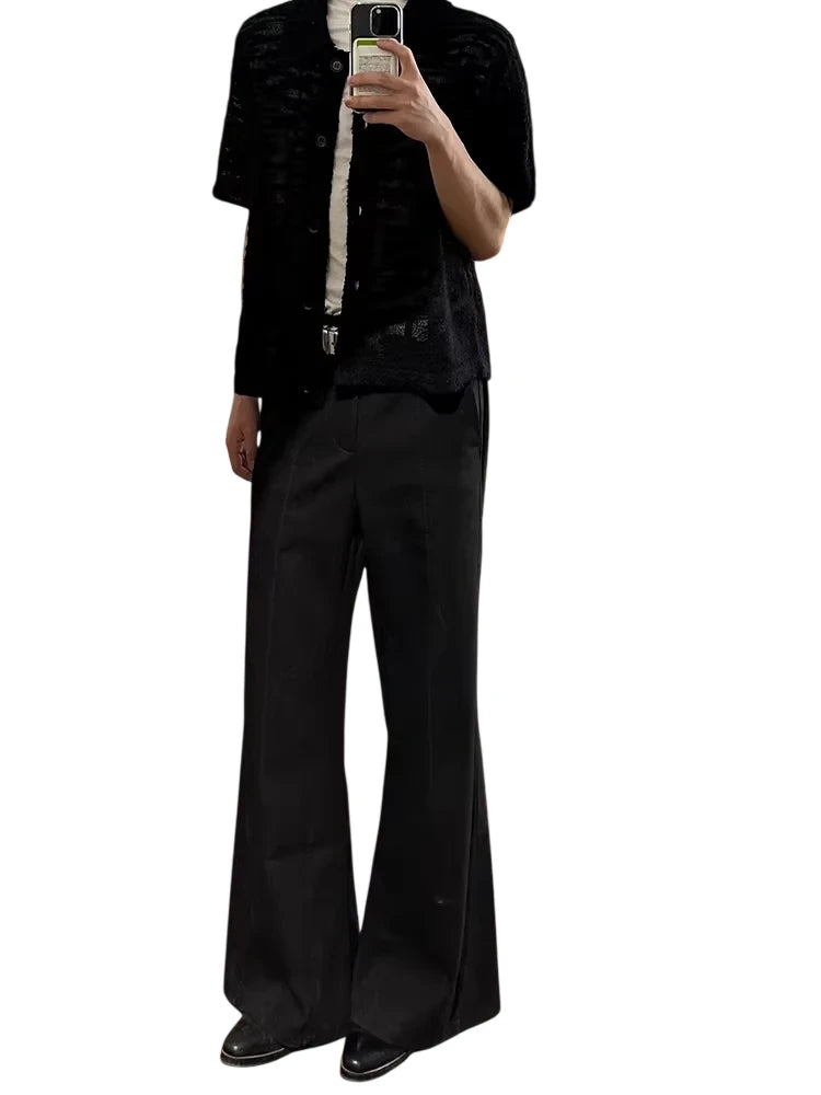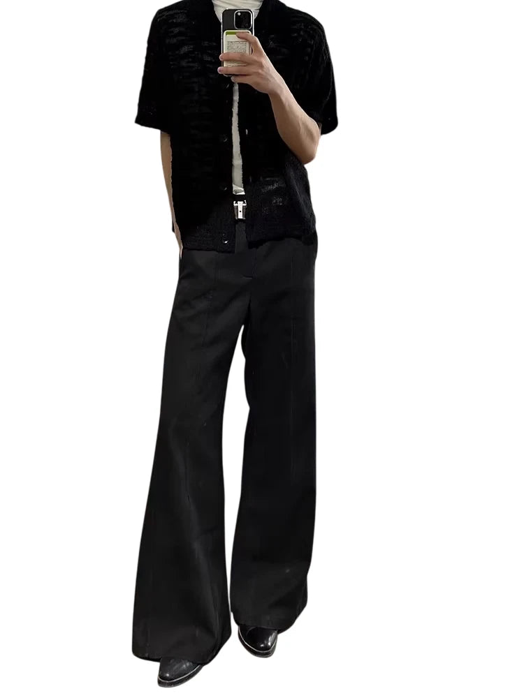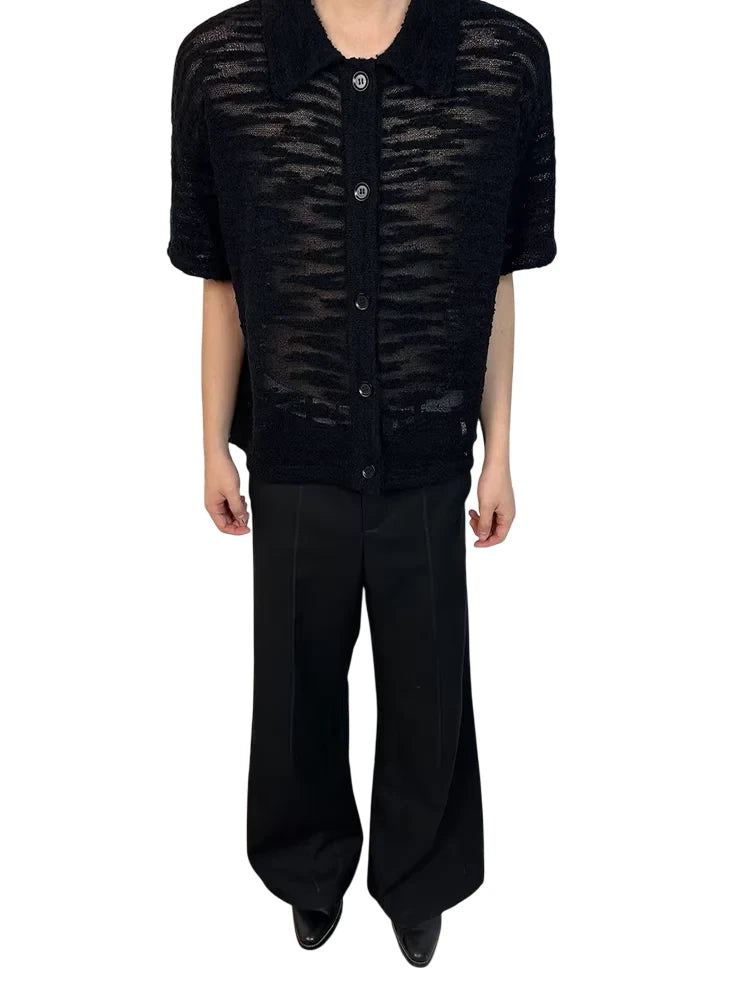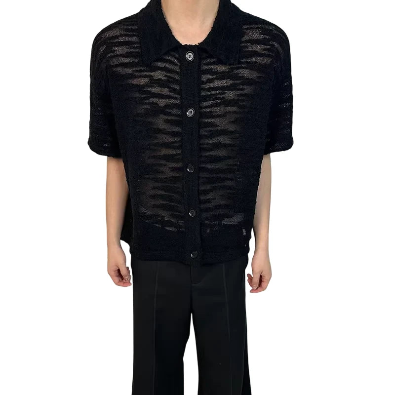Elevate your wardrobe with this men's black short-sleeve button-up shirt, featuring a sheer, hollow-knit texture for a bold, modern look. Designed with a relaxed, wide fit and lightweight fabric, this shirt is perfect for layering or warm-weather wear. A classic collar and front button closure add timeless appeal, making it a versatile piece for both casual and elevated ensembles.