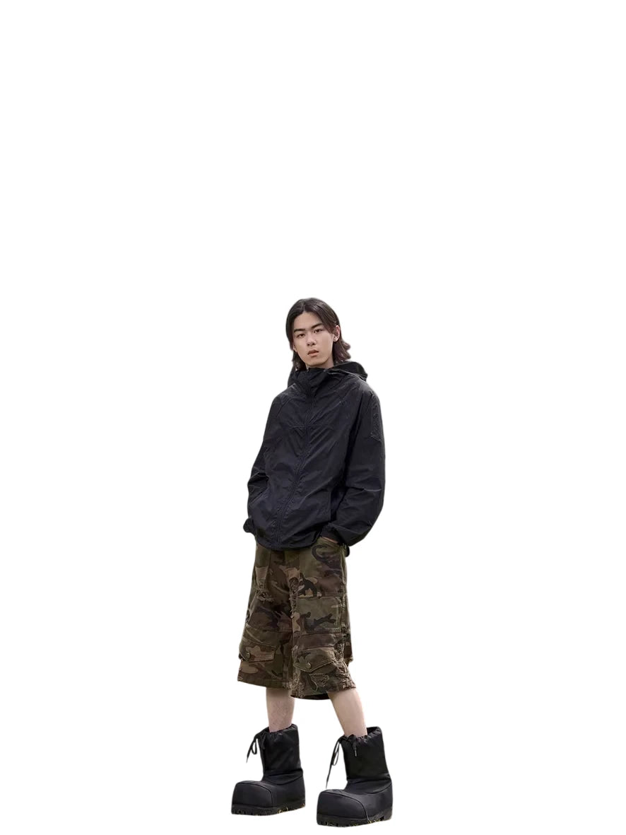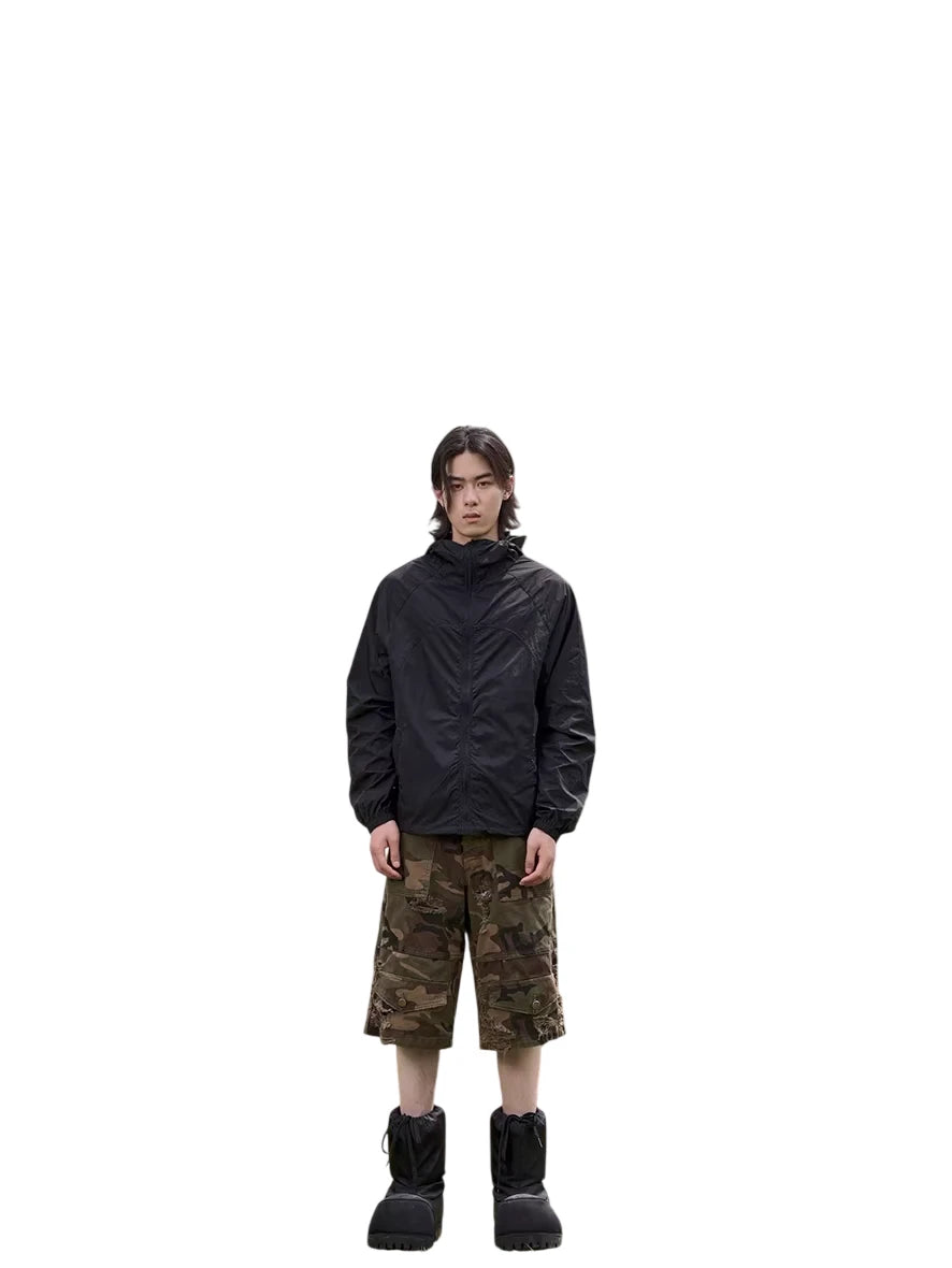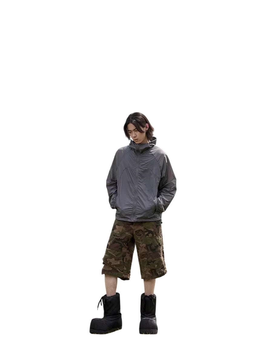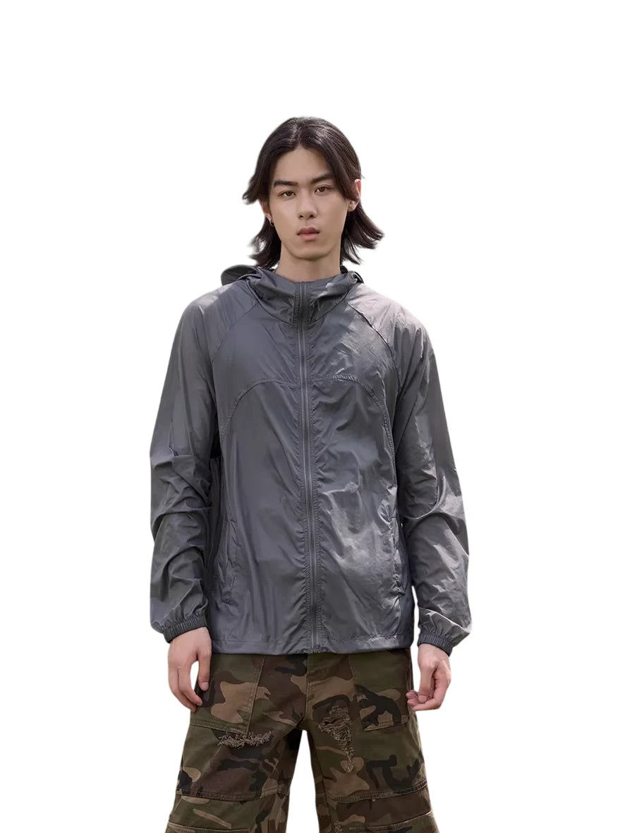 This men's breathable sports windbreaker jacket features a deconstructed design with a stand collar and full front zipper, offering both style and sun protection with UPF 50 fabric. Designed for outdoor and urban wear, the lightweight material ensures optimal comfort and ventilation. Ideal for layering, this jacket enhances a modern streetwear aesthetic while providing functional coverage.