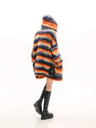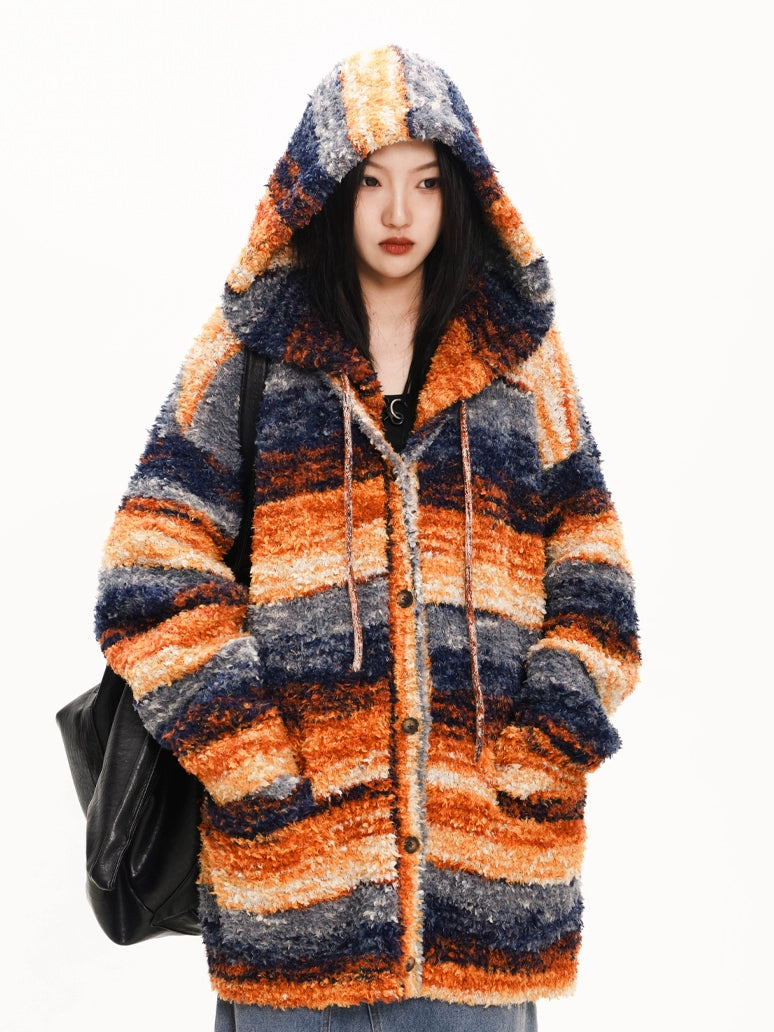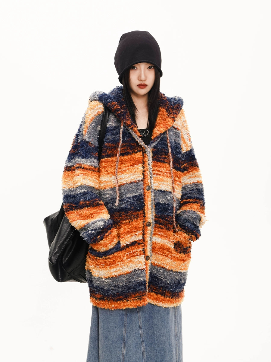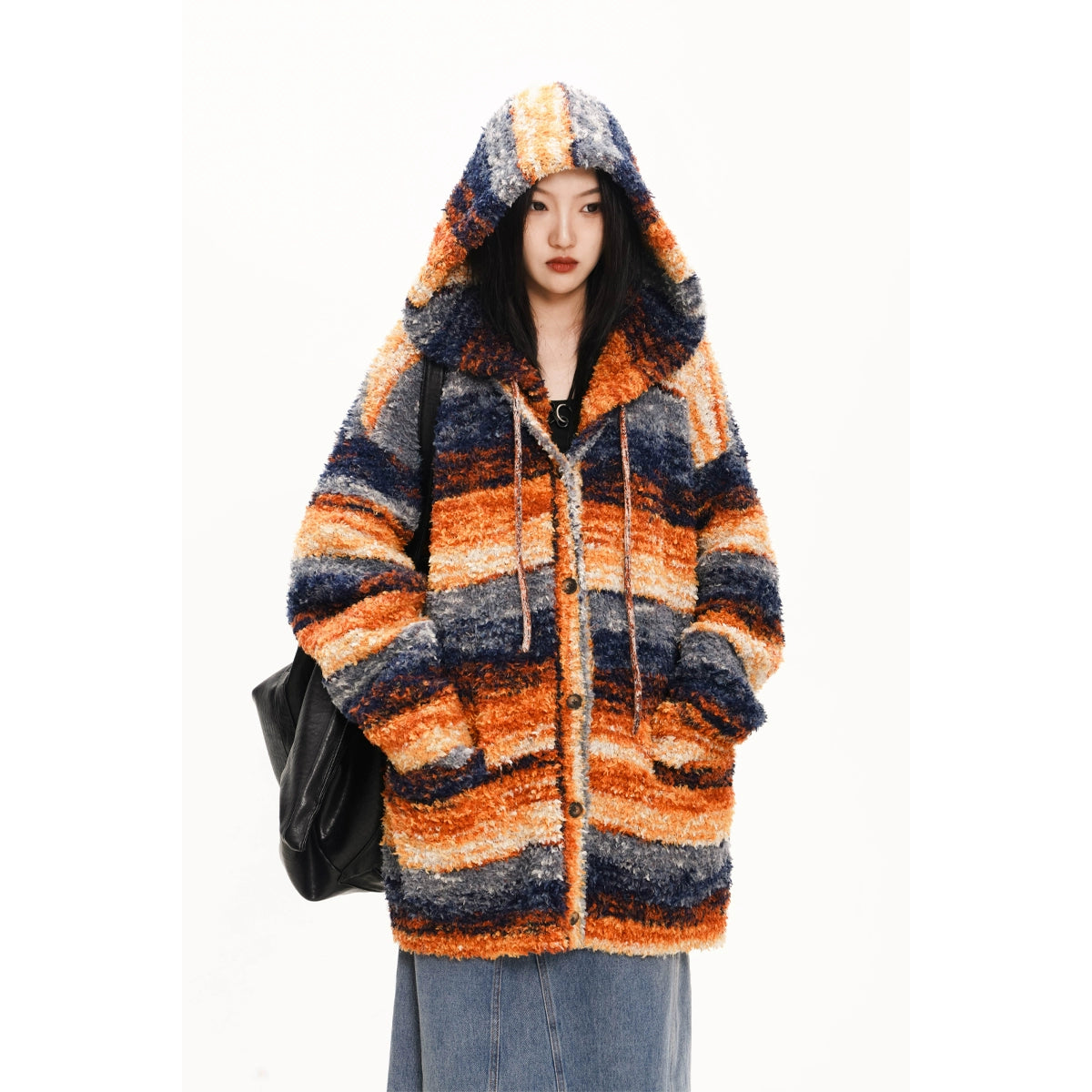 复古彩虹条纹厚款遮臀针织衫毛衣开衫女连帽原创设计感冬新款保暖