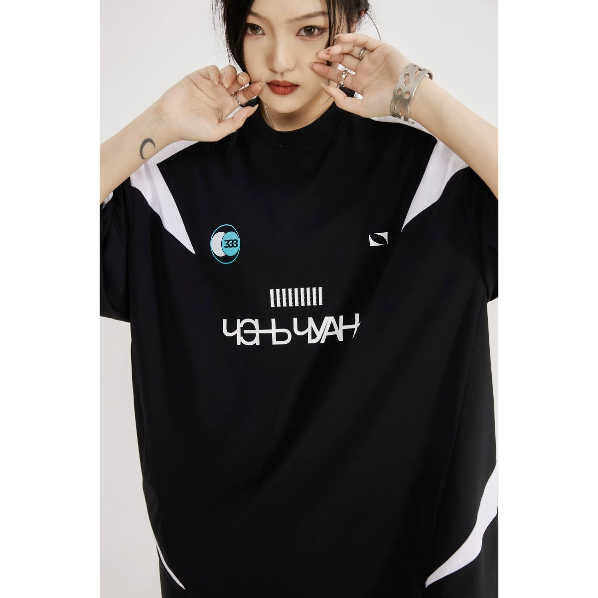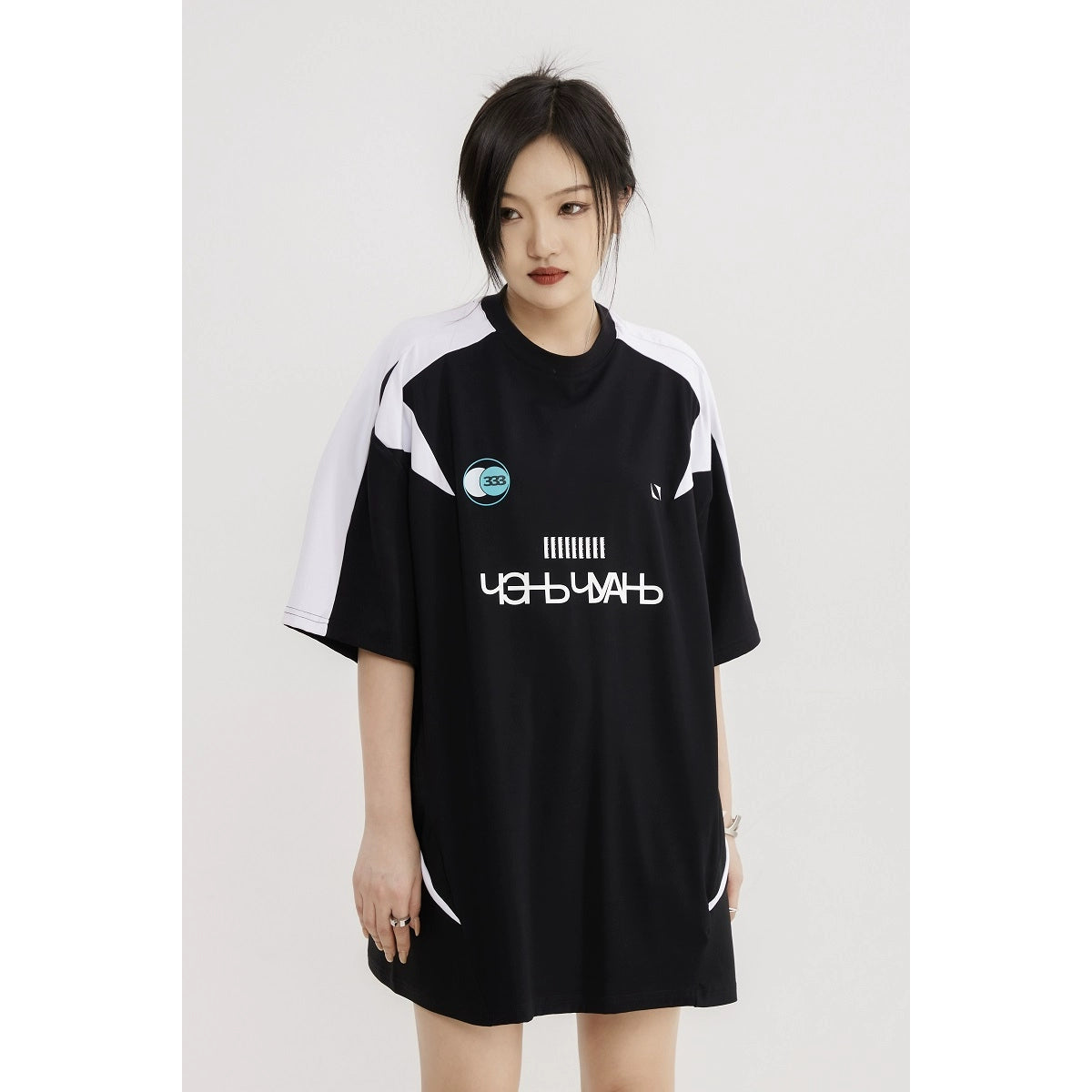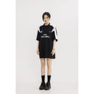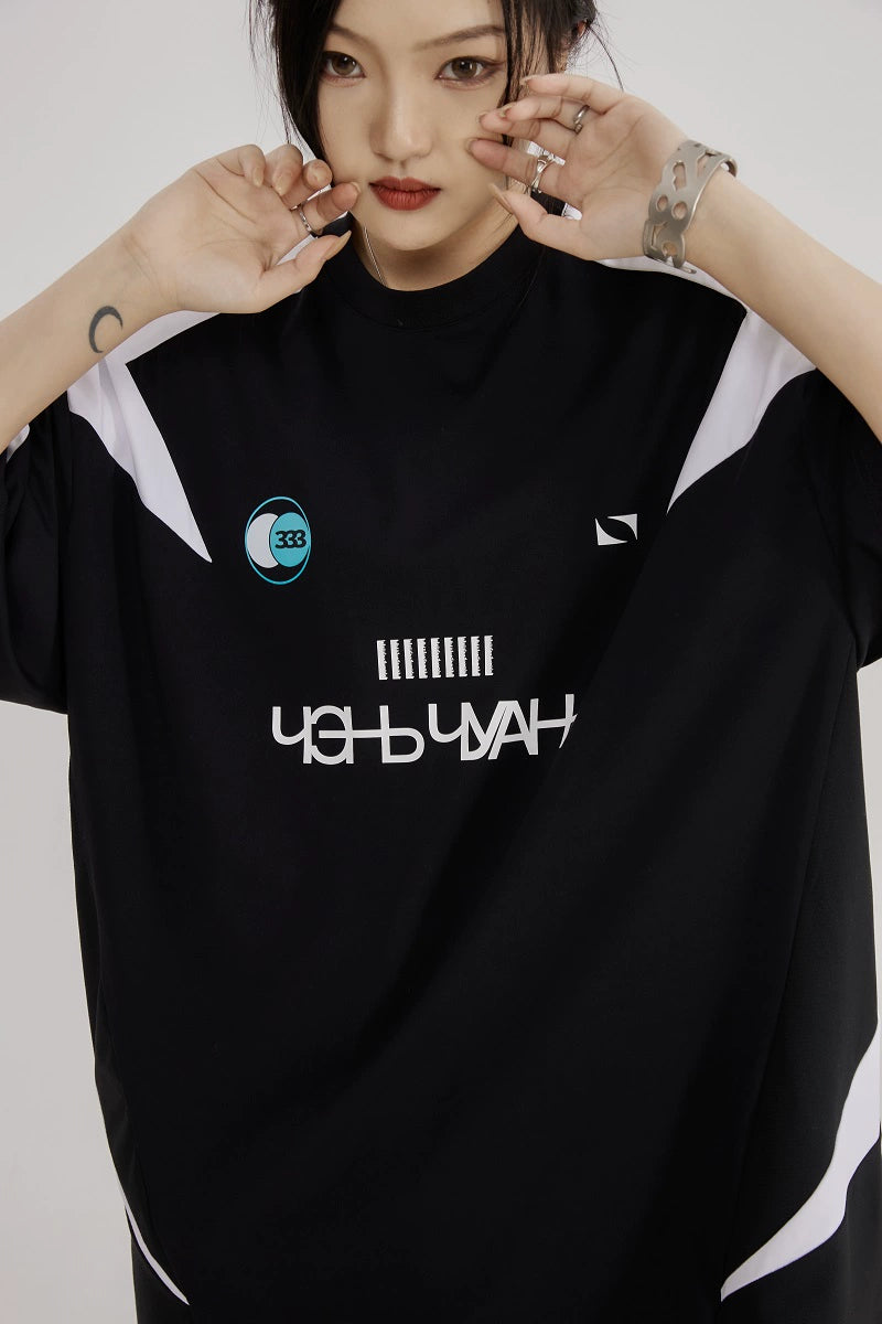 重工拼接运动休闲足球服宽松长款遮臀五分短袖T恤女小众设计感