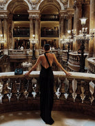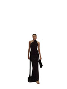 This elegant black halter dress features a one-shoulder design highlighted by a backless cut and a metal ring accent. A figure-flattering sash adds definition to the waist, while a high side slit enhances its sophisticated, evening-ready appeal. Ideal for formal gatherings or upscale vacation events, this women's dress pairs perfectly with statement jewelry and heels for a glamorous finish.