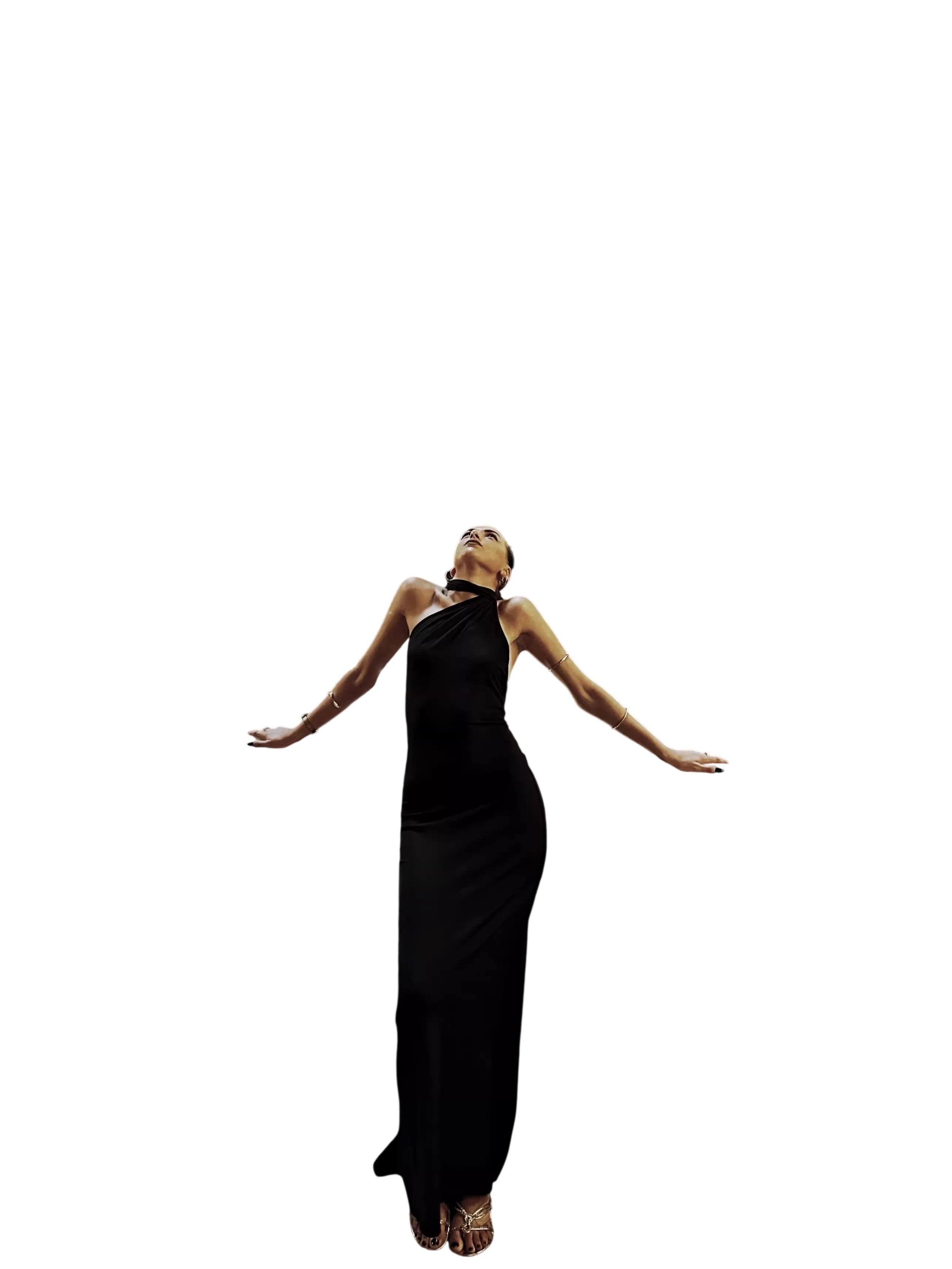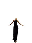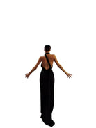 1S STUDIO Black Backless One-Shoulder Halter Dress with Sash