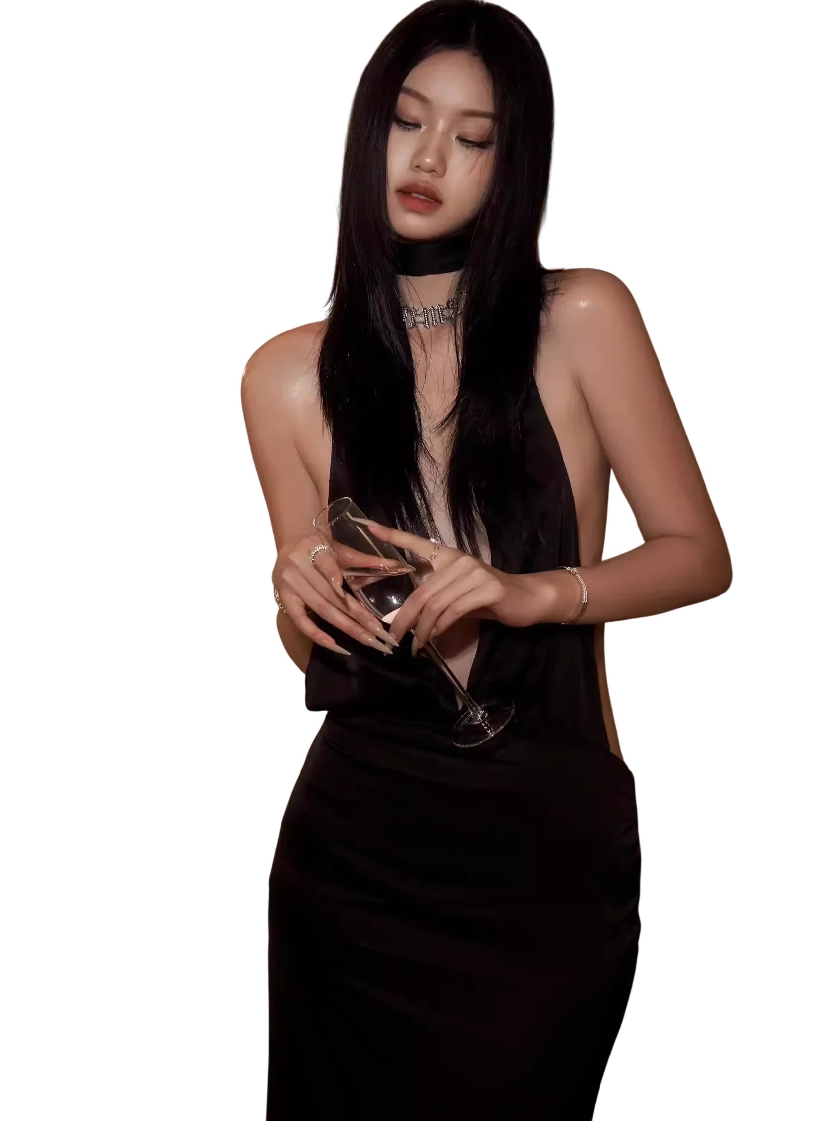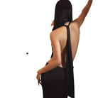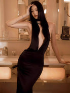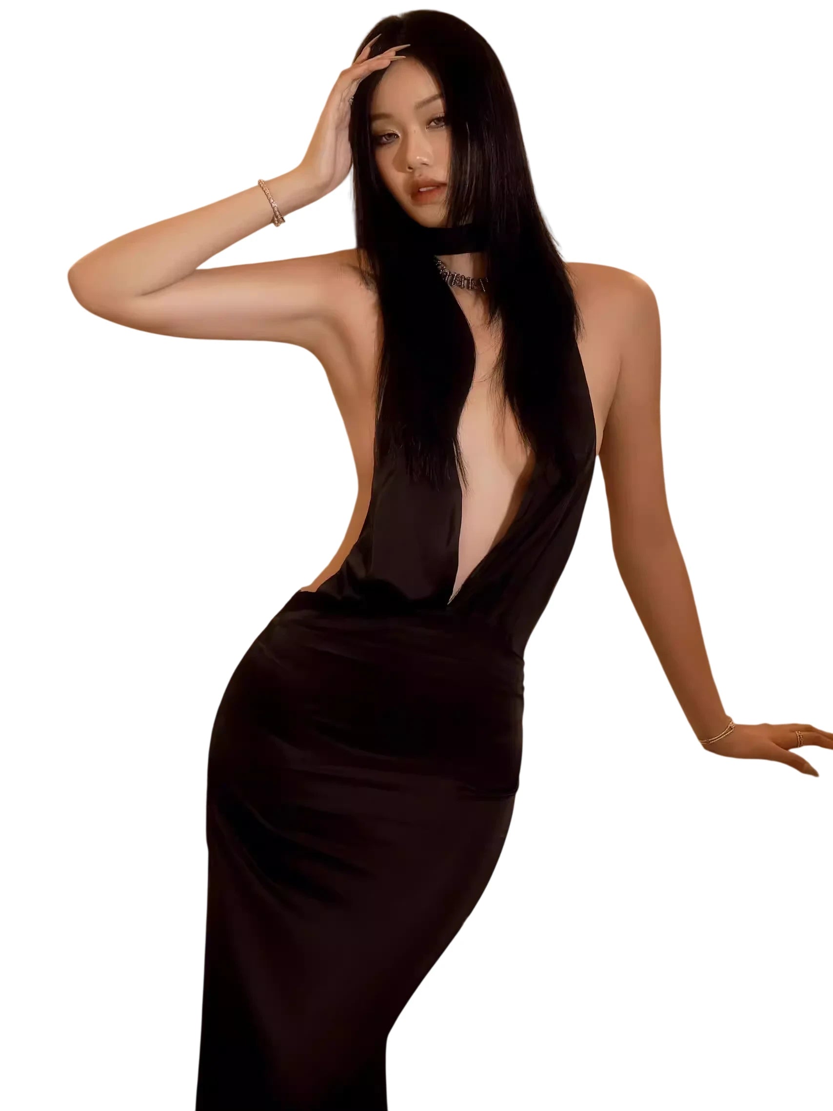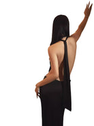 Make a bold statement with this elegant black satin halter dress, designed for women who embrace sophisticated allure. Featuring a plunging neckline and a dramatic open back that extends to the waist, this flowing gown is perfect for parties, birthdays, or evening events. The smooth acetate satin fabric adds a luxurious touch, while delicate, flowing straps enhance its captivating silhouette.