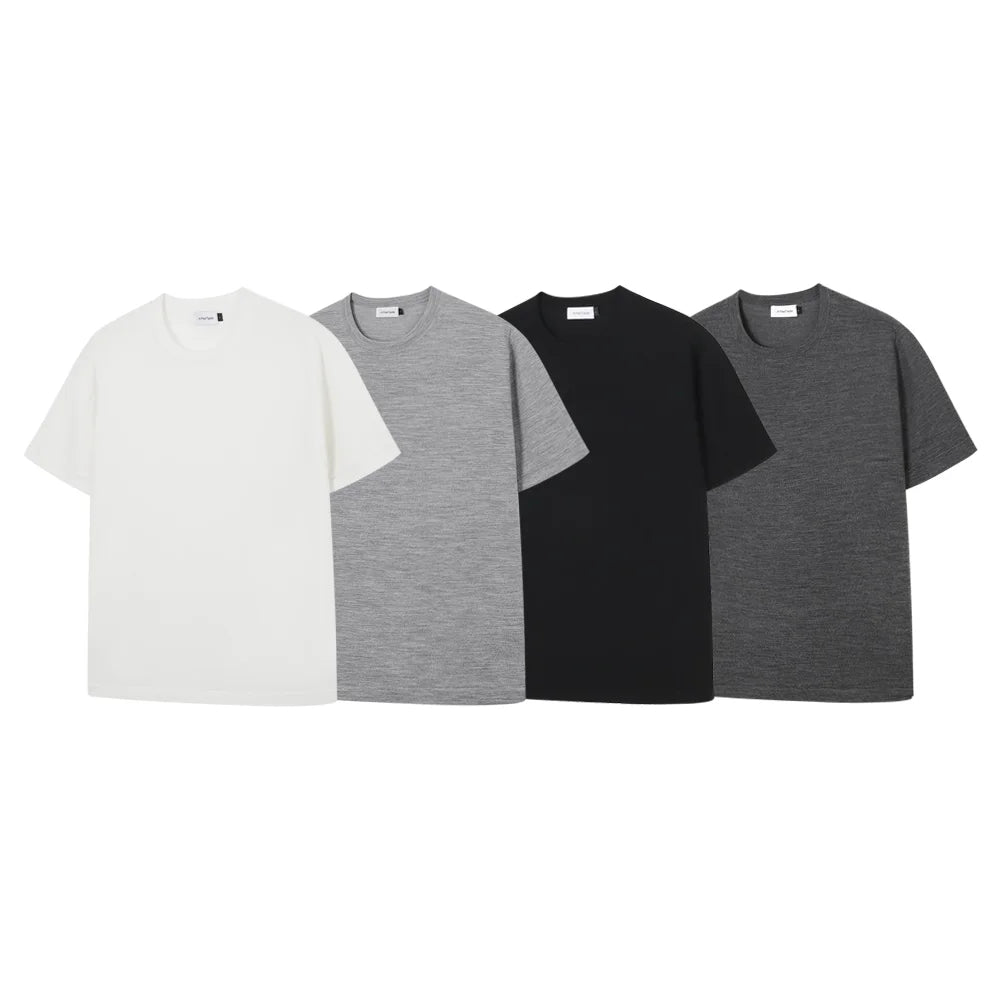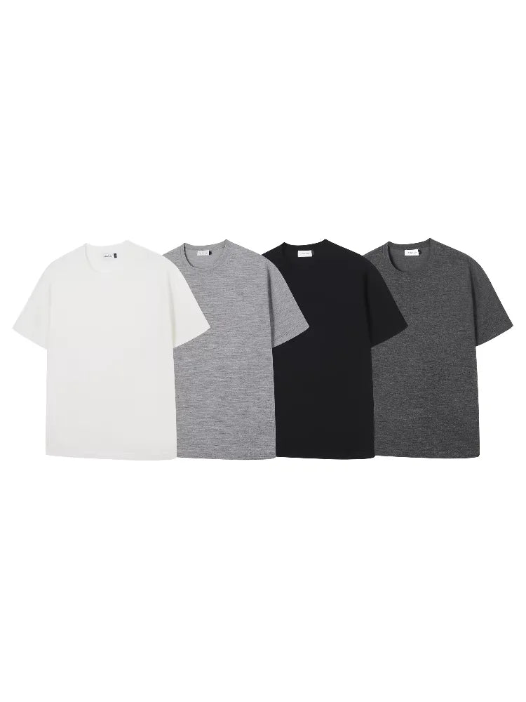 Available in four versatile neutral shades—white, light heather grey, solid black, and dark heather grey—each shirt features a smooth fine knit texture suitable for both casual and elevated styling. Perfect as a layering piece or stand-alone essential.