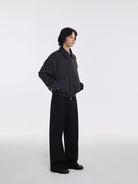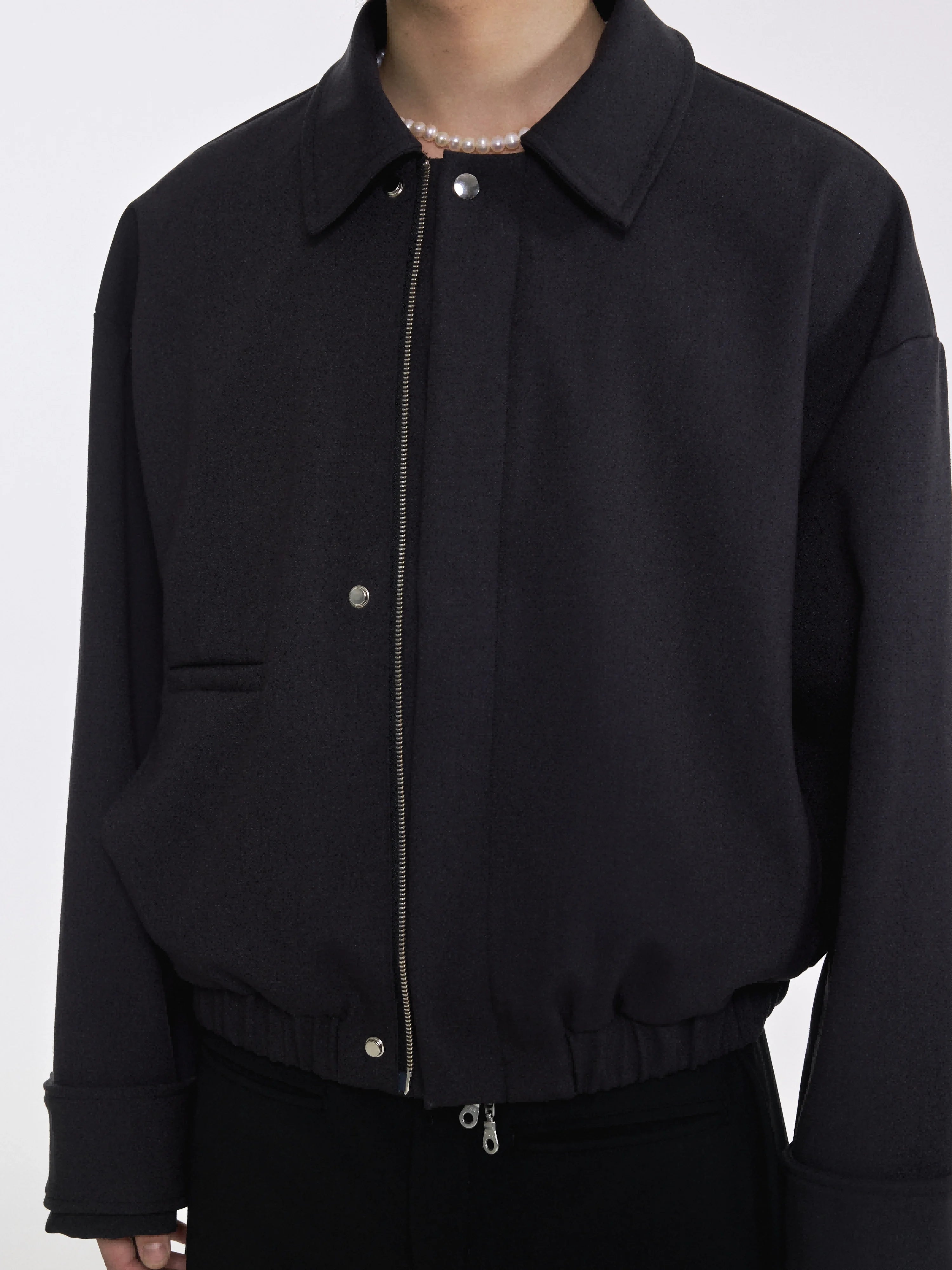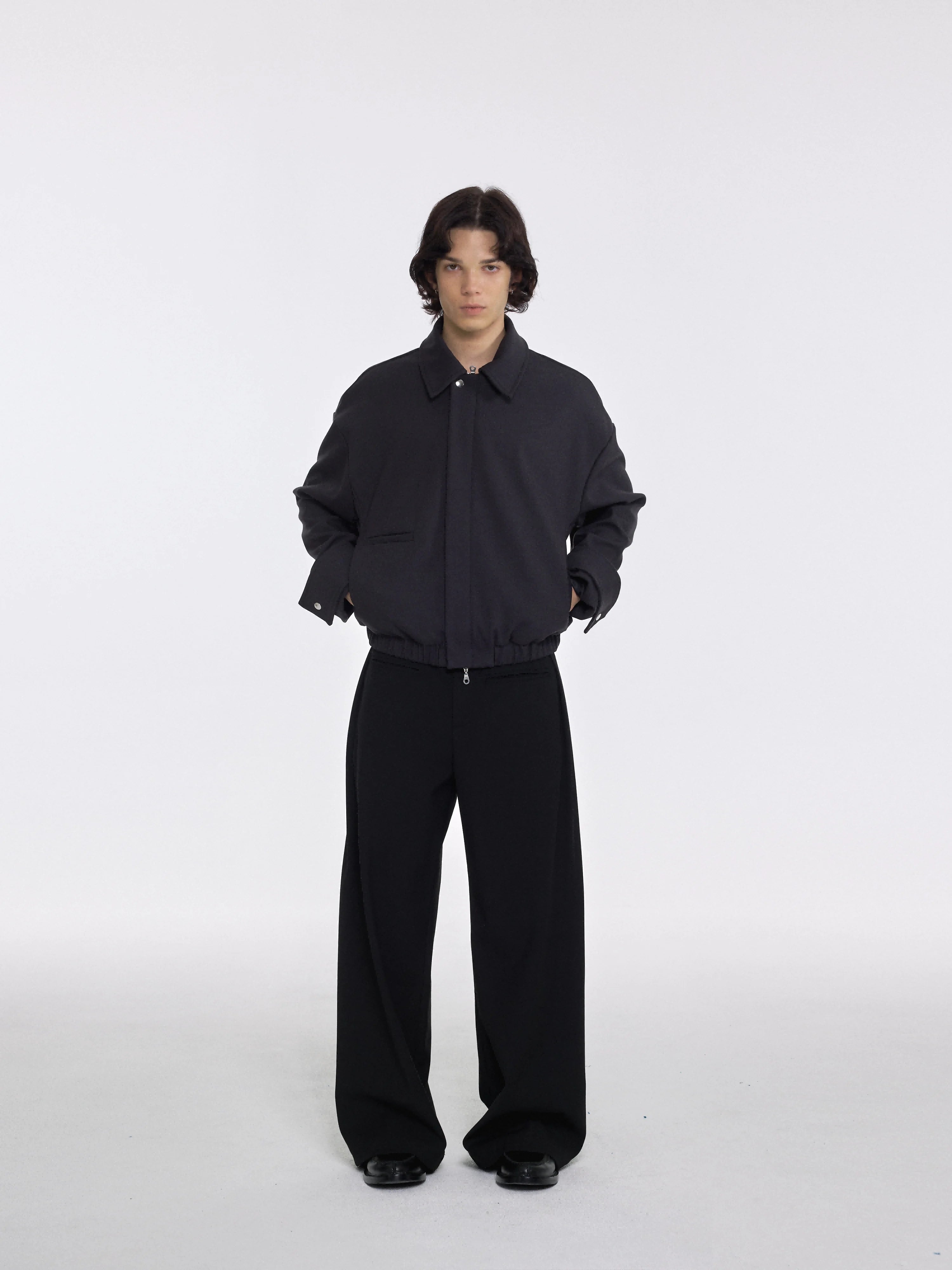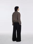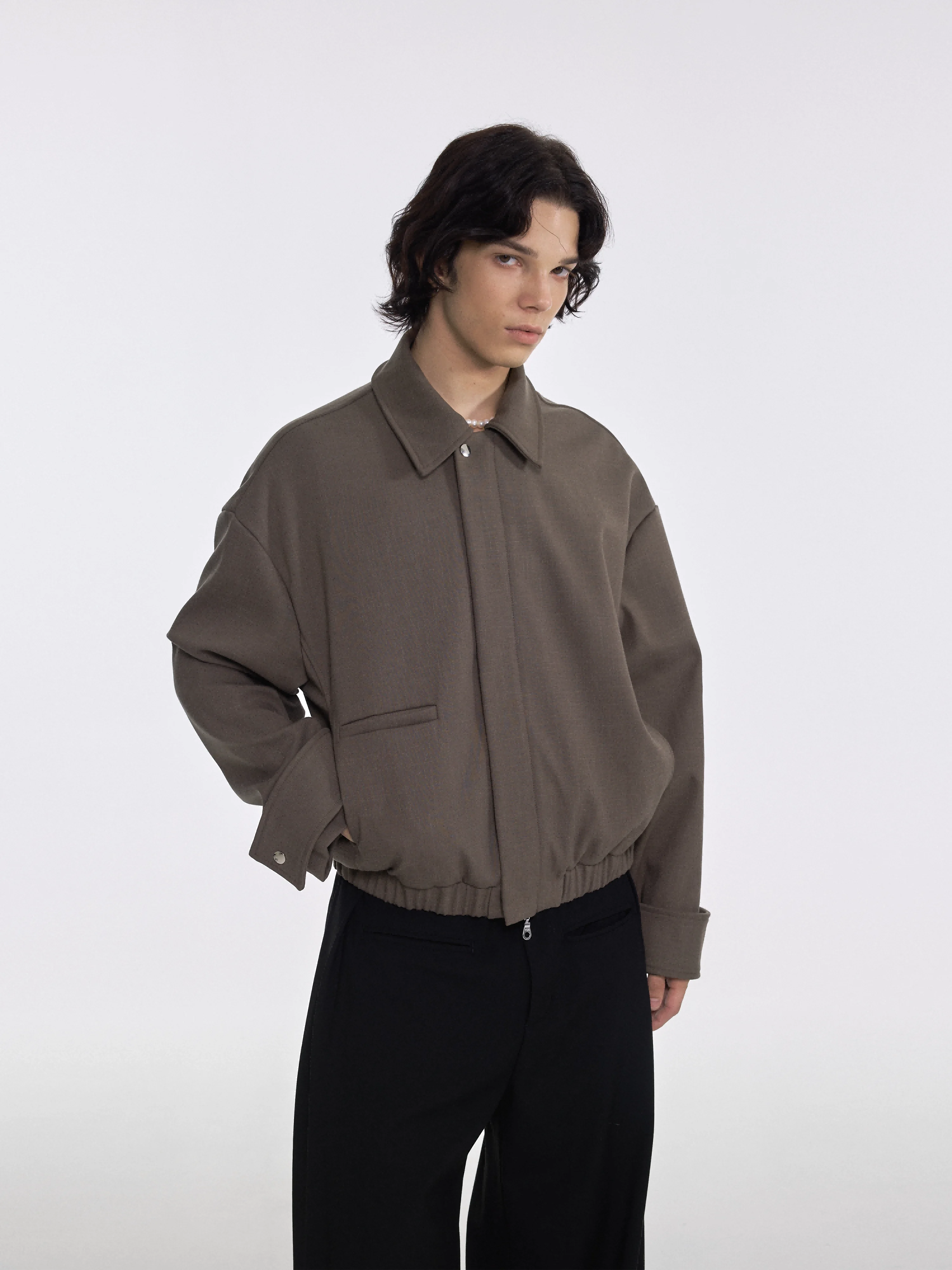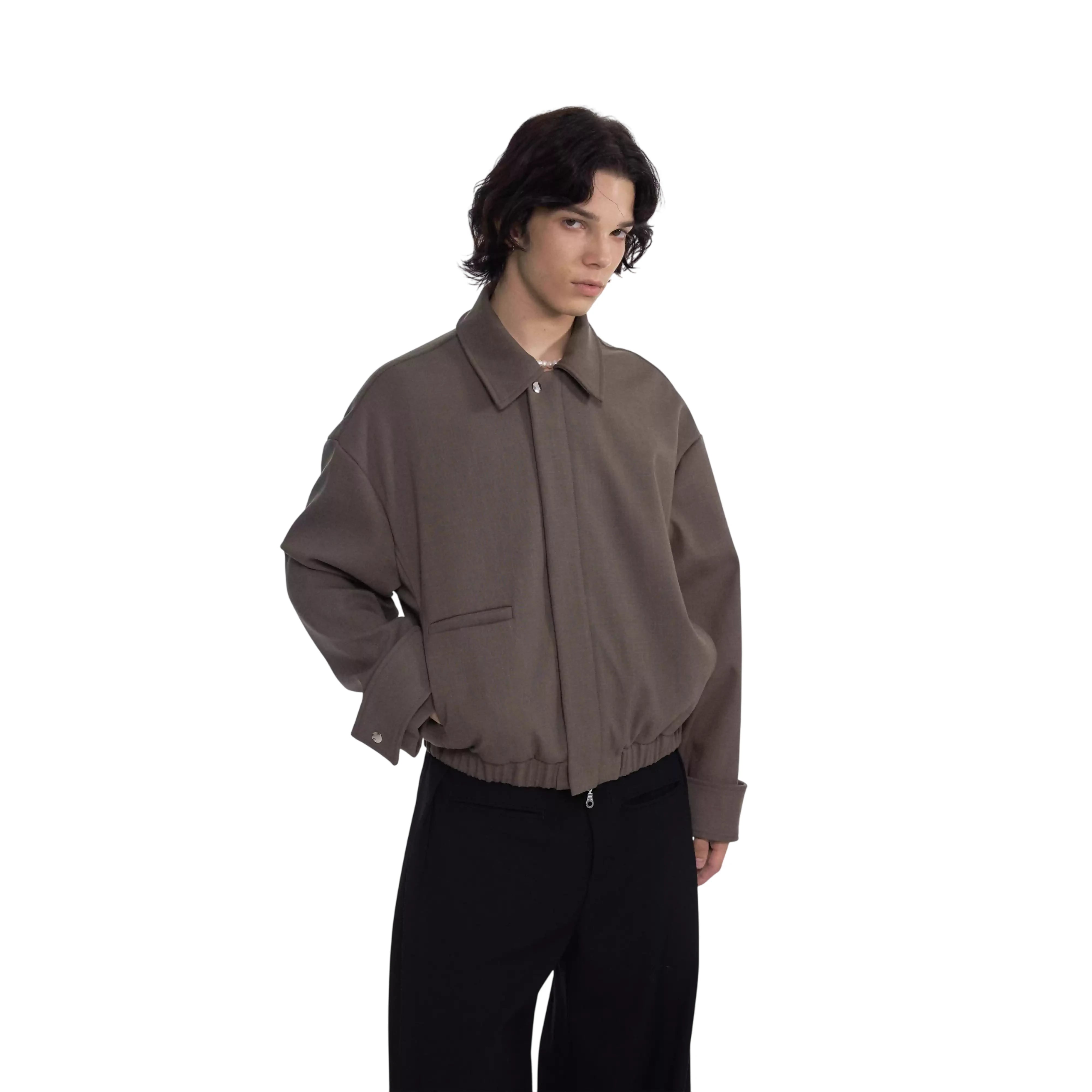 This men's bomber-style jacket features a modern two-tone design in a gray-green hue, crafted from a breathable linen blend. Designed with a relaxed silhouette, it includes a front zip closure hidden by a clean placket, a pointed collar, and buttoned cuffs for added structure. The elasticated hem and slanted welt pockets enhance both comfort and functionality, making it a versatile outerwear piece for contemporary wardrobes.