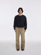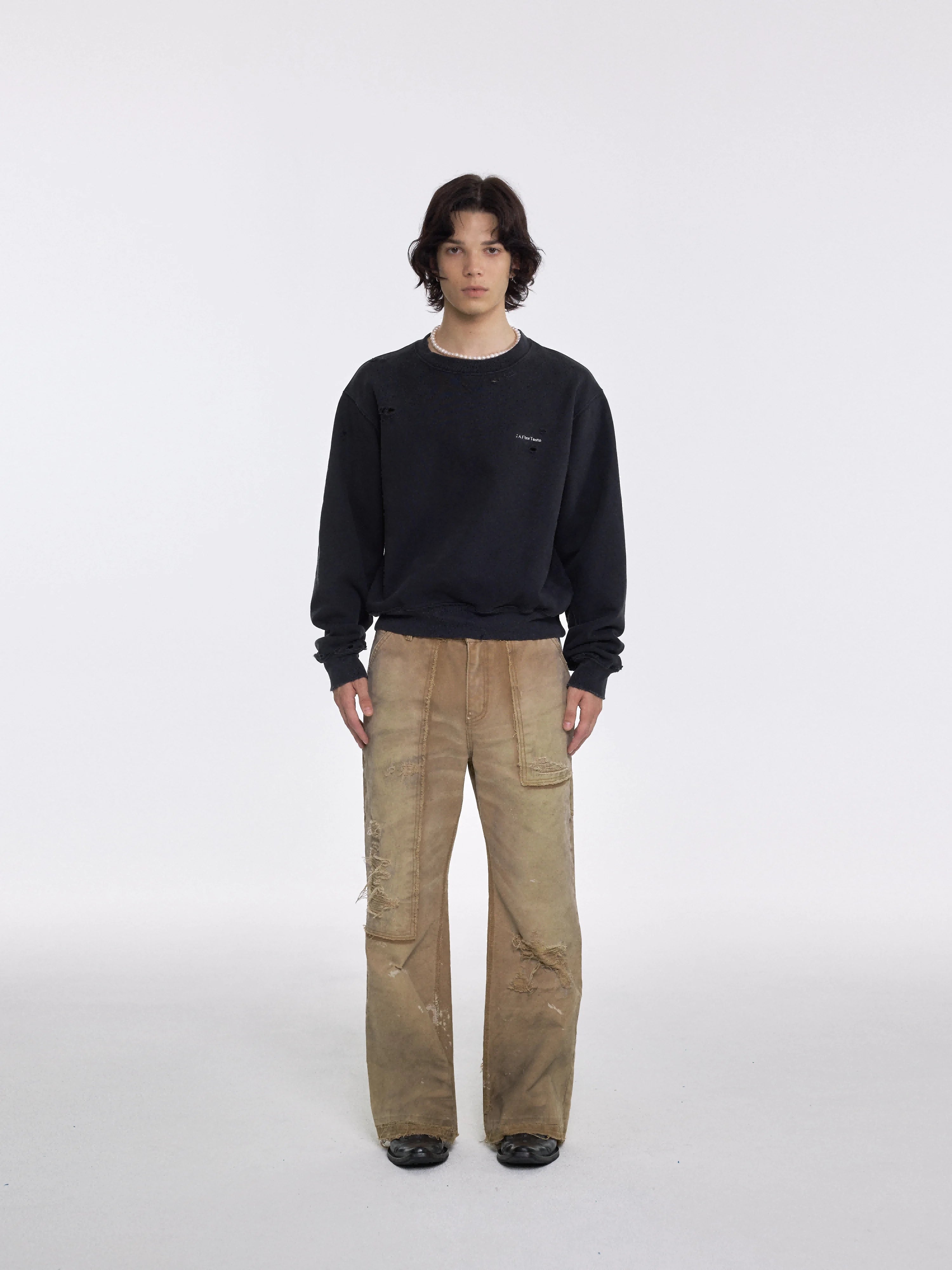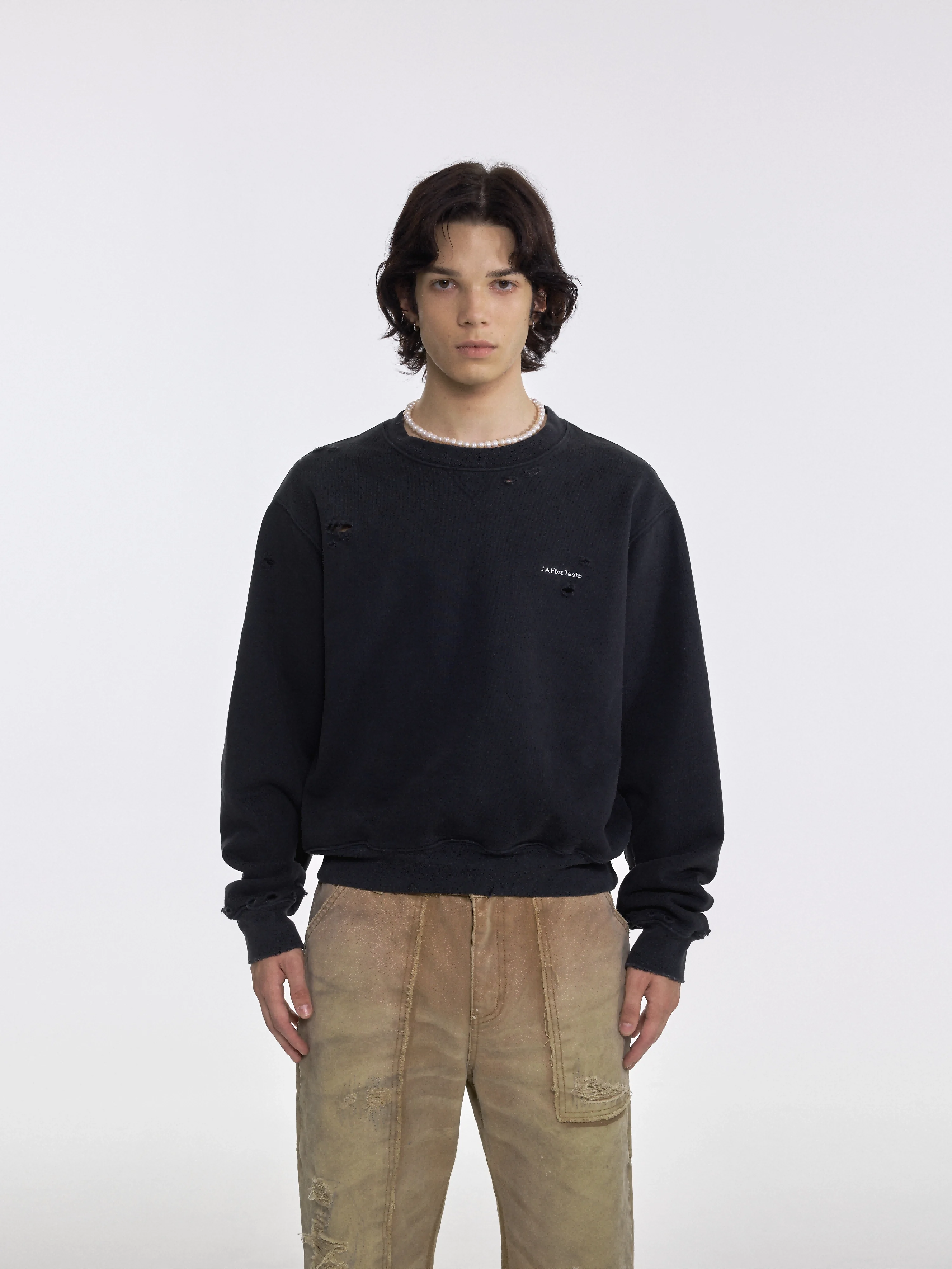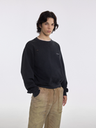 This men's crewneck sweatshirt features a stylish distressed design along the shoulders and sleeves, offering a contemporary, worn-in look. Crafted with ribbed cuffs and waistband for a secure and comfortable fit, it includes a minimalist white text logo on the left chest to subtly elevate the design. The washed black fabric adds a sleek, versatile touch for casual everyday wear.
