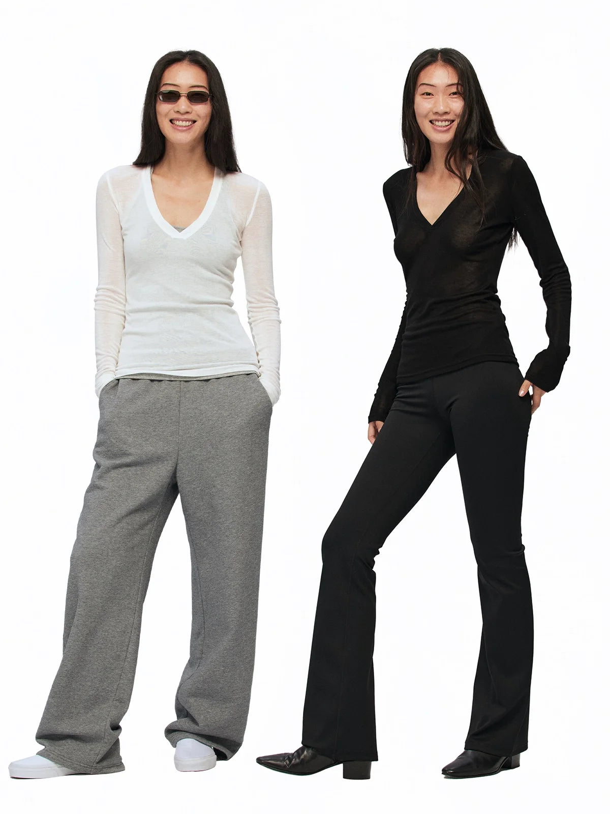 Elevate your everyday wardrobe with this women's deep V-neck slim fit long sleeve top. Designed for a sleek silhouette, this soft knit shirt features lightweight, slightly sheer fabric perfect for layering or casual wear. The minimalist style comes in versatile colors like white, black, and heather gray, making it easy to pair with a variety of bottoms—from jeans to lounge pants. Ideal for creating simple, modern looks with comfort and ease.