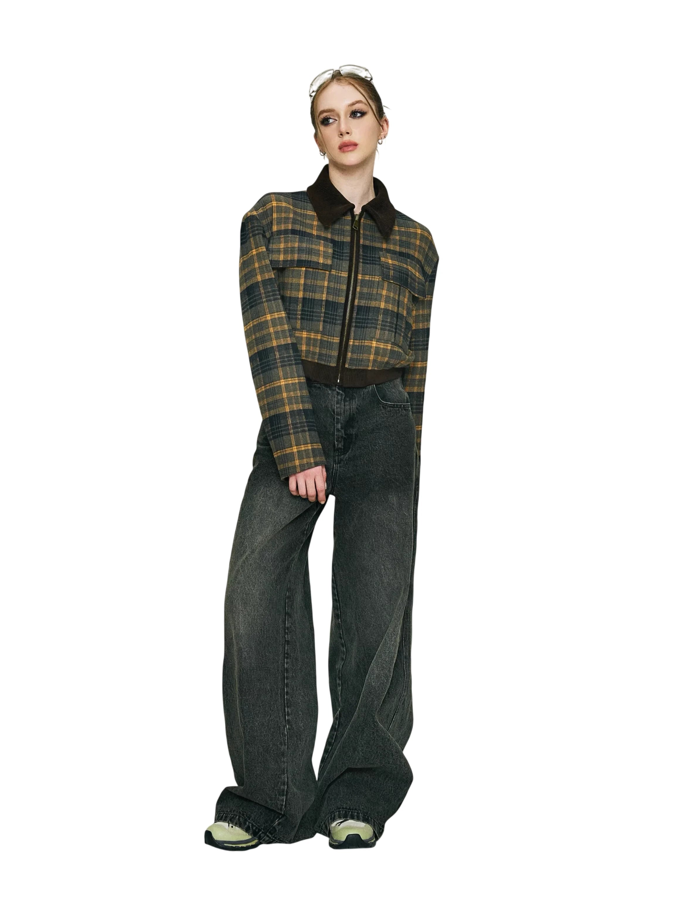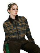 Elevate your casual wardrobe with this vintage-inspired cropped plaid jacket for women. Featuring a stylish brown, mustard, and navy plaid pattern, this jacket includes a front zipper, a brown corduroy lapel collar, and practical chest pockets. Ribbed brown cuffs and waistband add structure and comfort, while the cropped fit pairs effortlessly with high-waisted jeans or skirts. Perfect for a chic, laid-back look.