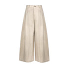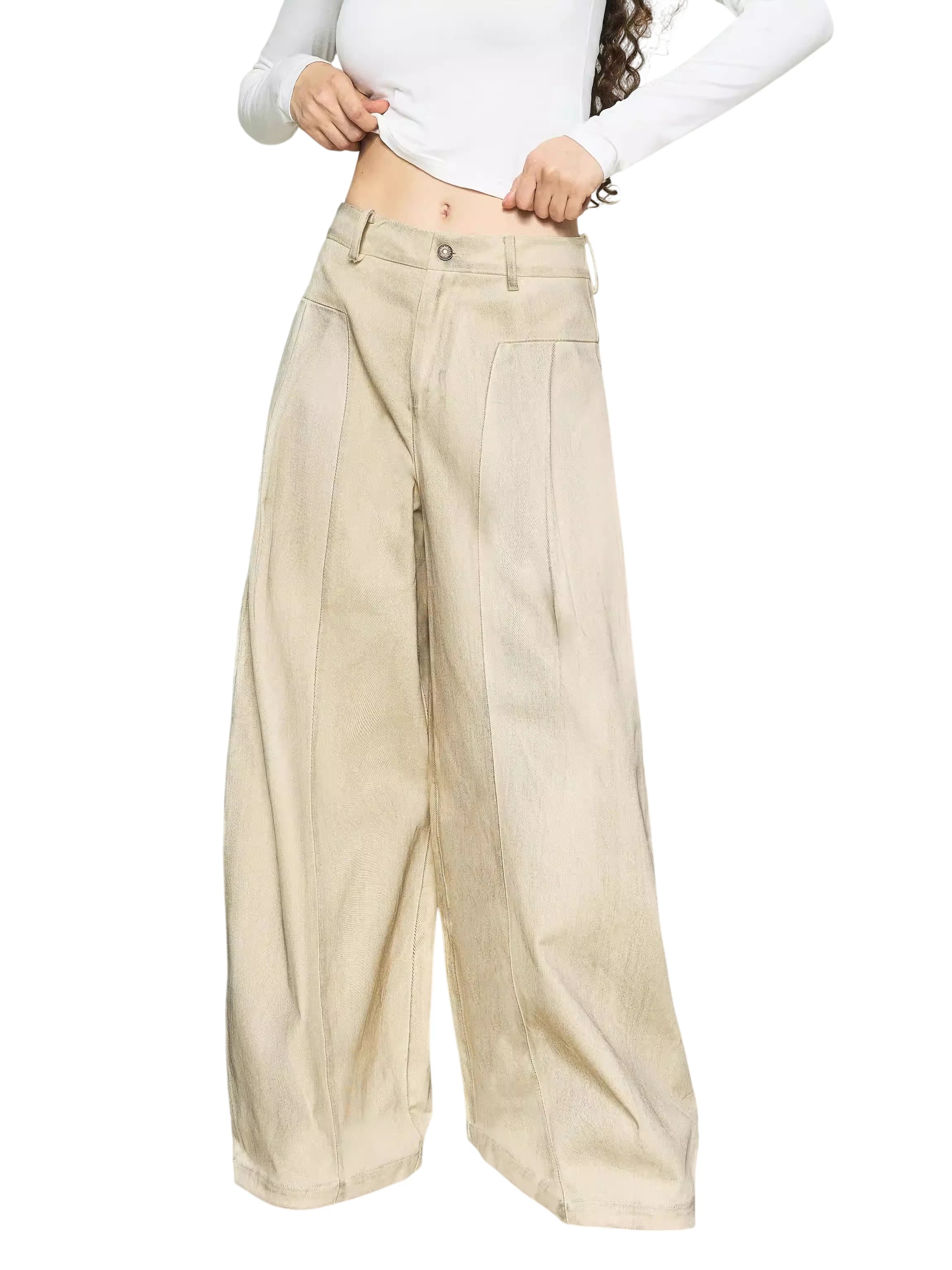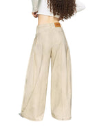 These women's vintage washed denim pants feature a wide-leg silhouette with a loose, curved design for a relaxed and stylish fit. Crafted from structured fabric, the trousers are detailed with front seam stitching and visible pleats for added volume and shape. A classic high-waisted cut is complemented by belt loops and a brown leather patch on the waistband. Ideal for casual wear, these pants offer both comfort and timeless fashion appeal.