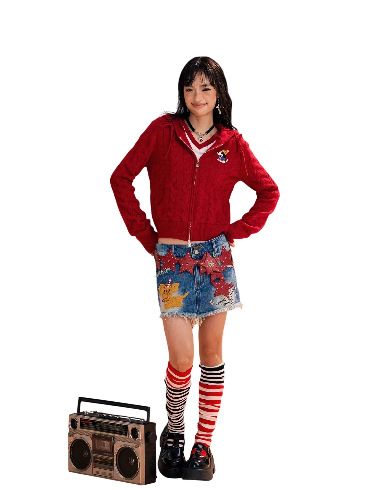 Express your playful side with this stylish denim mini skirt designed for women. Featuring colorful graffiti-inspired embroidery including cartoon puppy motifs, stars, and quirky text phrases, this skirt brings a youthful street style vibe to your wardrobe. The raw hemline adds an edgy touch while the medium blue wash offers a relaxed, worn-in look. Classic five-pocket styling, a double-button closure, and zip fly complete this versatile autumn-ready piece.