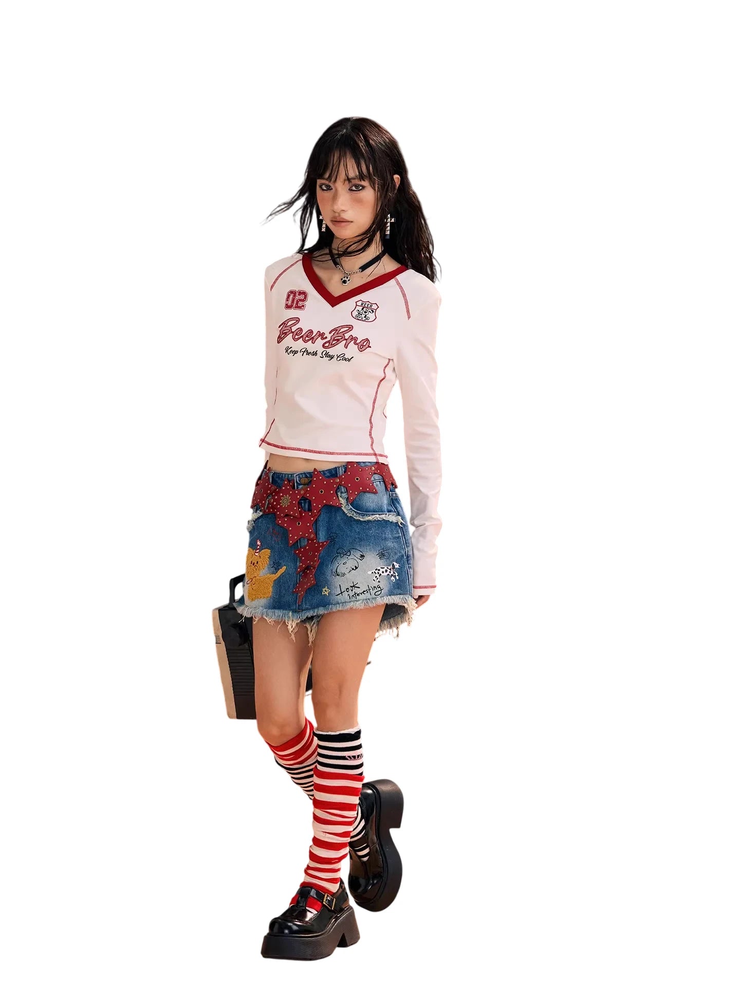 BeerBro Graffiti Embroidered Denim Mini Skirt with Raw Hem for Women