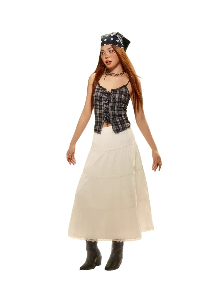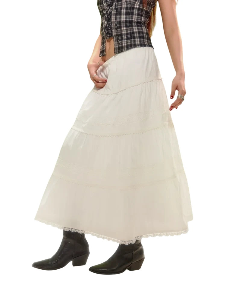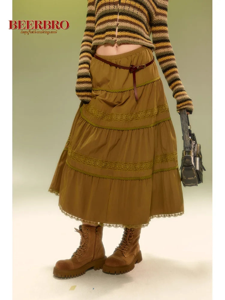 Elevate your spring wardrobe with this vintage-inspired tiered midi skirt for women. Designed with a flattering loose fit, it features elegant ruched detailing and delicate olive green lace trim that adds depth and femininity. Subtle pleats offer volume and graceful movement, while the midi length ensures versatile styling. Ideal for both casual and dressy occasions, this skirt brings together comfort and timeless charm.