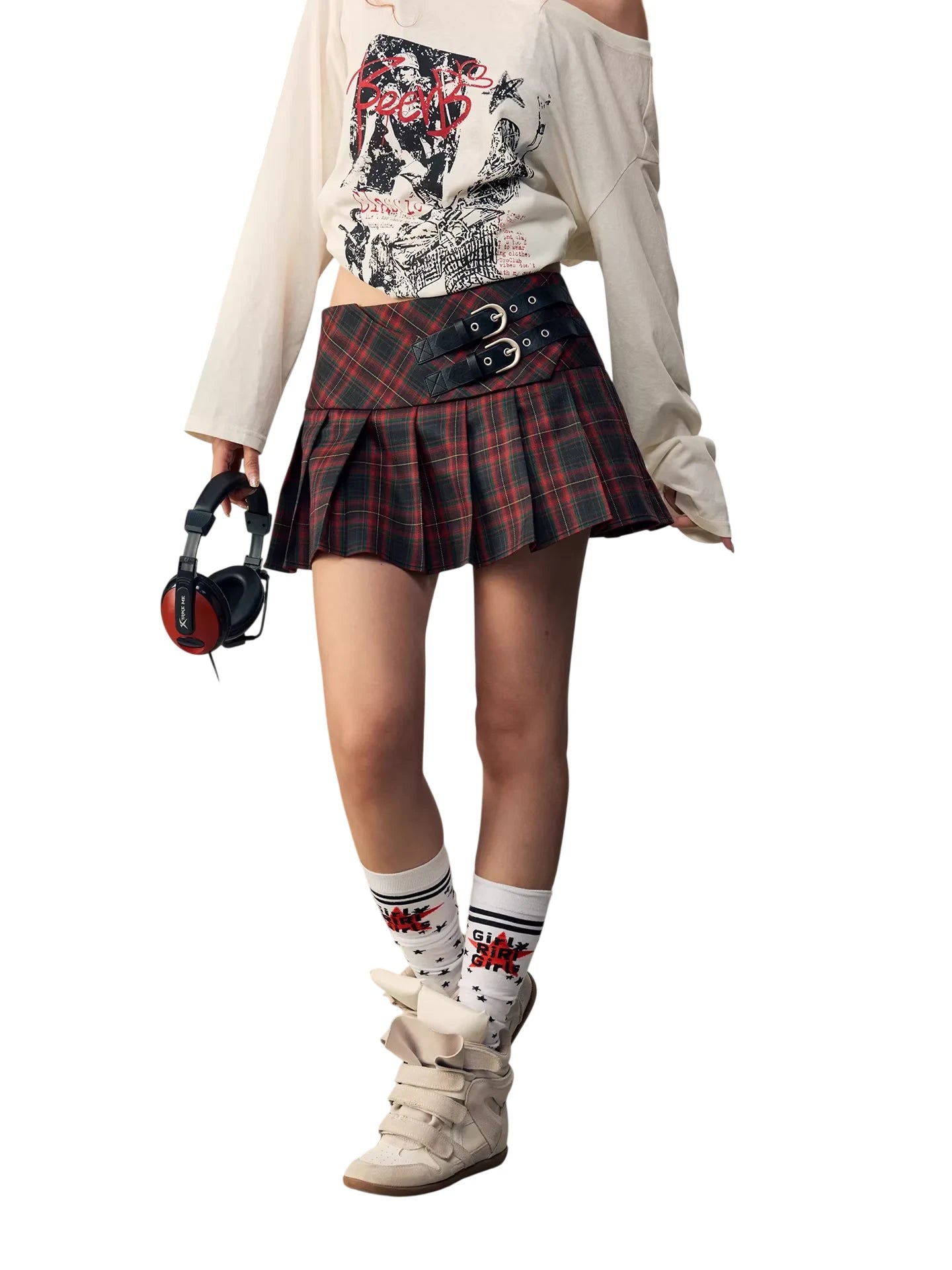BeerBro Plaid Pleated Mini Skirt with Buckle Detail