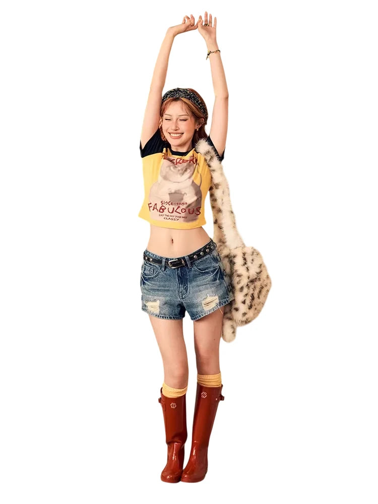 Elevate your summer wardrobe with these stylish women's denim shorts crafted from 100% soft cotton. Designed with a mid-low waist fit, these heavy-duty shorts feature trendy distressed detailing at the front for an edgy, worn-in look. Unique side accents with metal rings and darker denim panels add a punk-inspired touch, complemented by a bold black studded leather belt. Perfect for casual outings, these fashionable shorts blend comfort with attitude for a standout summer style.