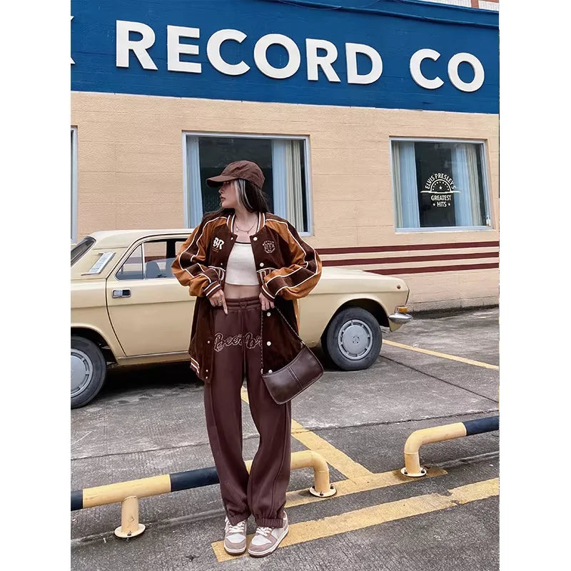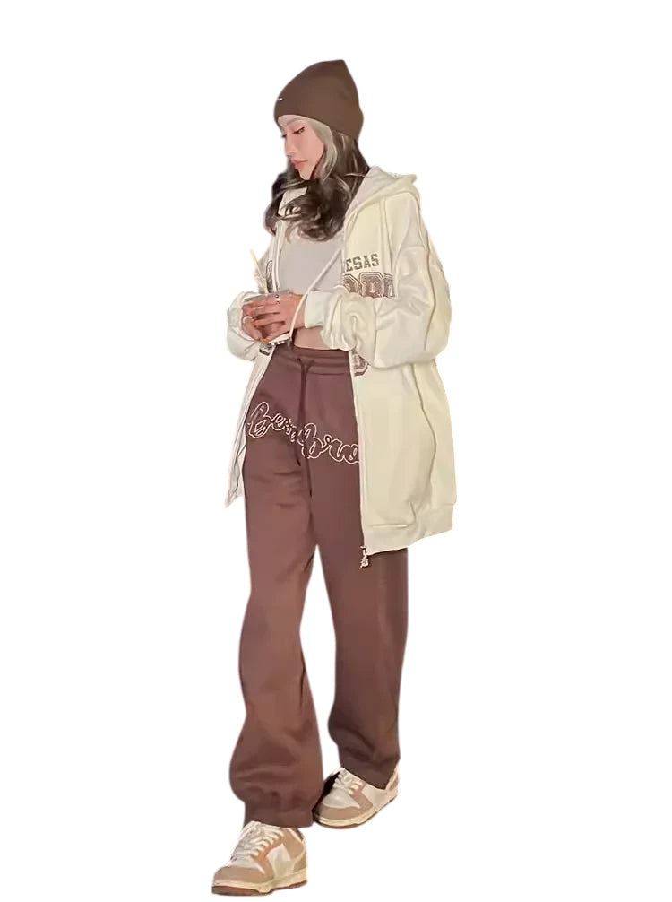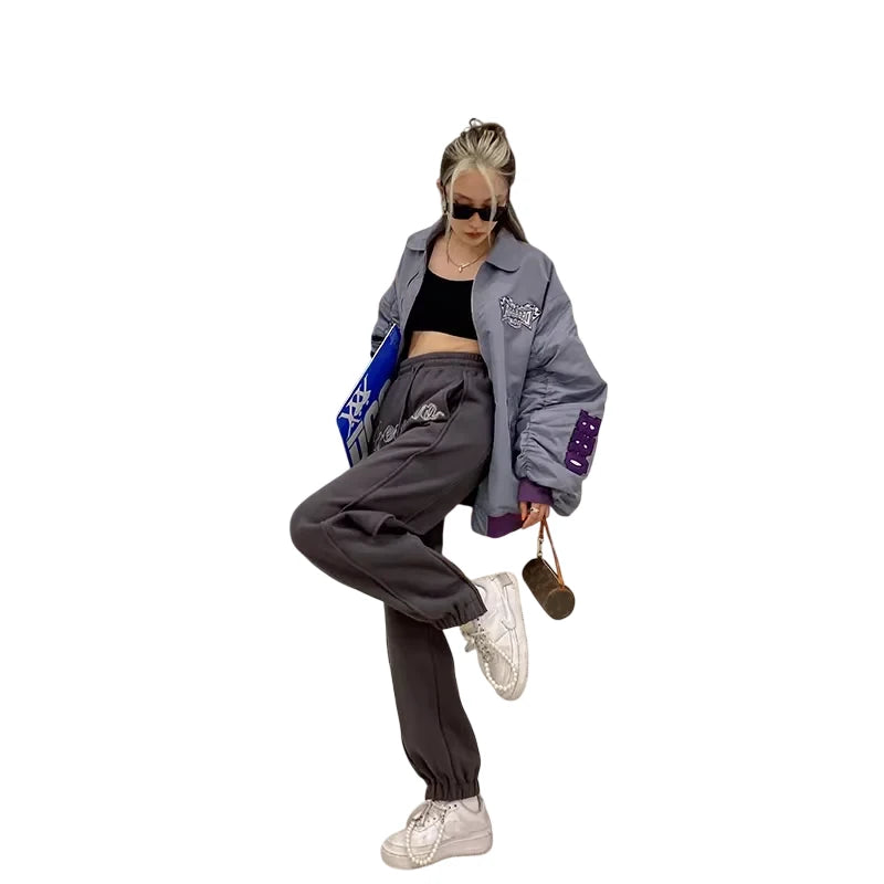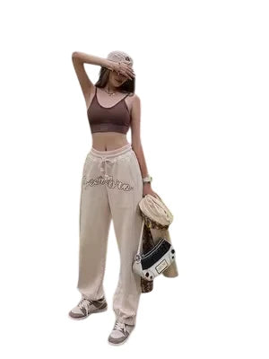 Stay warm and stylish with these women's fleece-lined sweatpants, designed for the winter season. Featuring a high-waisted, loose fit for maximum comfort, these thickened joggers come with a functional drawstring waistband and subtle embroidered detail on the upper leg. Perfect for casual streetwear looks, they pair effortlessly with tank tops, jackets, and sneakers for an easygoing yet fashionable outfit.