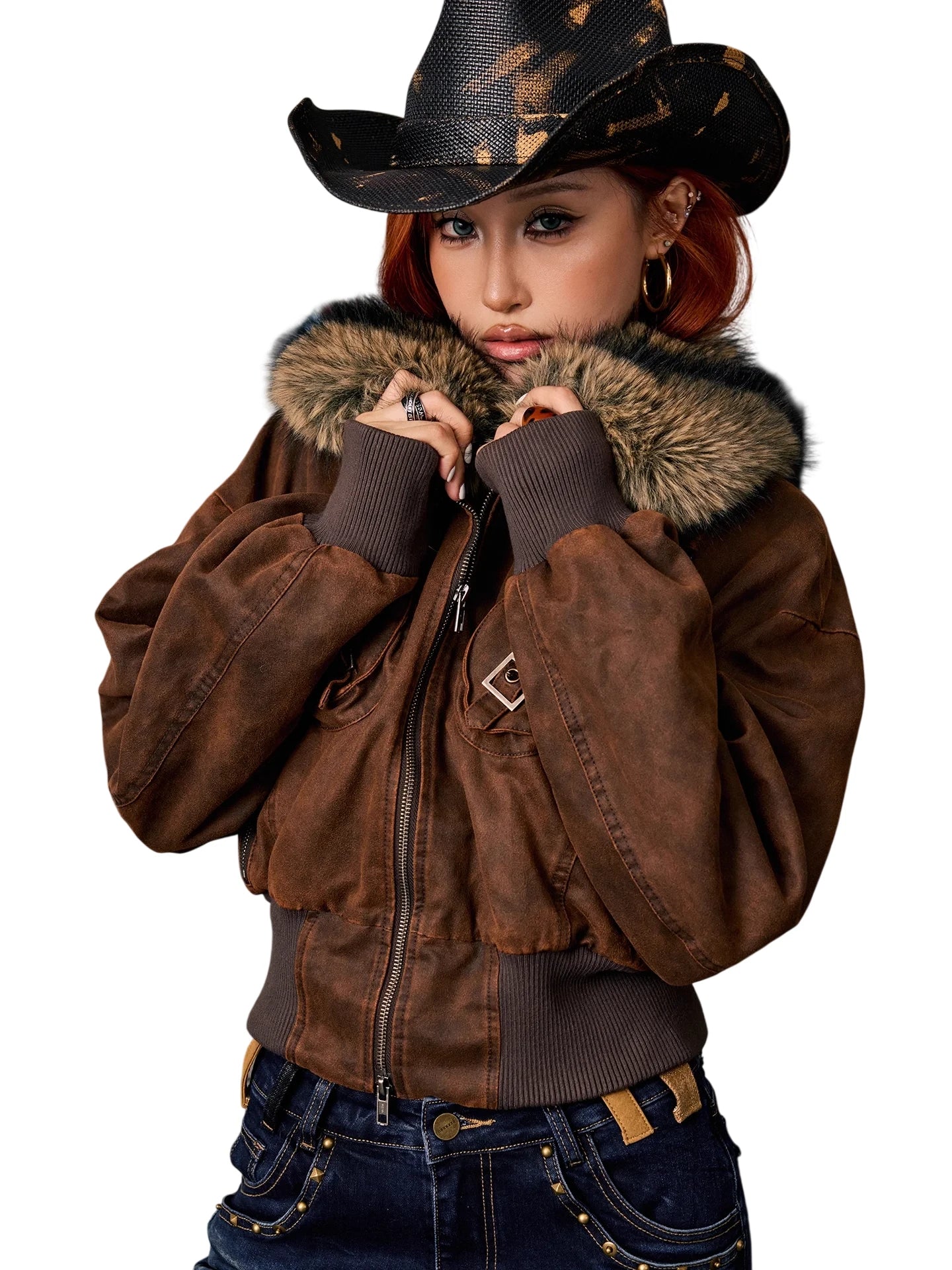 Embrace fall and winter in style with this washed short jacket designed for women. Featuring a detachable faux fur collar, the jacket combines practicality with a rugged yet fashionable look. Crafted in a rich brown suede-like fabric, it includes two chest flap pockets with buttons, ribbed cuffs for added structure, and a fitted silhouette ideal for layering.