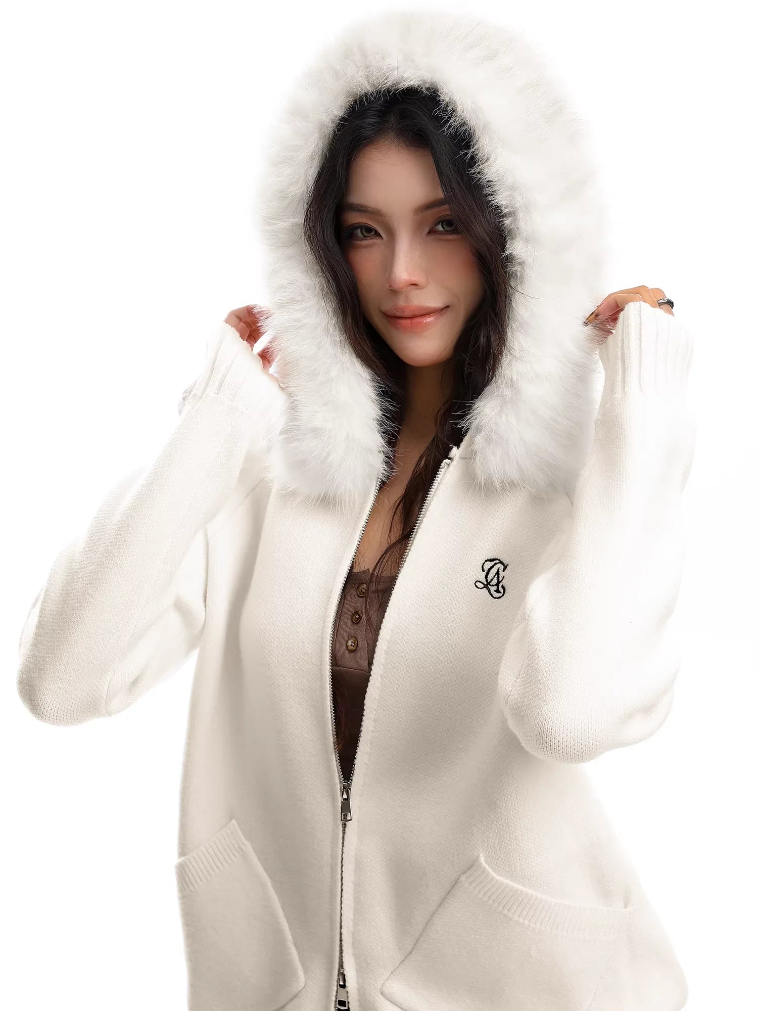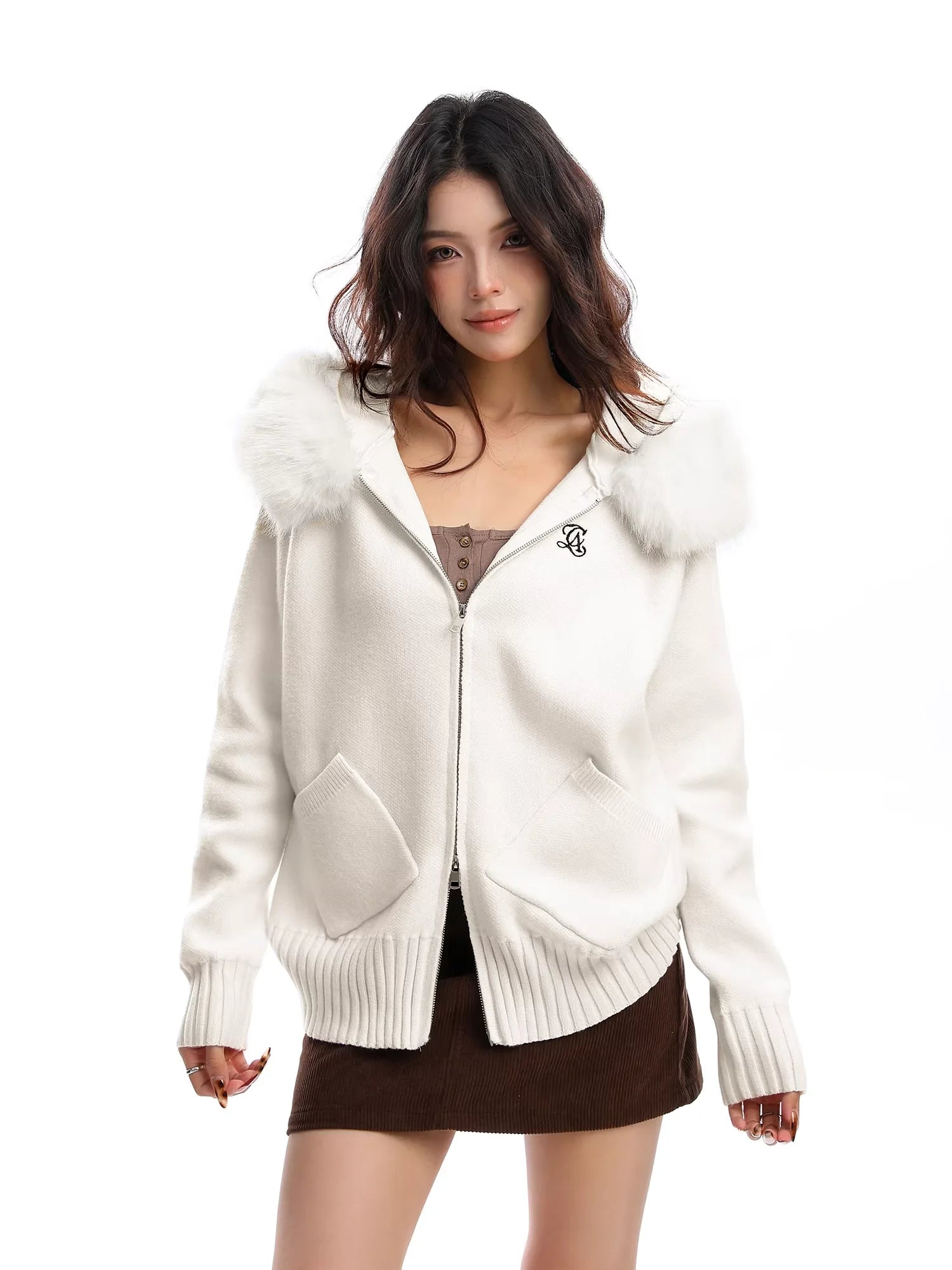 Stay cozy and stylish this autumn and winter with this women's white knit hooded sweater. Designed for comfort and warmth, it features a relaxed fit with ribbed cuffs and hem, two front patch pockets, and a soft zip-up front. The detachable faux fur collar adds a touch of elegance while allowing for versatile wear. A subtle embroidered logo on the chest adds a refined detail to this casual yet chic outerwear essential.