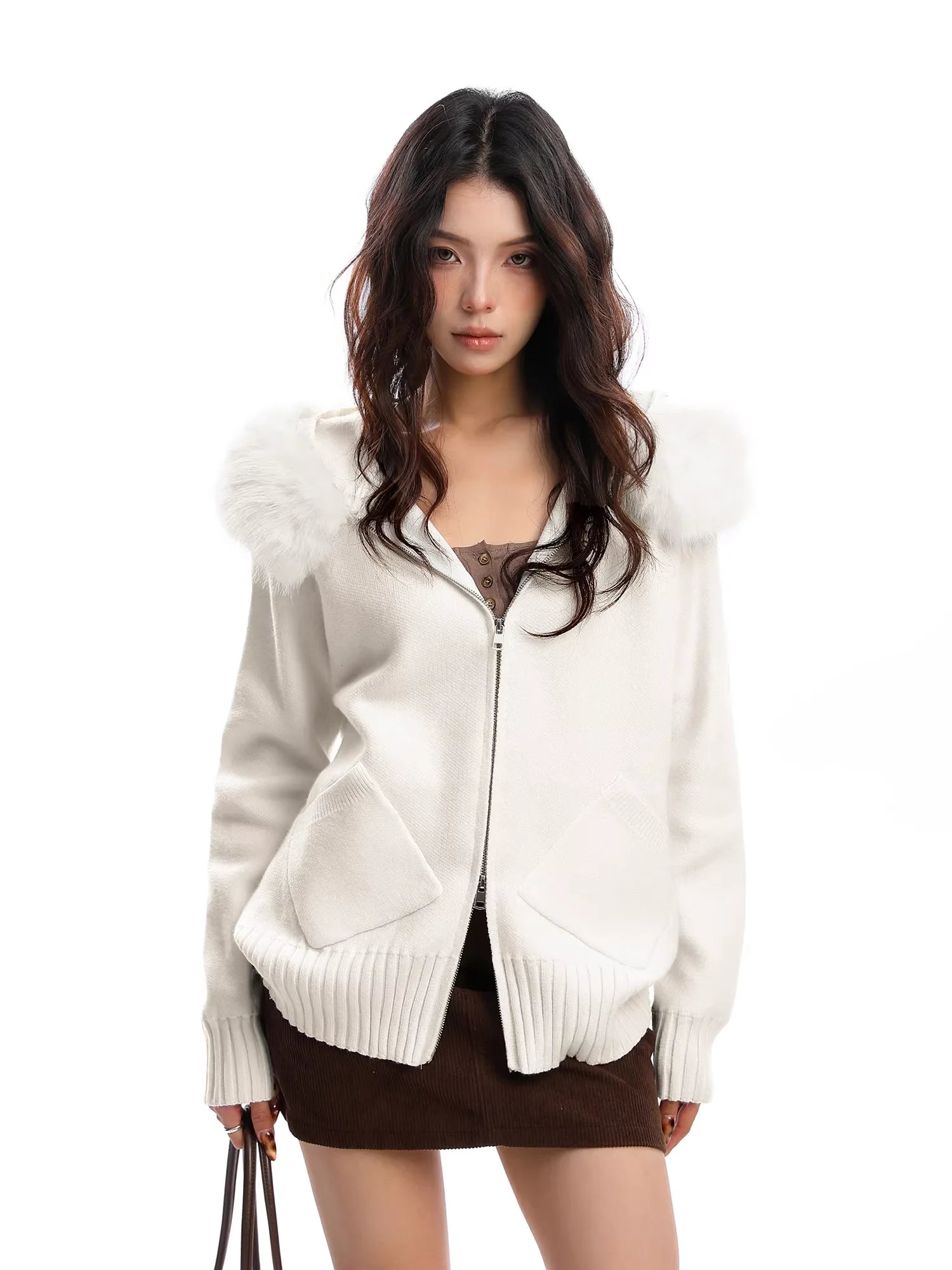 BIGGOLD STUDIO Women's White Knit Hooded Sweater with Detachable Faux Fur Collar