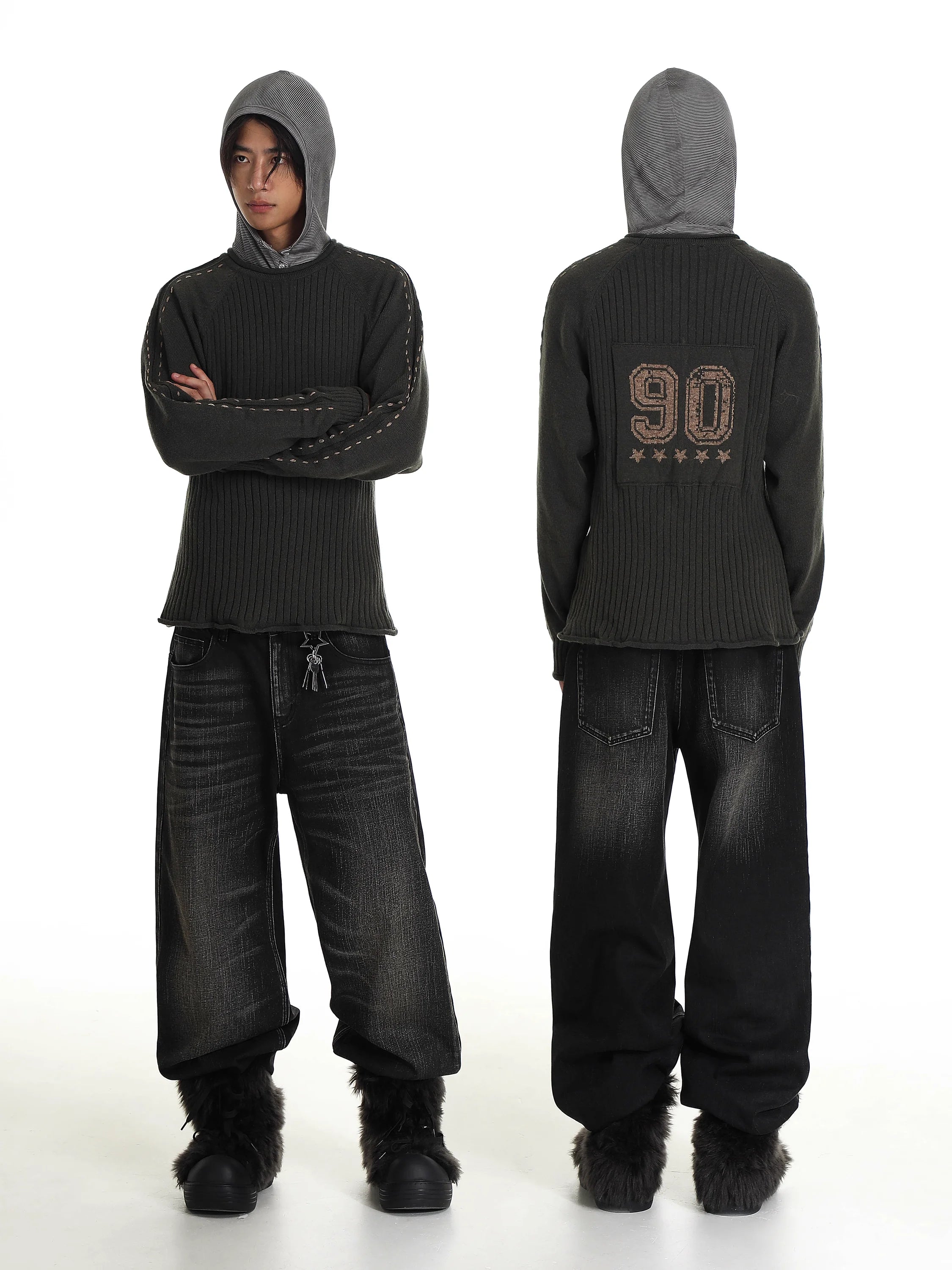 This unisex crew neck sweater features a ribbed knit texture and is available in three classic colors: burgundy, olive green, and navy blue. Each sleeve is adorned with an embroidered '90' patch and three stars near the upper arm, along with a contrasting dotted stitch detail running vertically. The design combines sporty aesthetics with cozy knitwear, making it a versatile piece for any casual wardrobe.
