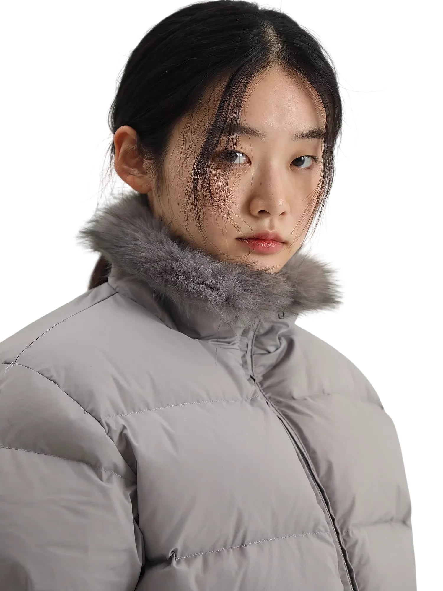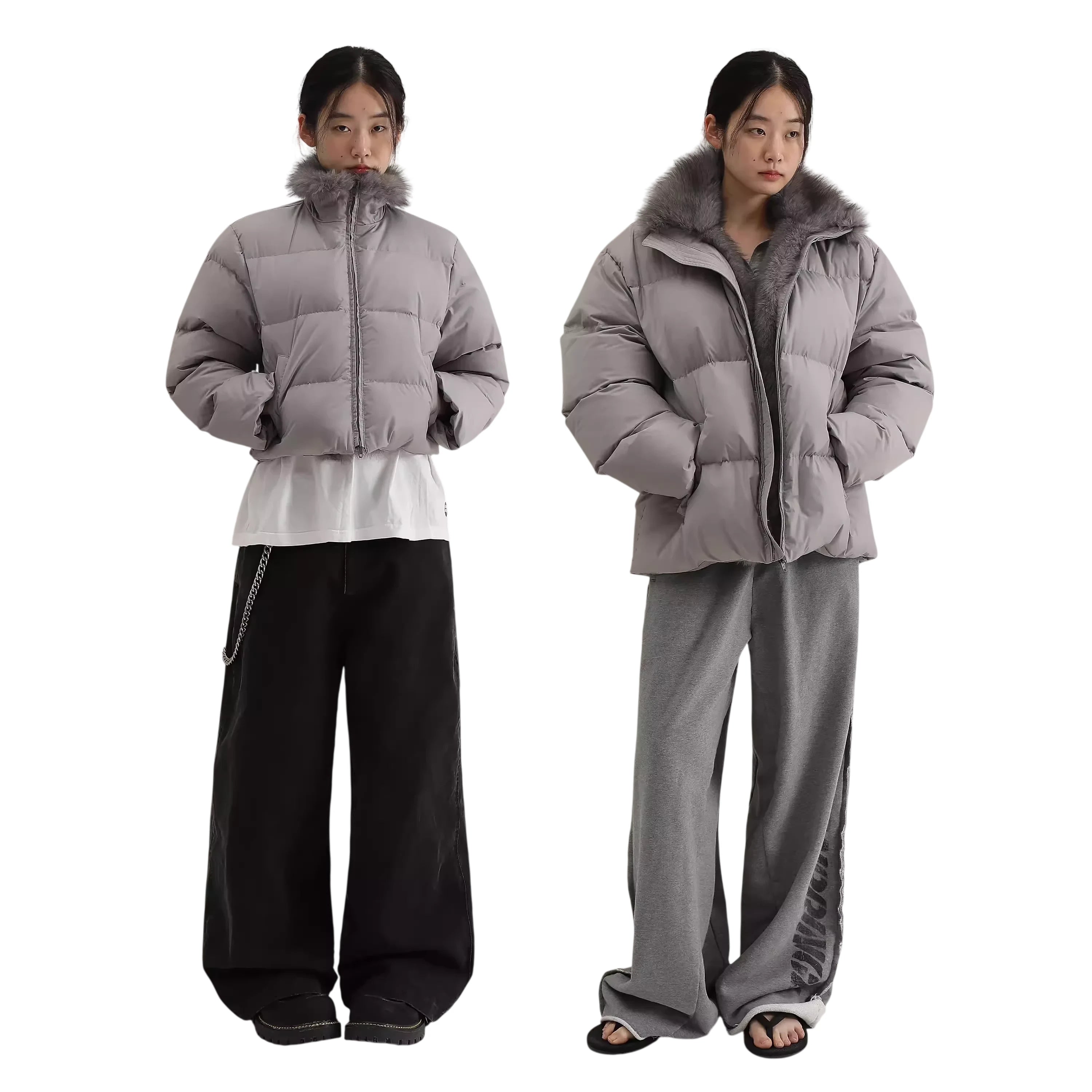 This women's down jacket features premium 90% white duck down filling for exceptional warmth and lightness. Designed with a stylish fur-trimmed high collar, it is available in both long and short versions, catering to different preferences and occasions.