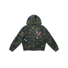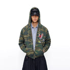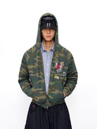This men's double-layer hoodie jacket blends 90s streetwear aesthetics with modern layering. The zip-up design features an all-over camouflage pattern combined with eclectic patchwork detailing on the chest, including a barcode, graphic badges, and a red-toned textured patch for added visual interest.