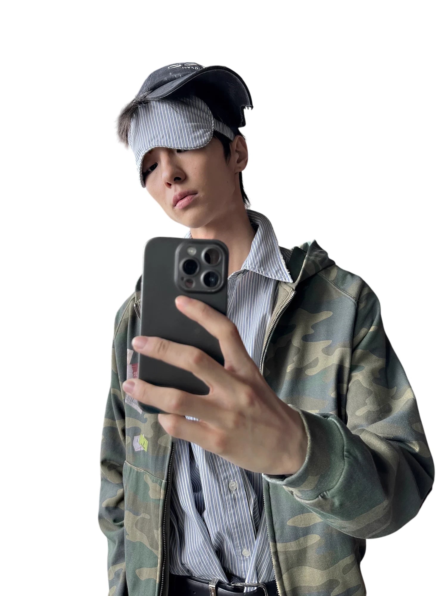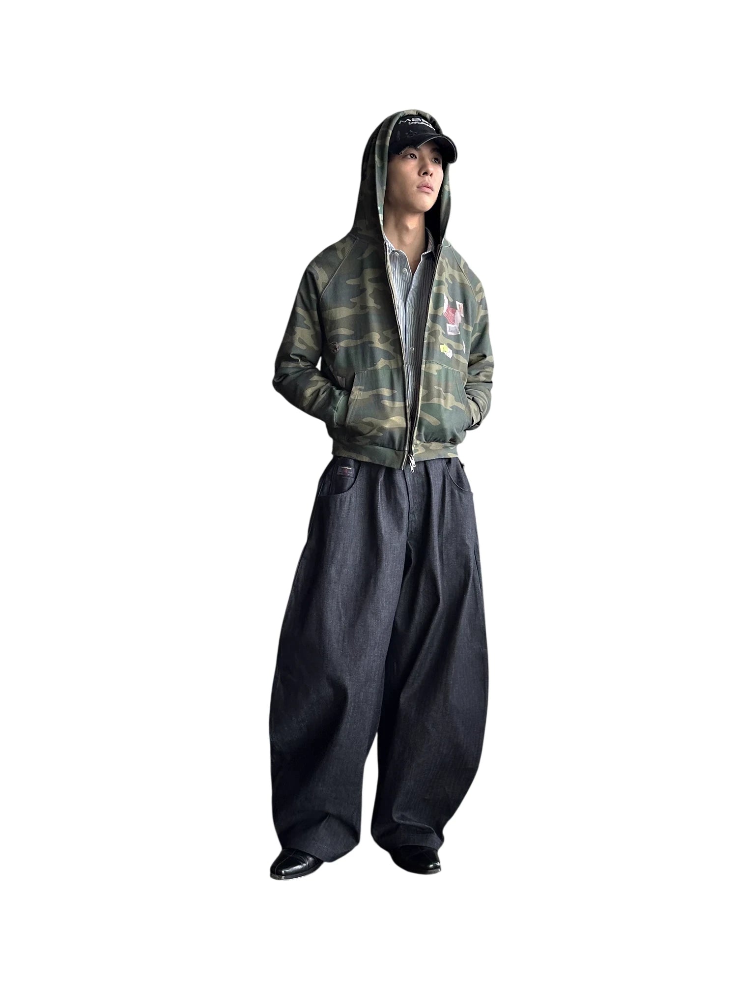 Layered over a vertically striped blue and white button-up shirt, the jacket offers a dynamic mix of textures and styles. Paired with loose-fit dark denim jeans and a distressed baseball cap, this look channels retro urban flair while maintaining a contemporary edge.