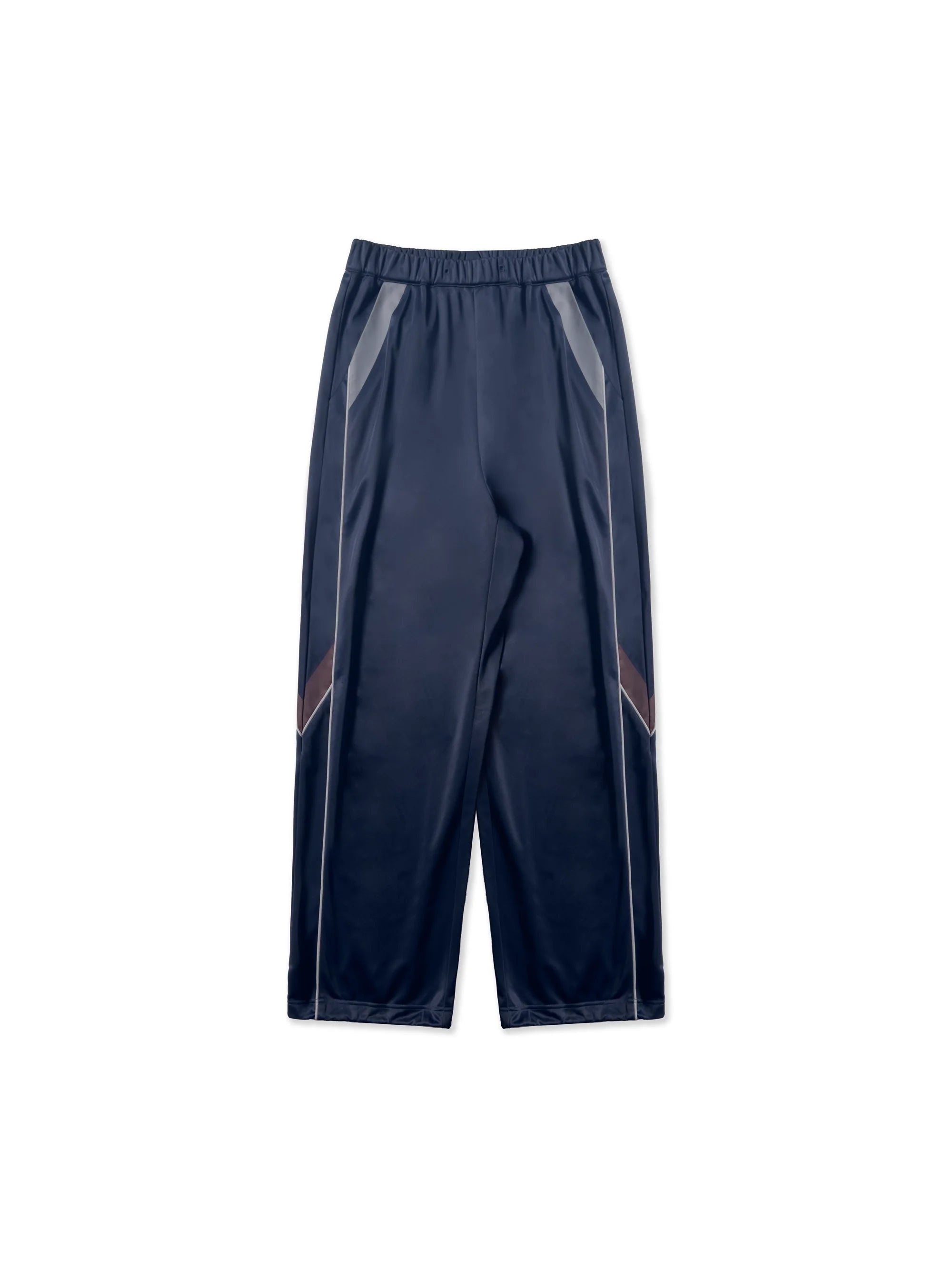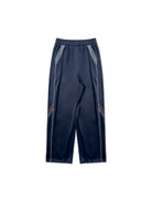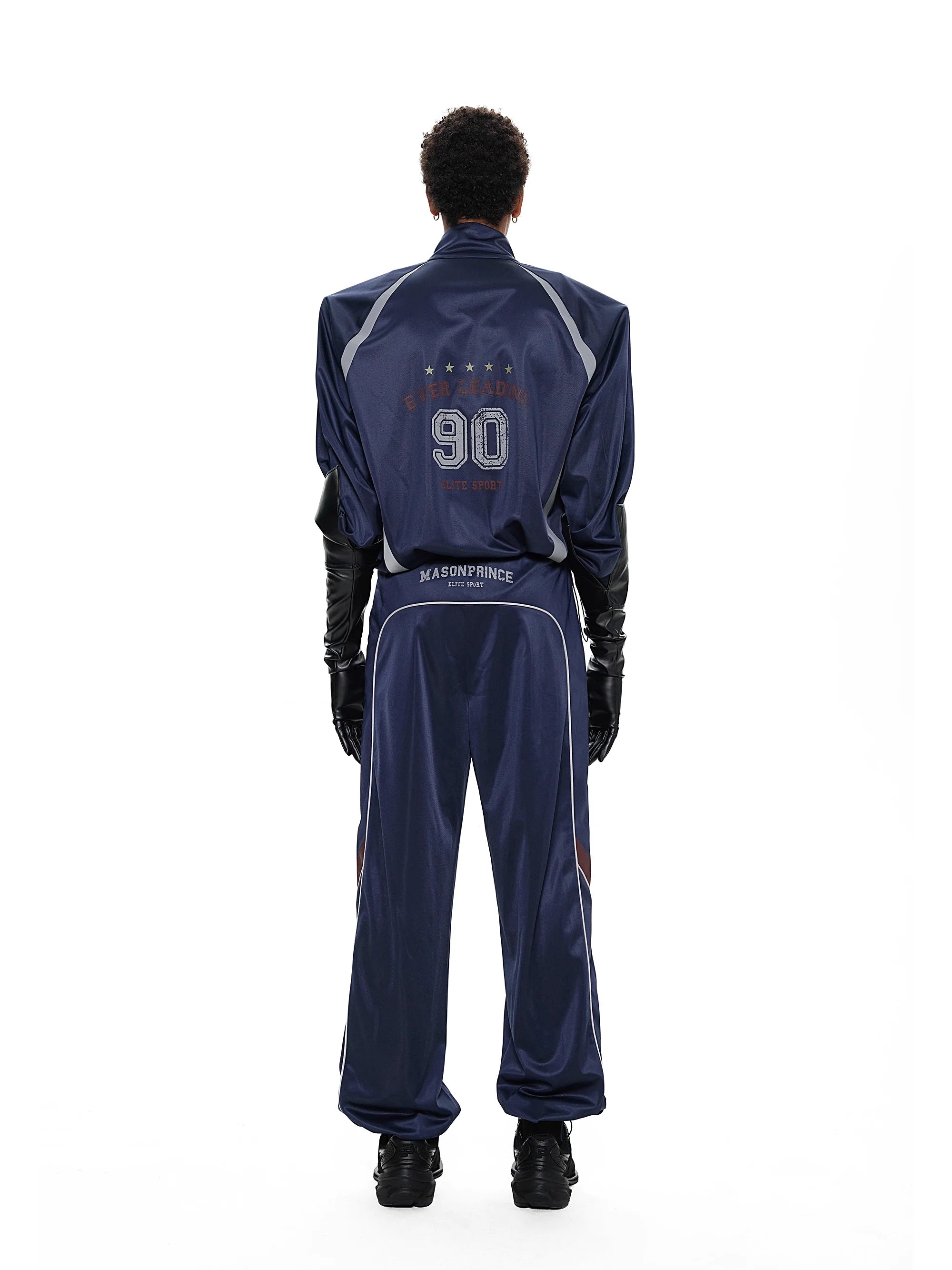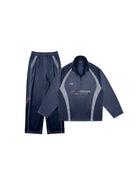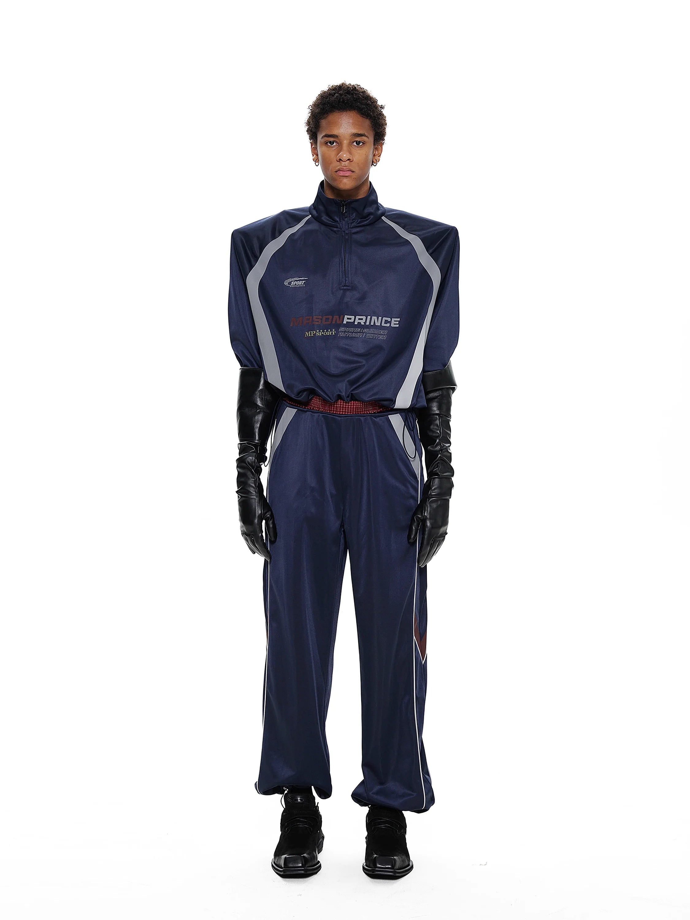 This men's tracksuit set channels a retro 90s vibe with its dynamic colorblock design and sporty silhouette. The ensemble includes a long-sleeve half-zip top with a mock neck and matching tapered pants, both in a sharp navy blue accented with light grey curved side panels. The top features front chest detailing and a clean zip closure, while the pants offer comfort with an elastic waistband and stylish piping along the legs, including a subtle maroon accent at the knees. Ideal for streetwear or casual athletic looks, this set combines nostalgia with modern appeal.