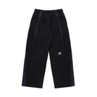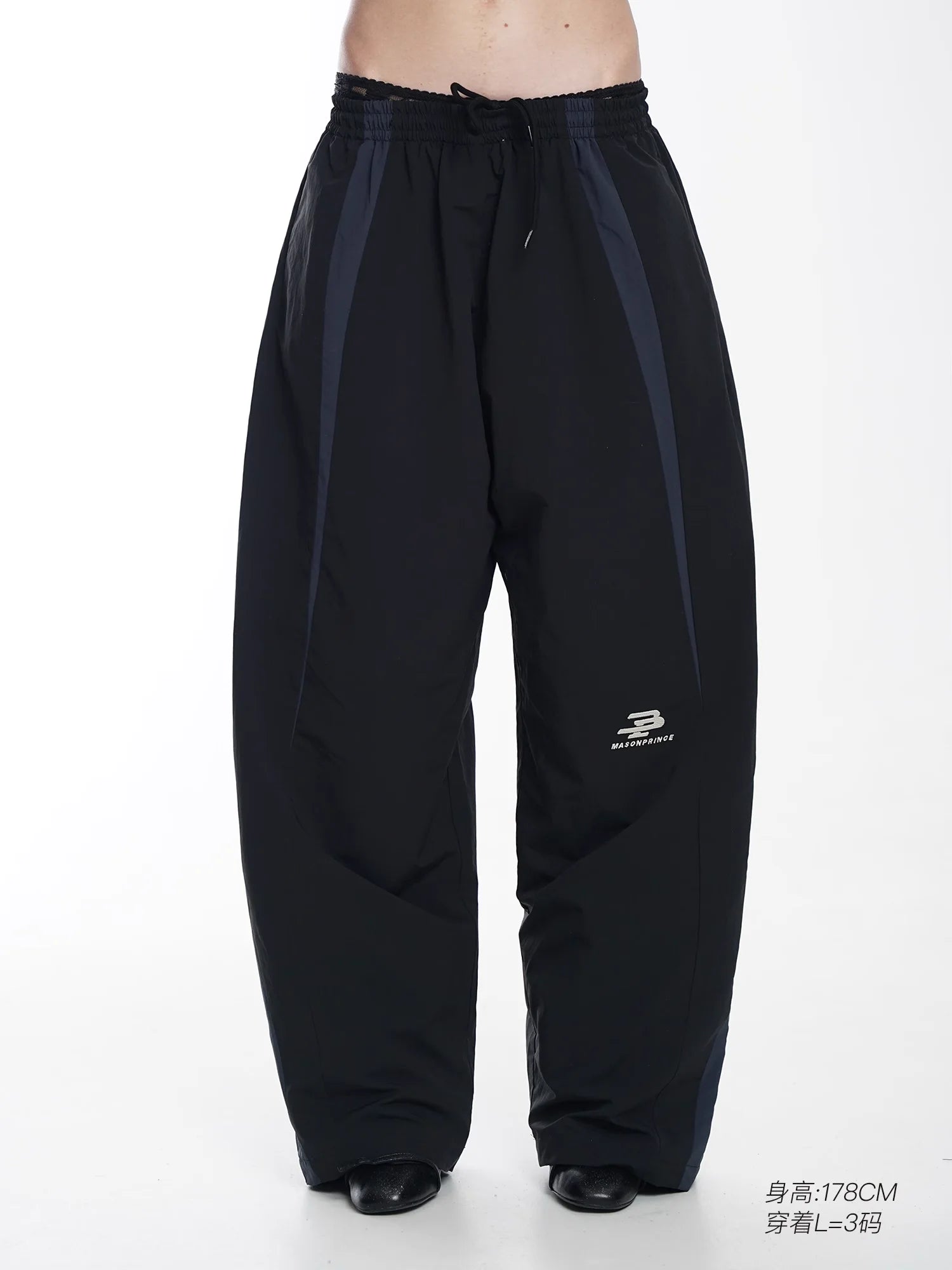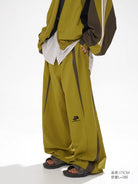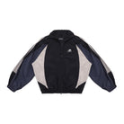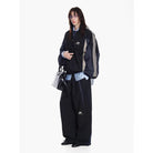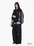This women's 90s-inspired retro patchwork tracksuit set features an oversized silhouette with a coach-style jacket and matching wide-leg pants. The black track jacket includes grey and white striped detailing on the sleeves and chest branding, layered over a casual blue button-down shirt. The coordinating pants mirror the jacket's sporty elements, creating a cohesive streetwear look. Finished with luxury-inspired accents, this ensemble effortlessly merges casual athletic wear with contemporary fashion style.