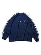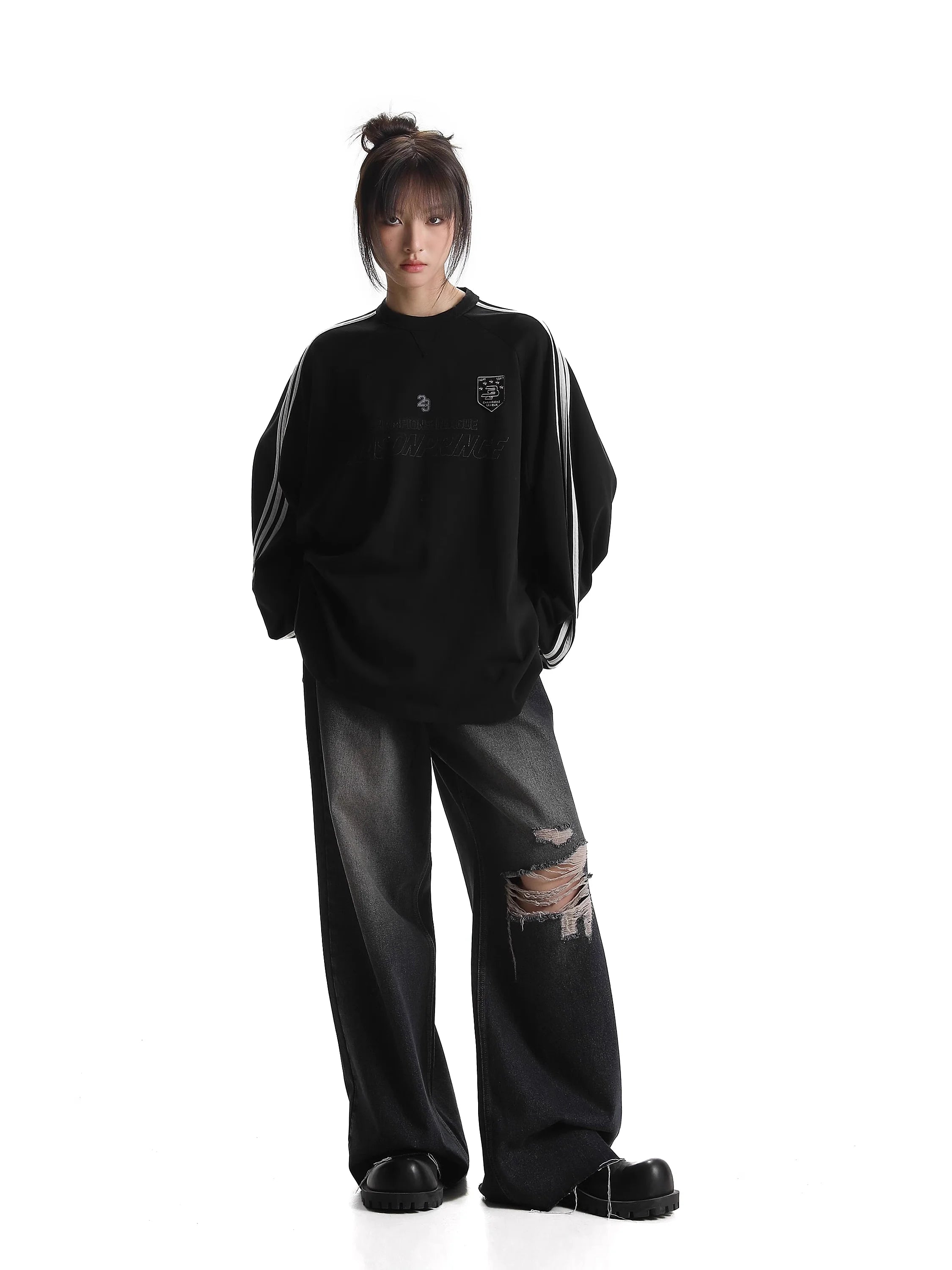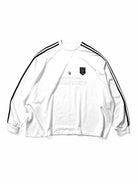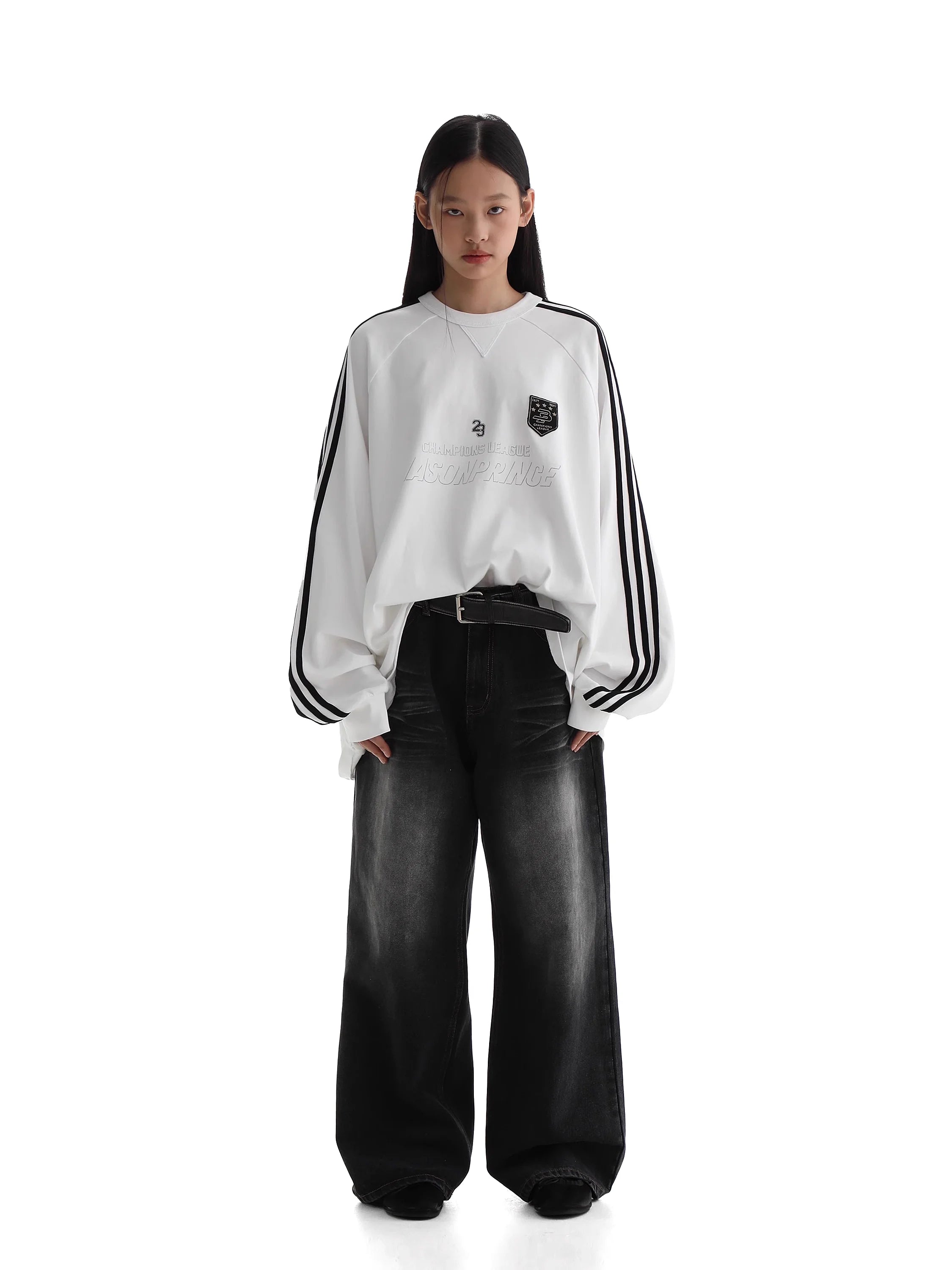 Elevate your casual wardrobe with this 90s-inspired raglan sleeve long sleeve T-shirt, designed for men. Featuring a relaxed, oversized fit and sporty crew neck, this top combines comfort with street-style appeal. The white base is complemented by contrasting black stripes down the sleeves, while embroidery and patch details on the chest add a unique flair. With dropped shoulders and gathered cuffs, this piece offers a bold yet effortless look ideal for everyday wear.