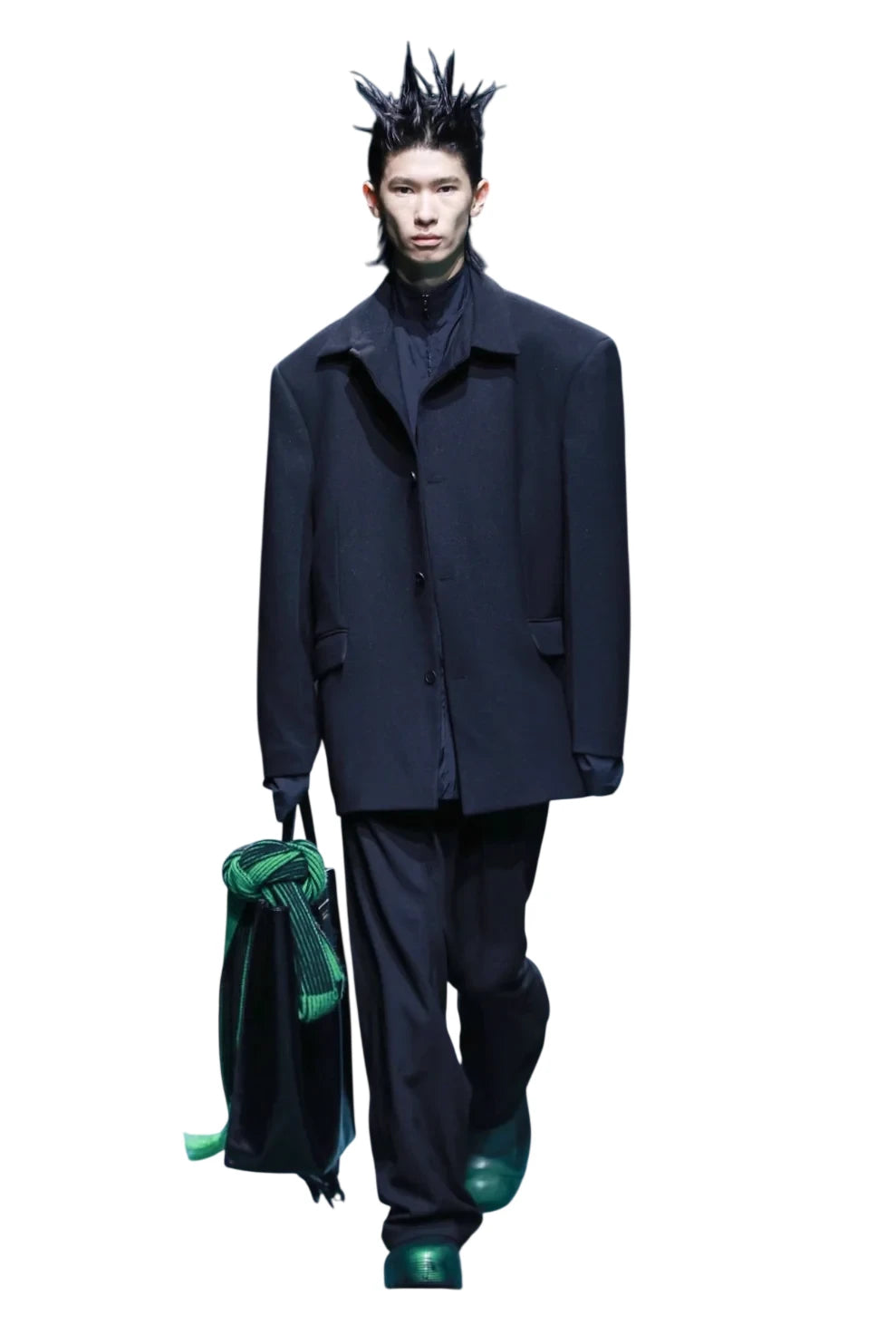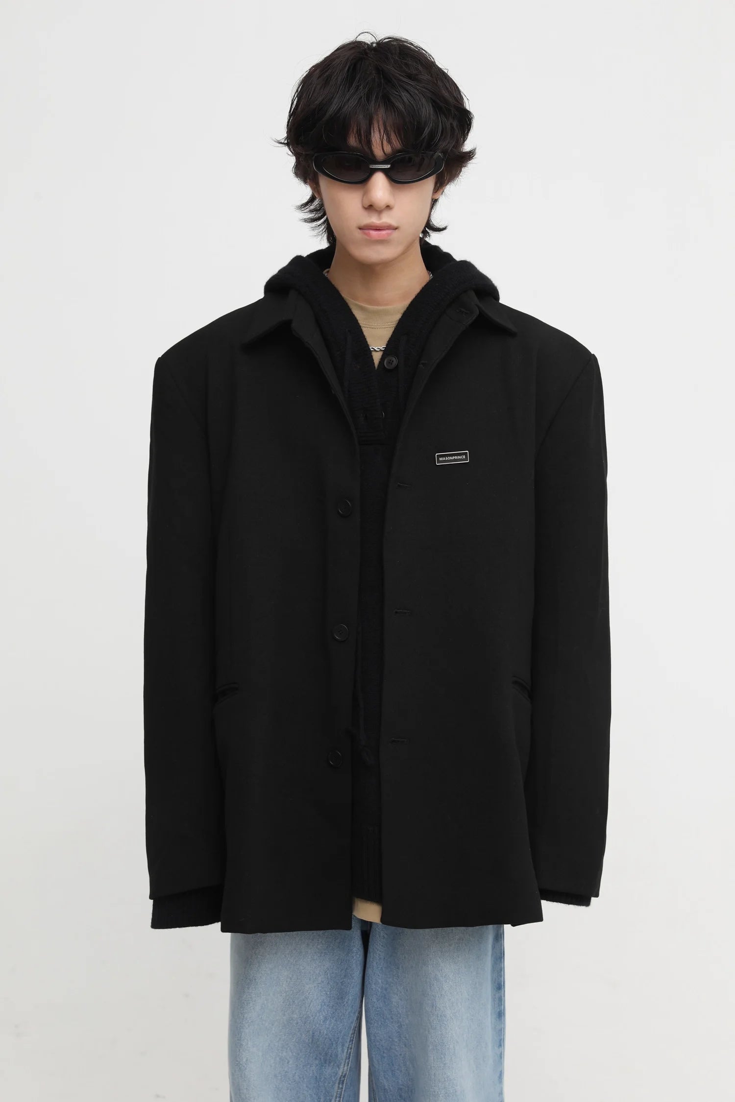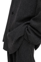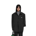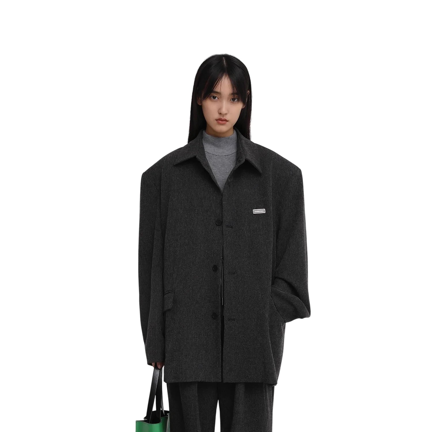 This women's oversized suit jacket features a retro-inspired Zhongshan collar design, blending classic tailoring with modern casual style. Crafted in a dark gray tone, the jacket showcases a structured yet relaxed silhouette with a button-up front and subtle flap detailing near the pockets. Ideal for layering, it pairs effortlessly with coordinating trousers and a turtleneck for a polished, contemporary look.